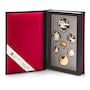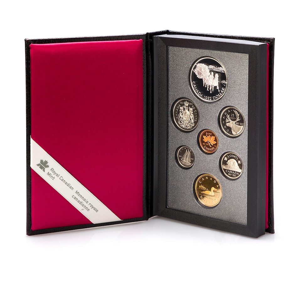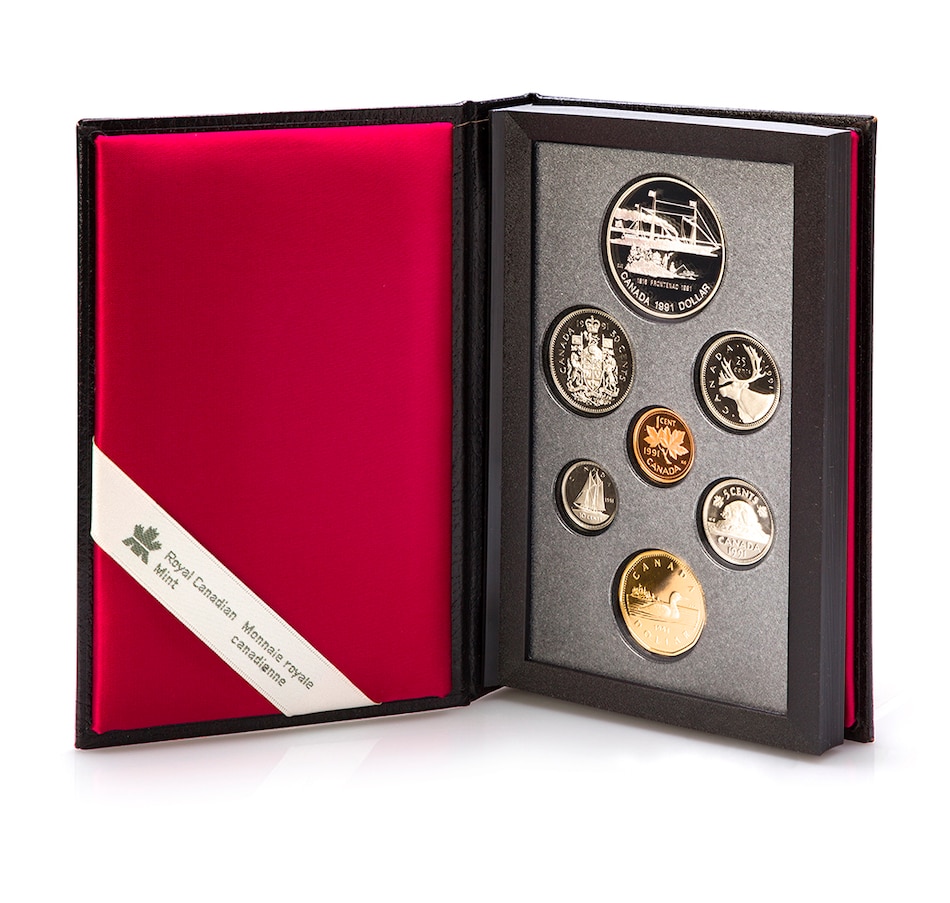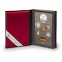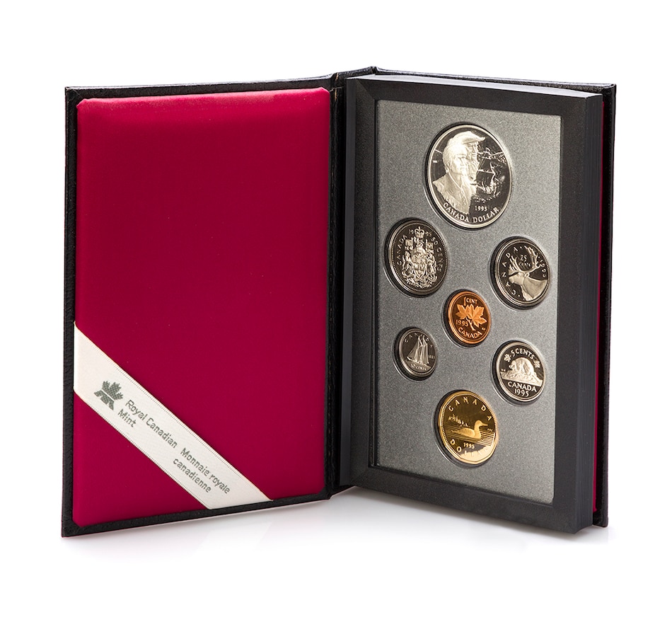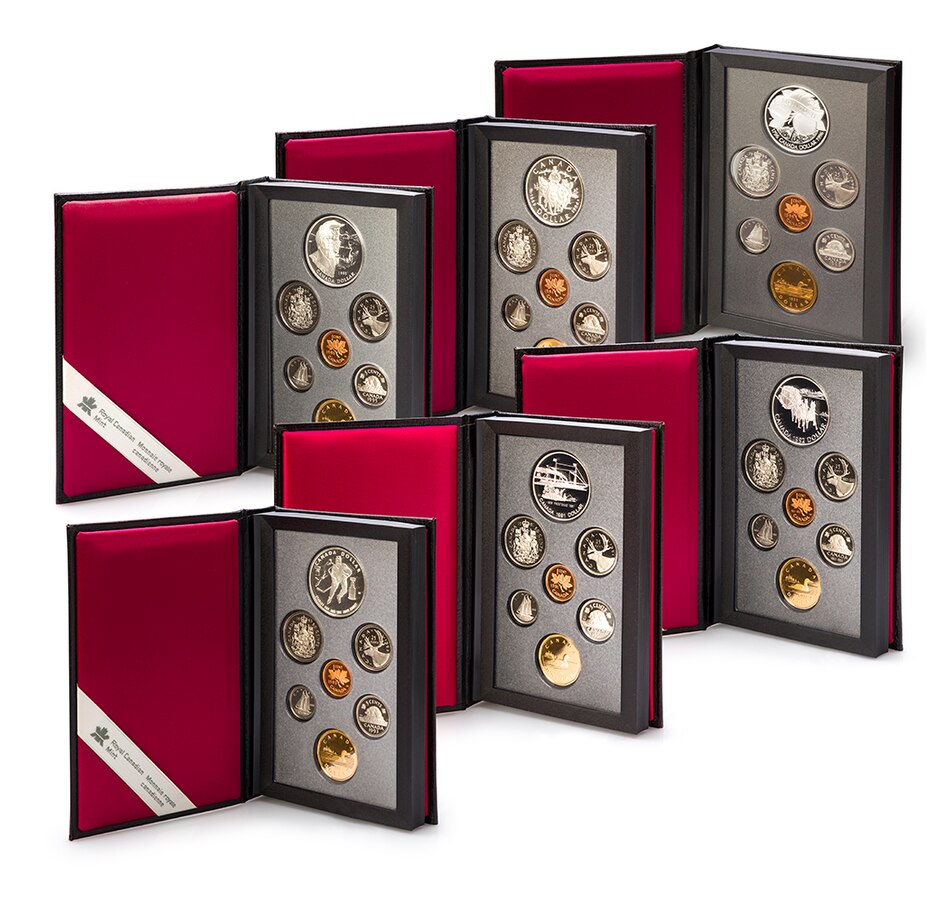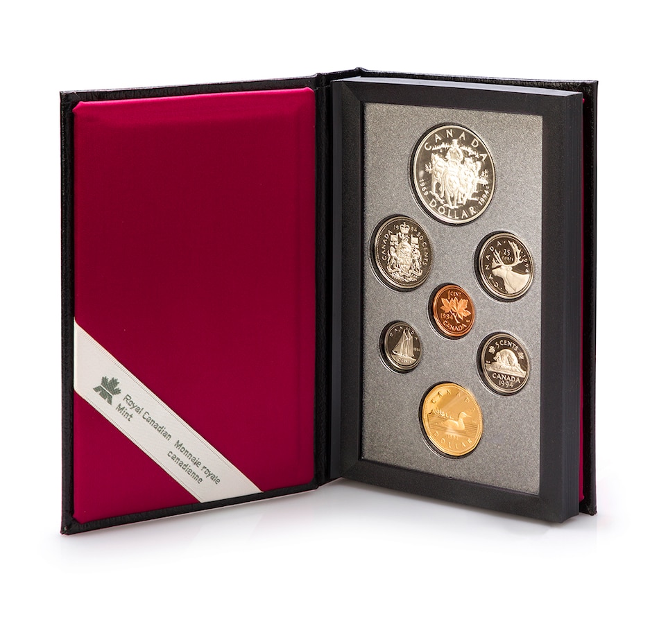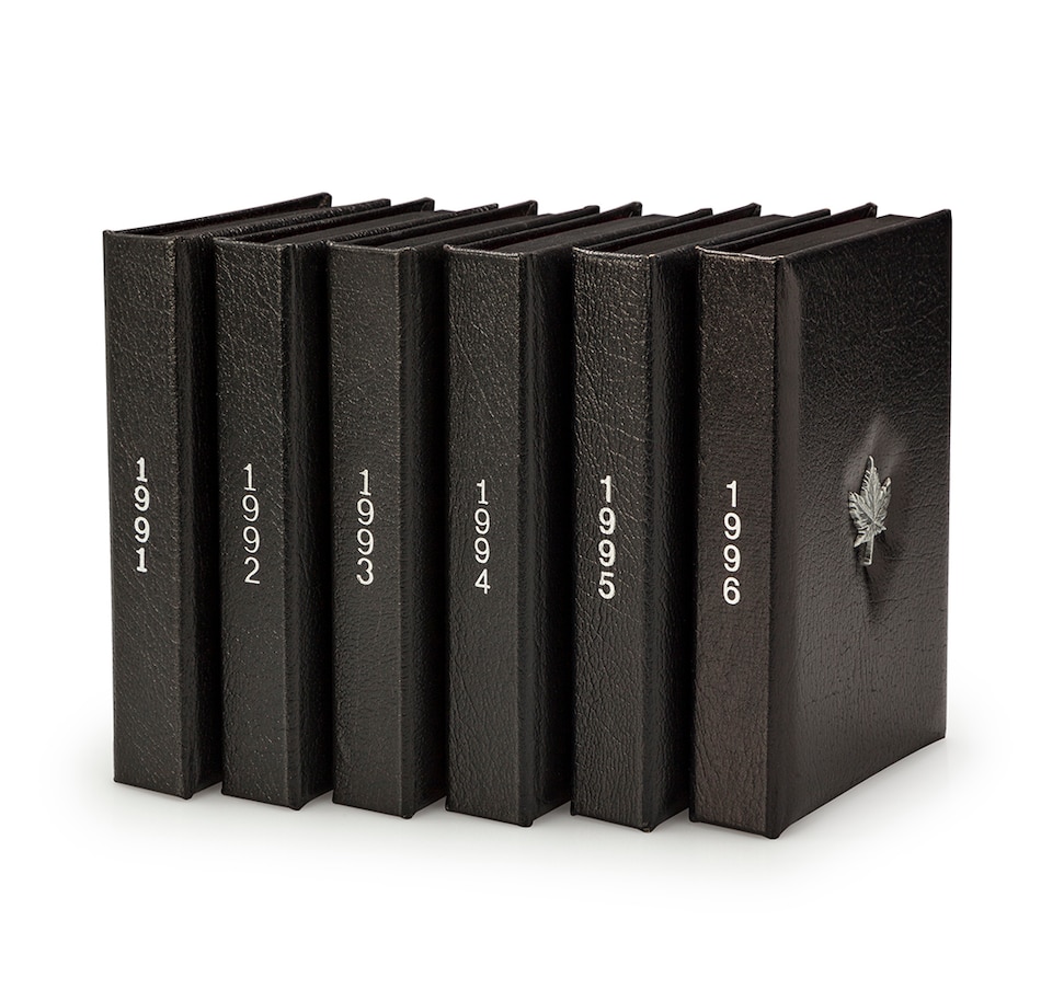 The coins from each year are presented in the original genuine black leather case of issue. The spine of each set is embossed with the year of issue, creating an attractive shelf display. The sets include both a loon dollar and a special commemorative dollar coin struck in silver, presented in a two-sided book-format display case. The commemorative silver dollars in each set present a glimpse of Canadian history, including important people, places and events that encapsulate our great country. The 1996 set has five coins that are struck in sterling silver (all of the coins other than the cent and loon dollar).