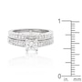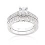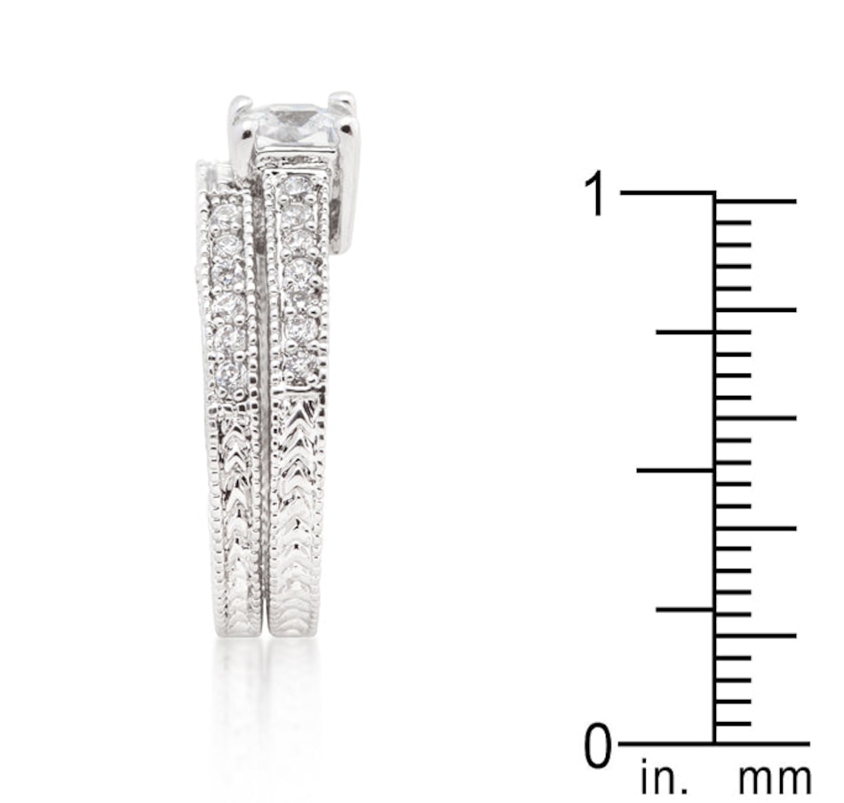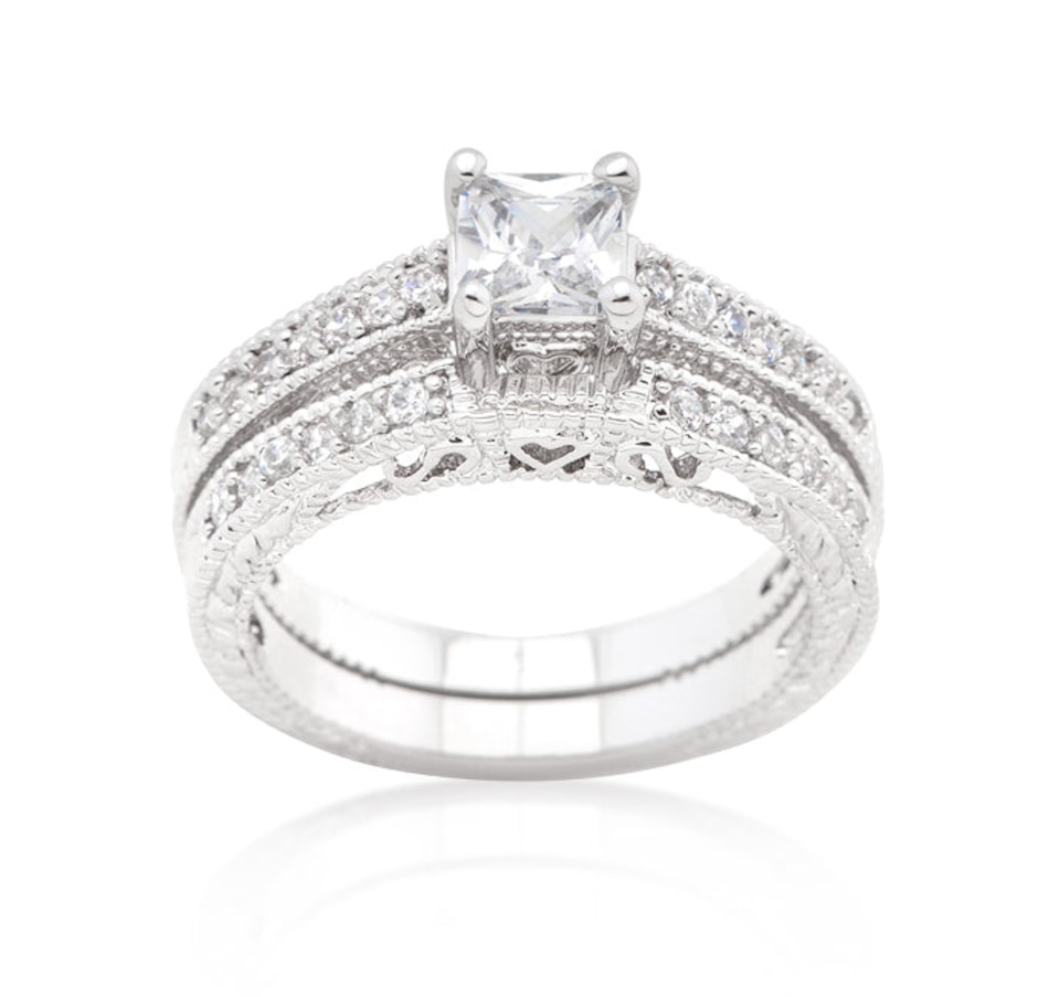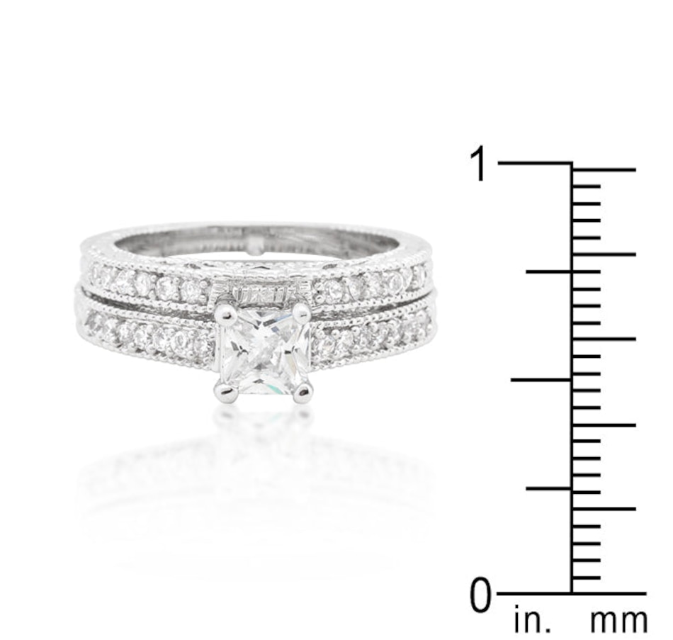 Delicately drawn designs surround this set's princess cut stone and round cut accents. Our genuine finish is achieved using an electroplating process that coats the item with heavy layers of a close cousin to platinum which gives our jewelry a platinum luster.