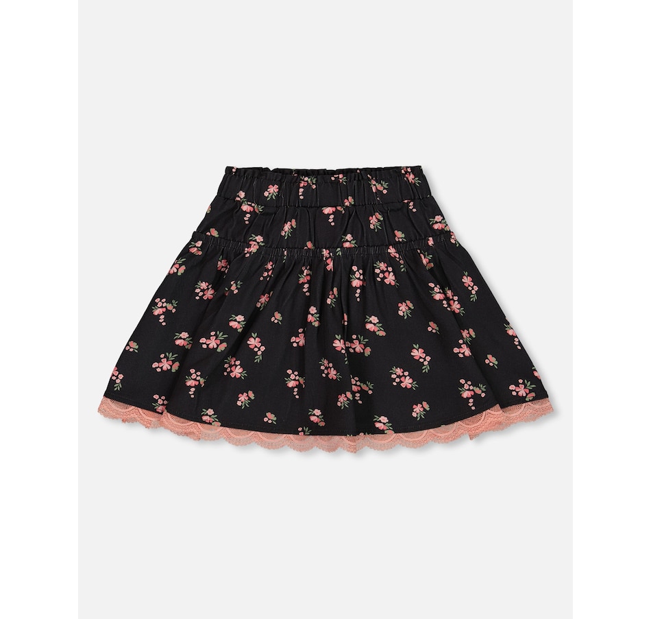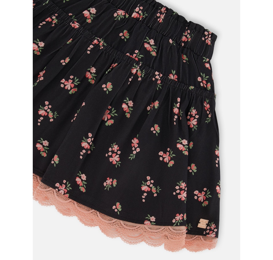Our Printed Flowers Flare Viscose Skirt Black is made for twirling! In soft, flowy fabric, this mini skirt features a flared silhouette with a stretch elastic waistband and scalloped lace trim at the hem. For a coordinated look, team it with a matching allover print top!