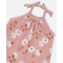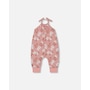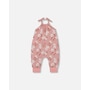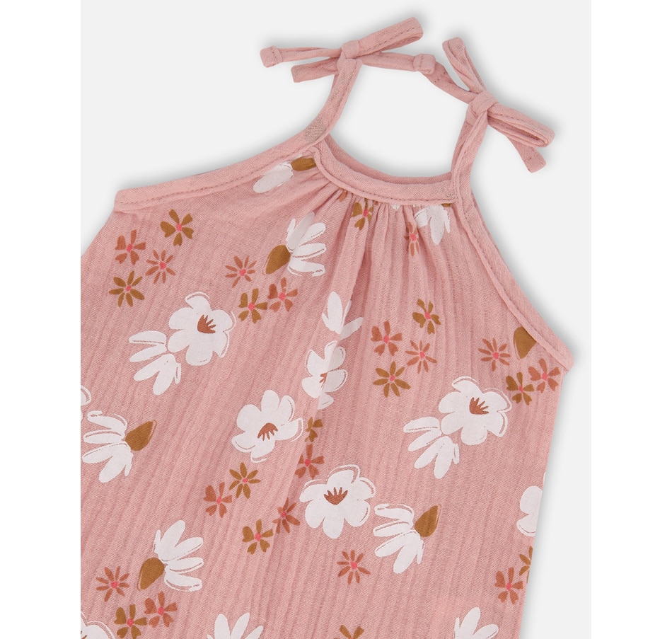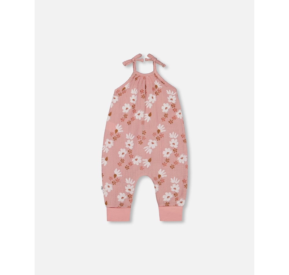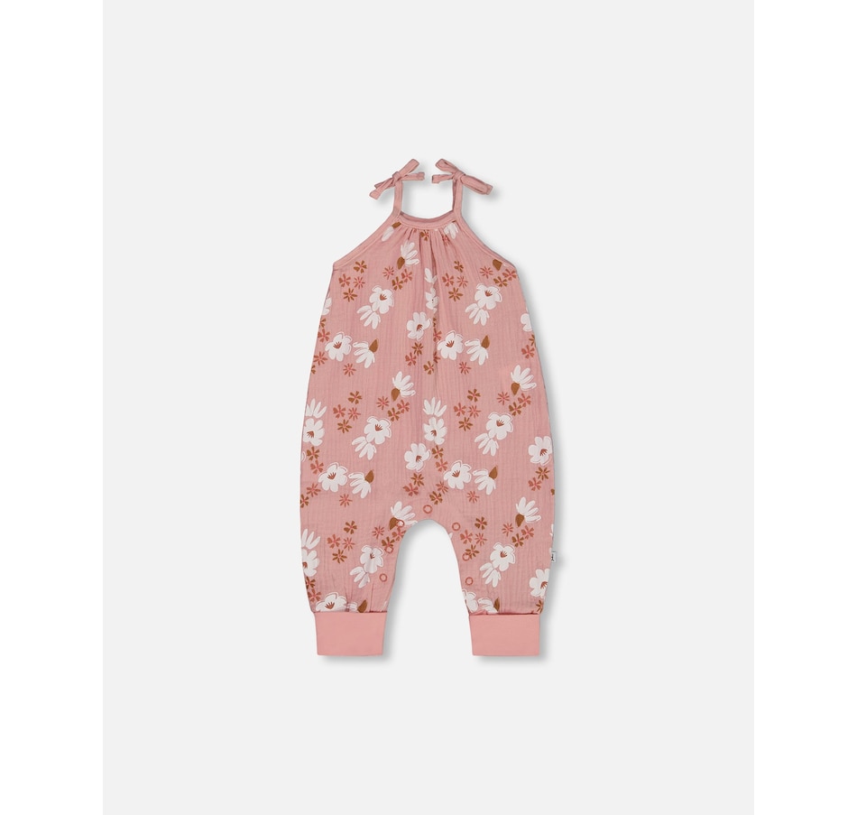 With bold flowers and string ties, our Printed Muslin Tie Strap Jumpsuit Pink and White Flowers is perfect for any warm weather day. This adorable one-piece features slender straps that tie into bows on each shoulder, snap legs, solid folded cuffs, and a pretty allover floral print.