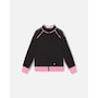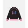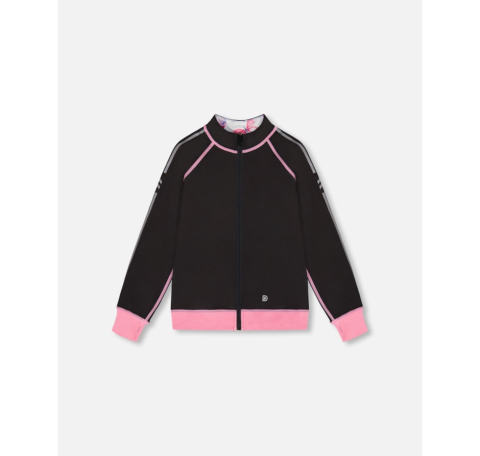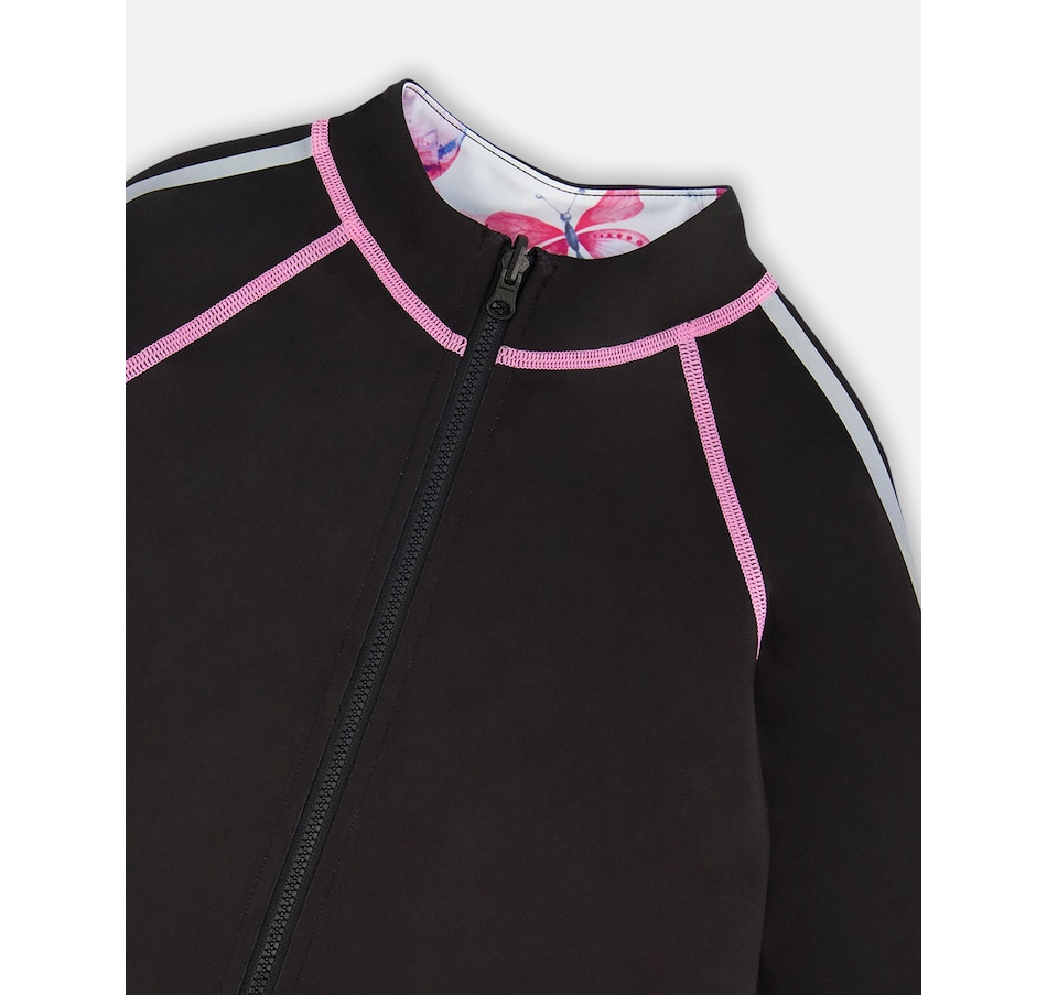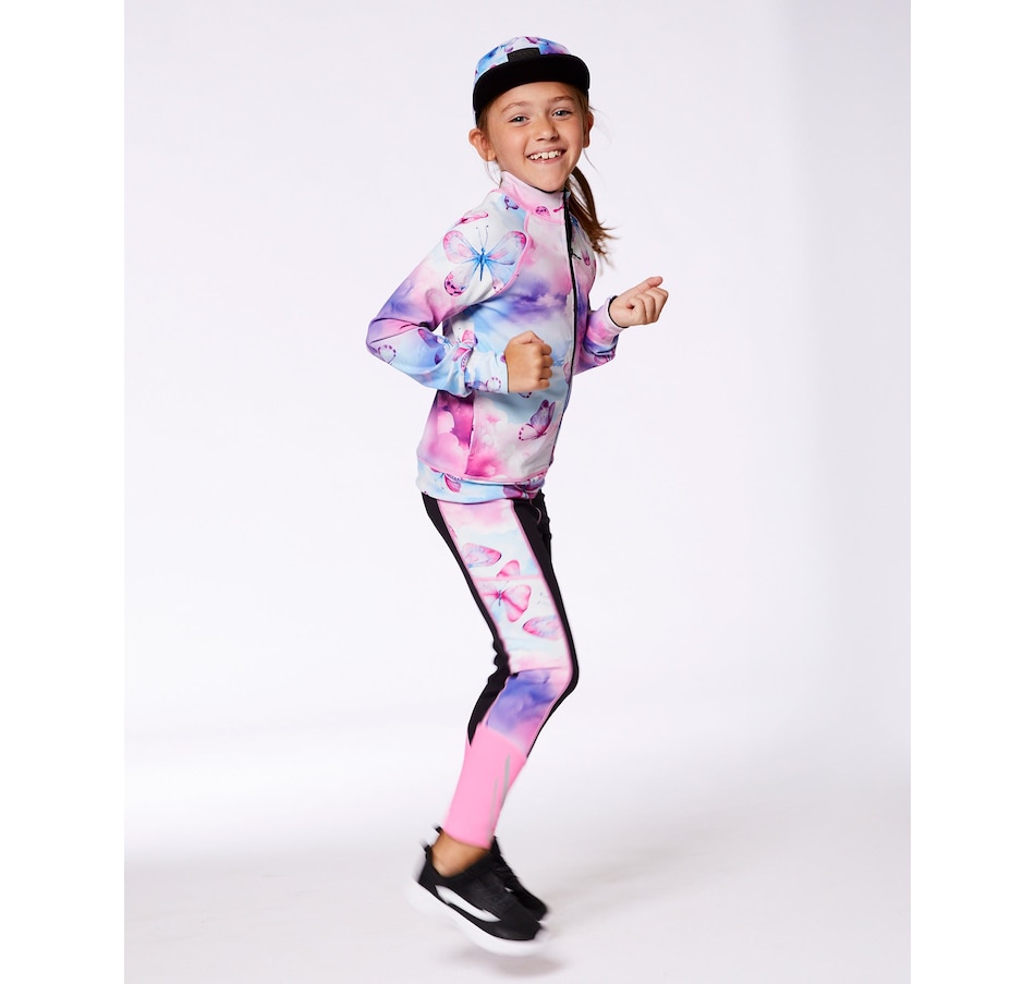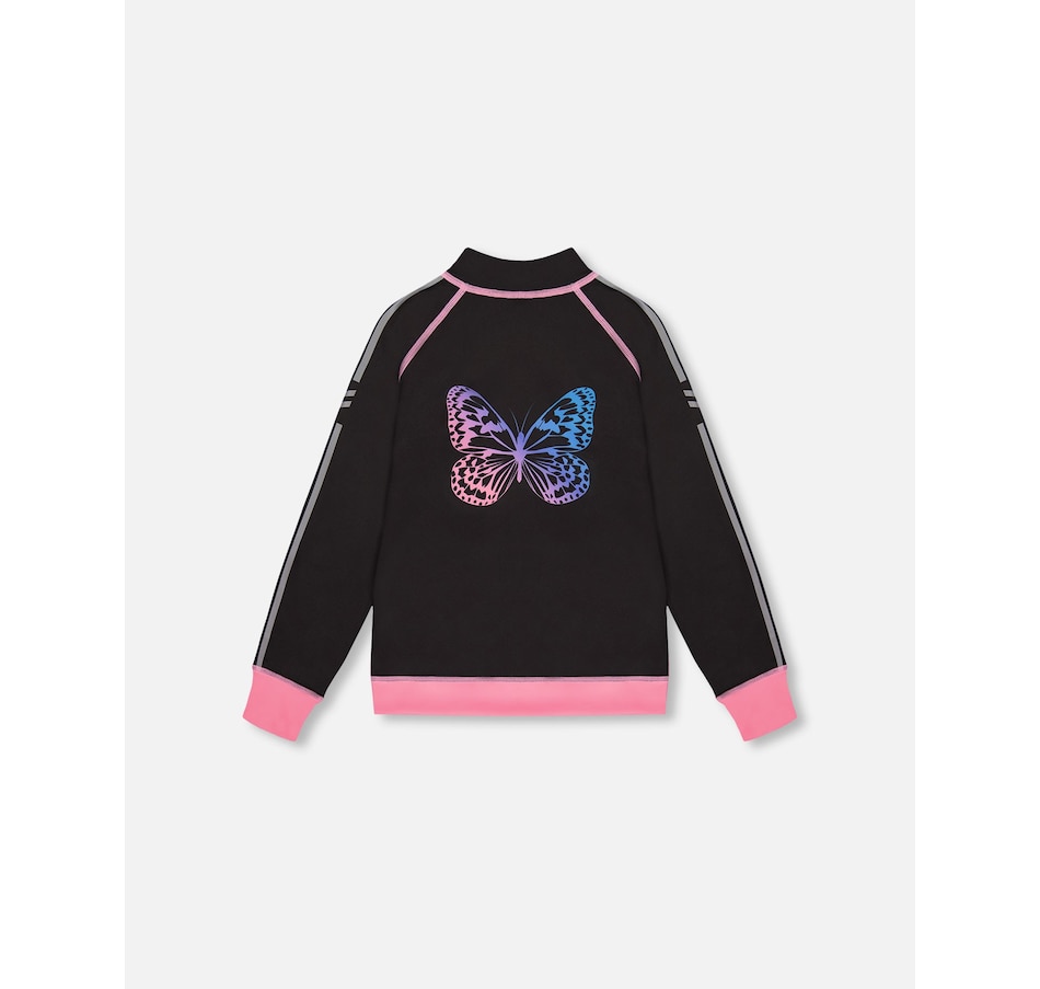 Our Printed Reversible Full Zip Athletic Cardigan Pink, Blue and Butterflies offers two completely different looks in one design! In recycled fabric with long raglan sleeves and a zip front closure, this jacket coordinates perfectly with every top and bottom in our Athletic collection. One side features a bold allover print, while the other side offers a solid look with sleeve stripes and a multicolored butterfly on the back.