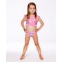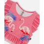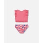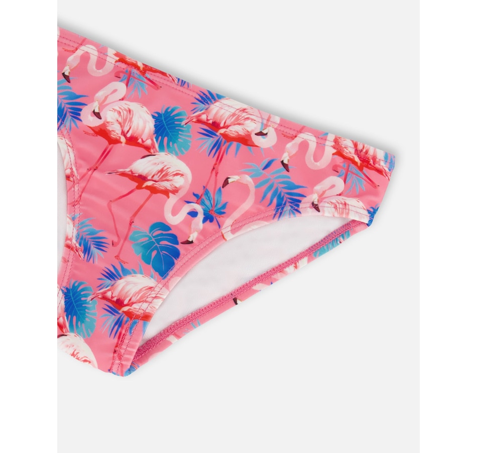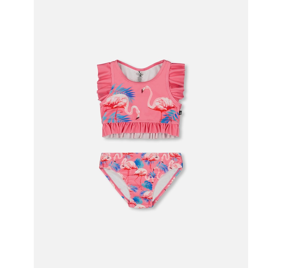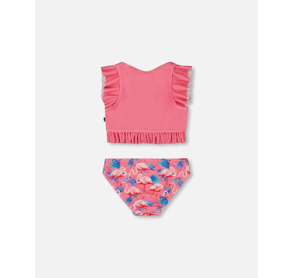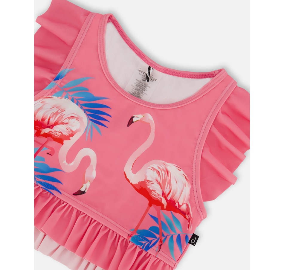 Our Printed Two-Piece Swimsuit with Frills Candy Pink and Pink Flamingo offers sun protection and sweet style for beach outings and pool days! This swimsuit is made from recycled fabric that offers UPF 50 UV sun protection. It features a flutter sleeve crop top with a round neckline, ruffled hem, and a matching flamingo print bikini bottom that gives it a playful, tropical look.