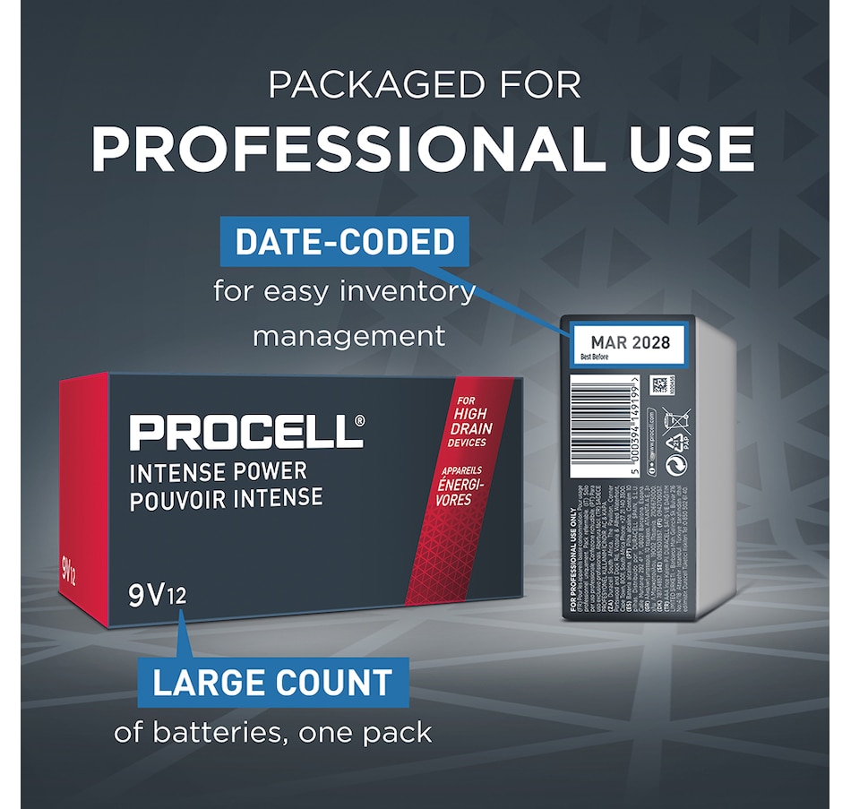 • Procell Alkaline Intense Power 9V, 1.5V (pack of 12)