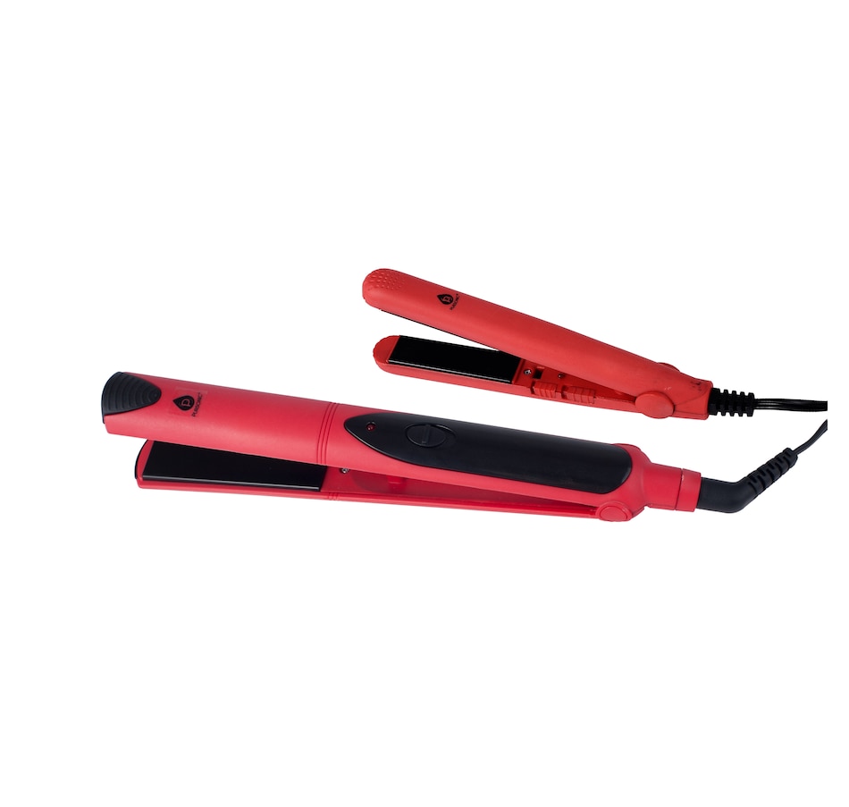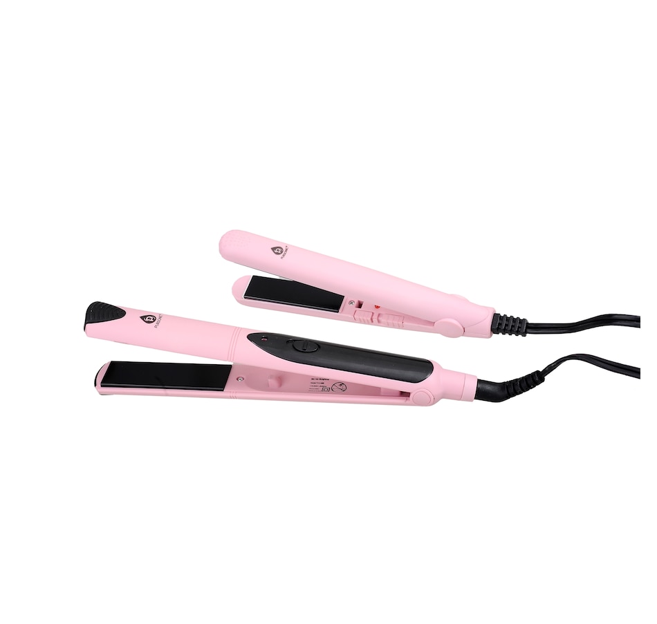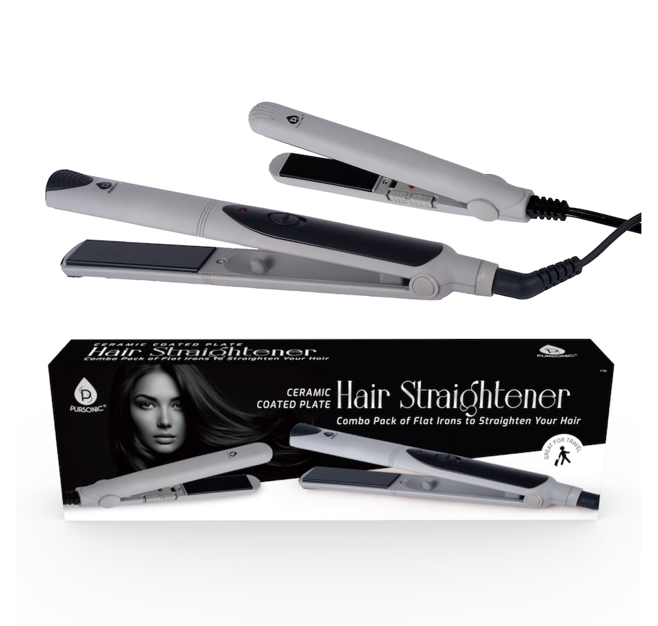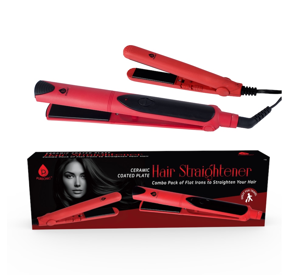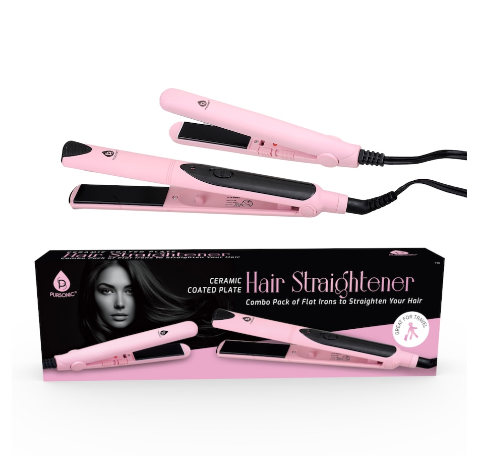 Professional Salon Quality Flat Iron Hair Straightener With A Free Travel Straightener! Includes Digital Lcd Display, Dual Voltage, Instant Heating, Ceramic Coated Plate, 1 countFeatures:Instant heat up: the New advanced metal Ceramic heater ensures a rise to 450 in 30 seconds & Provides continuous & stable Temps throughout stylingBetter styling & fast styling: our innovative vent design channels steam making the Pursonic straightener not only the perfect tool for dry hair, but also damp & Wet hairChoose Pursonic: for a pain free experience, Designed with a 2x smoother glide for zero pinching & pulling, our plate design keeps hair from snagging in the straighterAmazing value: duo pack of big & Mini (amazing for travel!!) flat ironPremium Specifications: : dual voltage 110V-220V with the use of international wall adapter (not included) for worldwide travel. Auto shut off after 60 mins for safety & Energy saving, salon quality & 360 swivel power cord for easy use!Model Number:Pink : TCA1555PKRed: TCA1555RDSilver: TCA1555SV