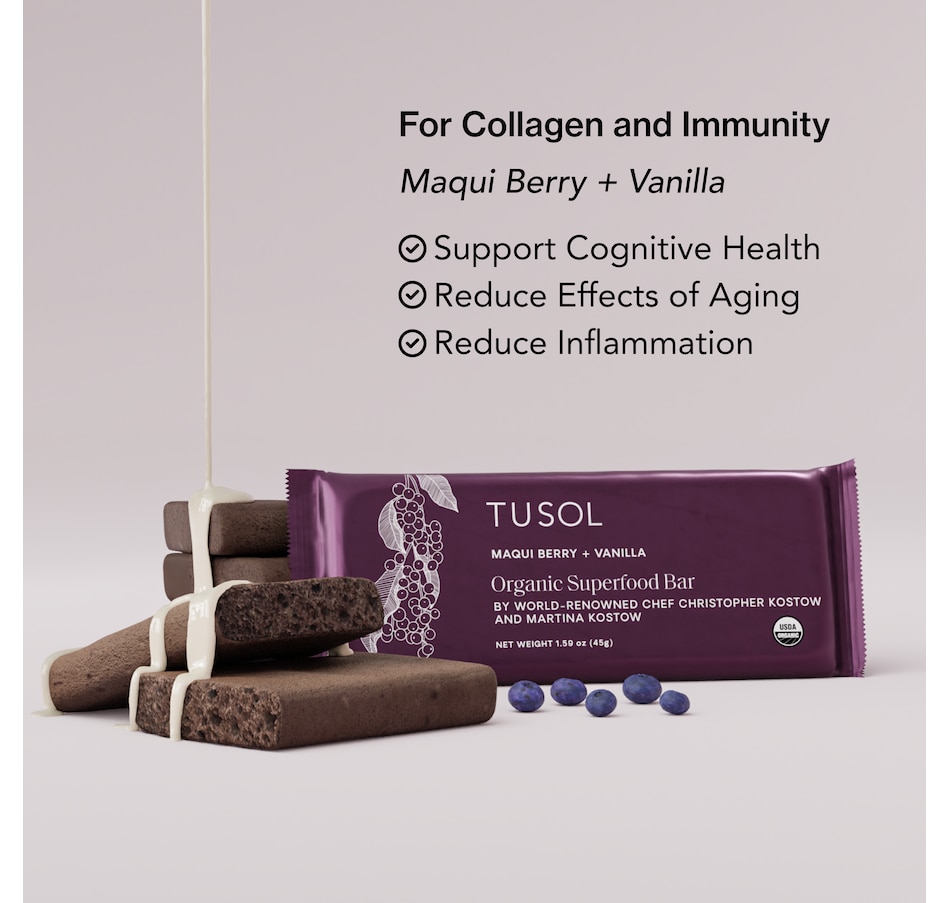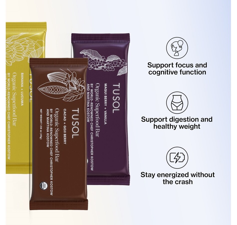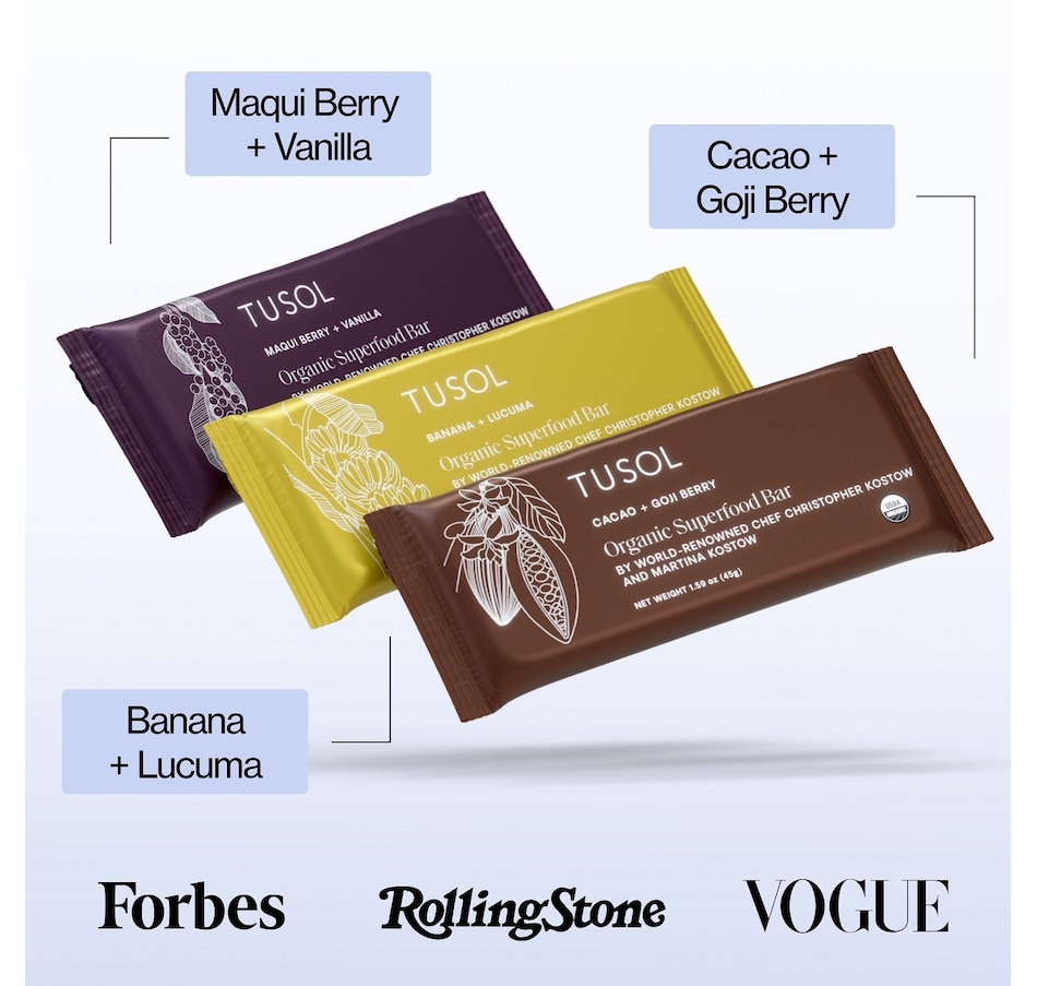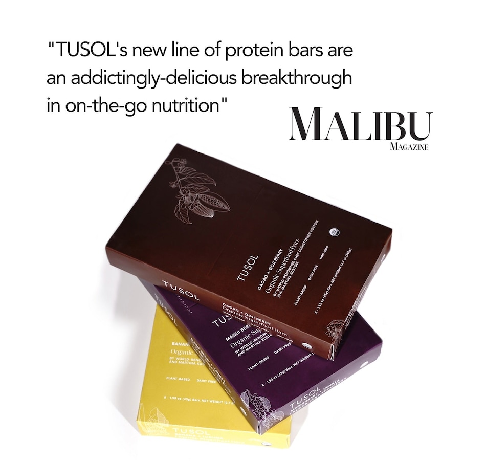 Support metabolism, energy and immunity with organic superfood protein bars designed by 3 Michelin Star Chef Christopher Kostow Martina Kostow.Box Includes: 16 - Cacao Goji Berry Bars for metabolism16 - Maqui Berry Vanilla Bars for collagen16 - Banana Lucuma Bars for immunityBenefits: Healthy Weight | Metabolism | Energy | Gut Health | ImmunityCleanest Ingredients: Organic | Dairy-Free | Gluten-Free