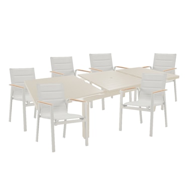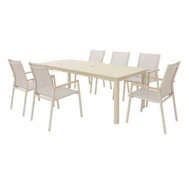 This table and chair set from Protégé features robust aluminum structures finished with a weather-resistant powder coating, and paired with brilliant, high-quality HDPE faux teak. The faux teak elements are made from a durable UV-resistant polymer, mimicking the natural warmth and charm of real wood without the maintenance. Get yours today at a fabulous showstopper value, right here at TSC!