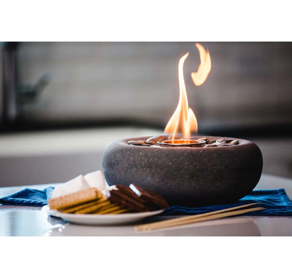 This fire bowl features Mexican beach pebbles and a protective cork base pad, and comes with three cans of Terra Flame Gel Fuel by SunJel.