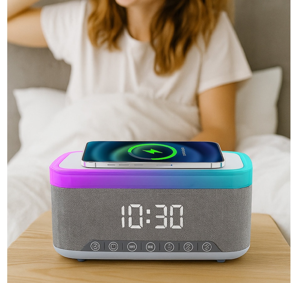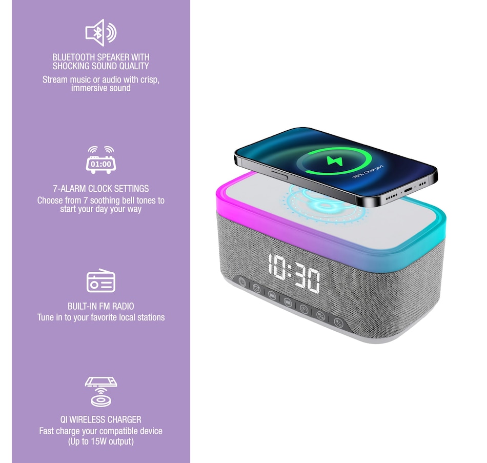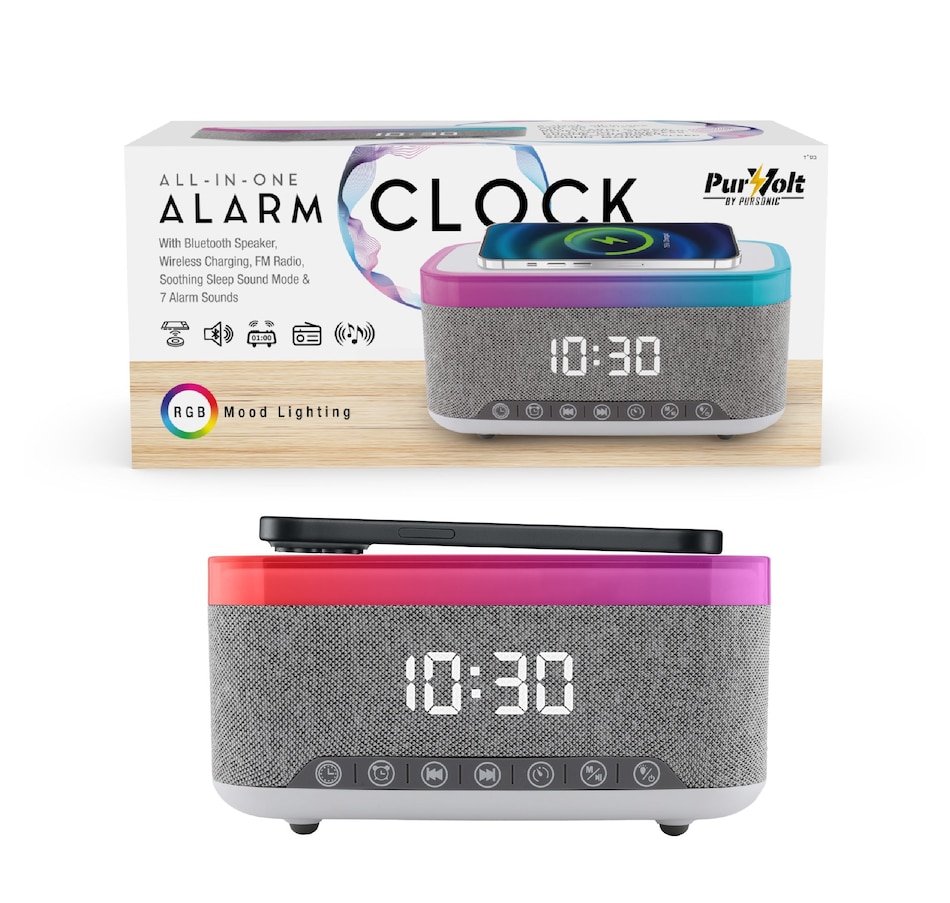 Transform your nightstand into a smart and functional space with the Pursonic All-in-One Alarm Clock. Designed to simplify your routine and elevate your environment, this multifunctional device combines essential features like an LED alarm clock, high-quality Bluetooth speaker, built-in FM radio, wireless phone charging, and more—all in one compact and modern design.Whether you're starting your morning, winding down at night, or simply enjoying your favorite music, this sleek alarm clock is engineered to meet your everyday needs with convenience and style.Key Features:Bluetooth Speaker with Crisp, Immersive AudioEnjoy rich, room-filling sound with integrated Bluetooth technology. Connect your smartphone or tablet to stream your favorite music, podcasts, or playlists wirelessly with crystal-clear clarity.Built-in FM RadioTune in to your favorite FM stations with the push of a button. Whether it’s music, talk shows, or morning news, stay informed and entertained without needing extra devices.LED Alarm Clock DisplayThe clear, easy-to-read LED display keeps you on schedule with a customizable alarm function. Wake up to your preferred time with accuracy and style.Qi Wireless Charging Pad – Up to 15W OutputKeep your phone powered without messy cables. Simply place your Qi-compatible device on the built-in charging pad to recharge while you rest. Delivers fast and efficient wireless charging up to 15 watts.Sleep Sounds ModeRelax before bedtime with the built-in sleep sounds function. Soothing audio helps you unwind, reduce stress, and improve sleep quality.Warm Night Light ModeAdd soft ambient lighting to your room with the gentle glow of the built-in night light—ideal for nighttime visibility without harsh brightness.Why Choose the Pursonic All-in-One Alarm Clock?Combines five key features in one compact design: Alarm clock, speaker, FM radio, wireless charger, and night light.Ideal for bedrooms, dorm rooms, offices, or guest spaces.Saves space and eliminates clutter with multi-functionality.Sleek and modern design fits with any décor style.Makes a thoughtful gift for tech lovers, students, or anyone looking to simplify their bedside setup.Upgrade your mornings and wind down your nights with the Pursonic All-in-One Alarm Clock—the smarter, more efficient way to stay on time, stay charged, and stay relaxed.All the functionality you need, all in one place.