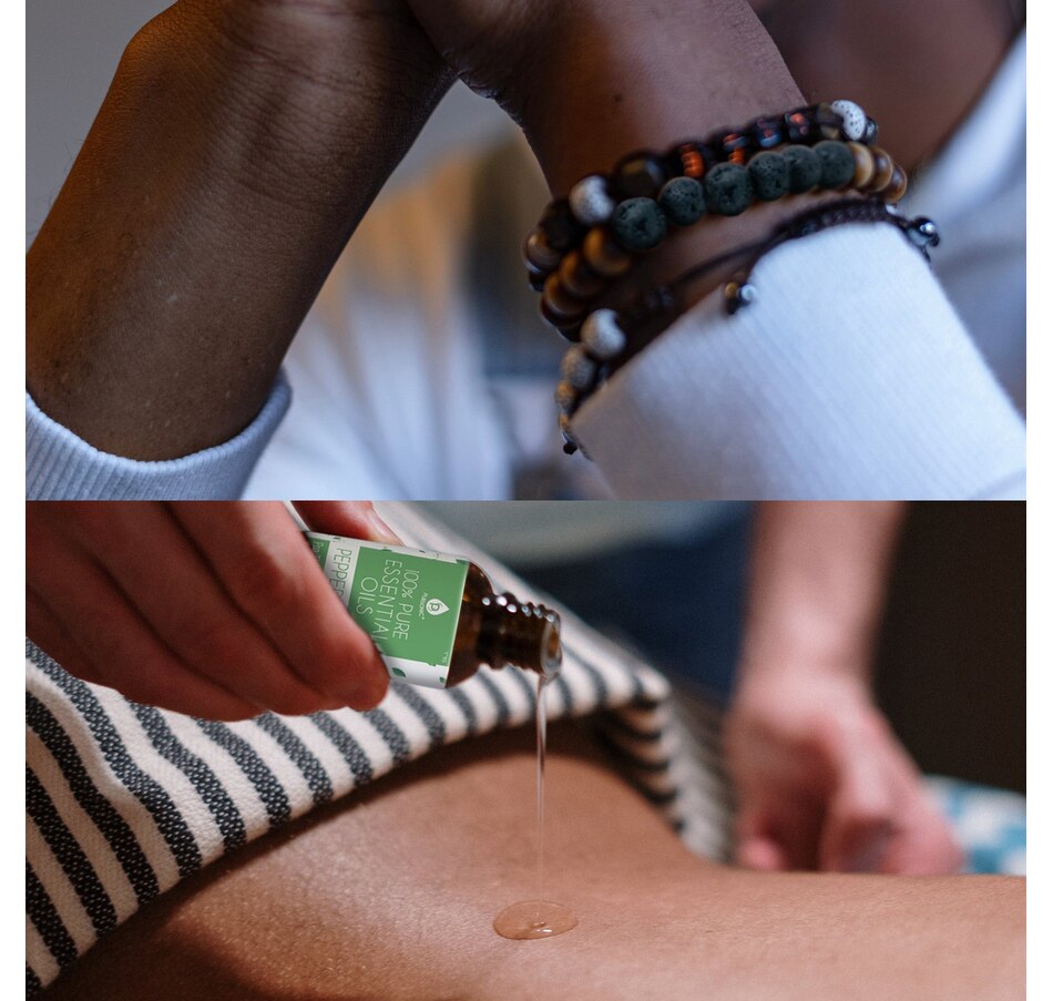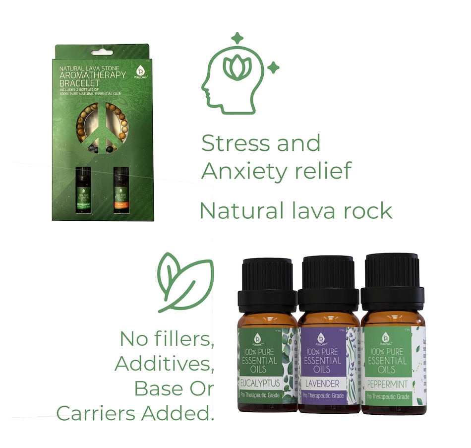 Get ready, you are about to be more enlightened than ever. Enhance and lighten your emotional state with the power of essential oils, thoughtfully paired with our Natural Lava Stone Aromatherapy Bracelet. This duo combines the mindful craftsmanship of the bracelet with the unique benefits of Eucalyptus, Lavender, and Tea Tree essential oils, offering a holistic and uplifting experience for your well-being.Natural Lava Stone Aromatherapy Bracelet:Adjustable Fit: The bracelet is thoughtfully designed with an adjustable length, ranging from 6.6 to 8.7 inches, catering to the perfect fit for both men and women.Secure and Easy Fit: Easily tightens on the wrist for a secure and comfortable fit, ensuring ease of wear throughout the day.Quality Materials: Crafted with care using 8 mm natural lava rock, natural picture stone, and a durable elastic string, blending aesthetics and durability seamlessly.Mindful Craftsmanship: Handcrafted with a meditation mindset and a commitment to Buddhist healing practices, reflecting meticulous attention to detail and spiritual intent.Stress and Anxiety Relief: Specifically designed as a stress and anxiety relief diffuser bracelet, providing aromatherapy benefits for a calming and centered experience.Easy-to-Use Lava Stone Diffuser: A user-friendly design allows for effortless use. Simply add 1-3 drops of essential oils onto the lava beads. Gently rub the oil into the beads. Reapply as needed for a prolonged aromatic effect.100% Pure Essential Oils:Eucalyptus:  - Purpose: Ideal for promoting feelings of clear breathing and open airways, creating a soothing massage experience.  - Additional Benefits: Known for purifying properties that can benefit the skin, cleanse surfaces, and purify the air. Helps clear the mind and promotes relaxation.Lavender:  - Purpose: A must-have oil known for reducing anxiety and emotional stress while promoting relaxation and calmness.  - Usage Tips: Add a few drops to pillows, bedding, the bottoms of feet at bedtime, or bathwater for a stress-relieving experience.Tea Tree:  - Purpose: Perfect for haircare due to its tropical cleansing, rejuvenating, and purifying properties.  - Benefits: Offers a gentle and natural alternative to chemical-laden hair care products, providing a soft and gente element to any hair care routine.