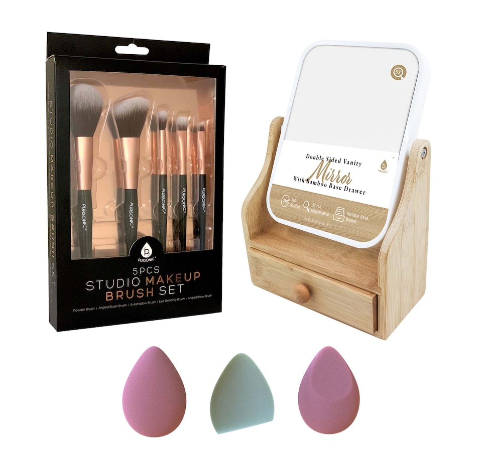 Transform Your Beauty Routine with This All-in-One BundleElevate your makeup and grooming experience with the Pursonic Beauty Essentials Set, featuring three must-have tools designed to help you achieve professional results effortlessly. From precision brushes to versatile sponges and a chic vanity mirror, this bundle has everything you need to look and feel your best.What’s Included:Pursonic 5-Piece Studio Makeup Brush Set (Black):Versatile Brushes: A complete set with brushes for foundation, powder, blush, eyeshadow, and contouring.Premium Synthetic Bristles: Durable and easy-to-clean fibers for smooth and streak-free application.Sleek Design: Black handles with gold accents bring sophistication to your beauty collection.Comfortable Grip: Textured handles provide control and precision for flawless makeup application.3-Pack Beauty Makeup Sponges – Multi-Shape Blenders:Round Egg Sponge: Ideal for blending larger areas like cheeks, neck, and full face.Egg with Angled Bottom: Perfect for contouring around the nose and forehead.Egg with Flat Side: Great for precise concealing of blemishes and under-eye areas.Washable and Reusable: Easy to clean for long-lasting performance.Wet or Dry Use: Achieve a dewy or matte finish depending on your preference.Pursonic Dual-Sided Vanity Mirror with Bamboo Drawer Base:Dual-Sided Magnification: Features 1x for an overall view and 3x for detailed precision.360-Degree Swivel: Adjustable to your ideal angle for grooming and makeup application.Bamboo Base Drawer: Convenient storage for beauty tools, jewelry, and more.Compact and Portable: Lightweight and stylish, perfect for home or travel.Key Benefits of the Bundle:All-in-One Solution: Includes essential tools for flawless makeup application and grooming.Effortless Precision: The brushes, sponges, and mirror work together to ensure seamless results.Stylish and Functional: Aesthetic design that complements any vanity while providing top-notch performance.Perfect for Any Skill Level: Whether you’re a beginner or a beauty enthusiast, this bundle enhances your routine.Why Choose the Pursonic Beauty Essentials Set?Flawless Results Every Time: High-quality tools designed for precision and ease of use.Compact and Portable: Ideal for at-home use or travel.Eco-Friendly Elegance: The natural bamboo base combines sustainability with style.How to Use:Brushes: Use the appropriate brush for your product and area of application. Blend evenly for a polished look.Sponges: Use damp for liquids and dry for powders. Blend with dabbing motions for streak-free coverage.Vanity Mirror: Adjust the angle for your desired view. Use 1x magnification for a general view and 3x for precise tasks.Elevate Your Beauty Game TodayWhether you're perfecting your makeup, blending like a pro, or fine-tuning your look, the Pursonic Beauty Essentials Set has everything you need for a seamless routine. Achieve professional results with tools that are stylish, durable, and easy to use.