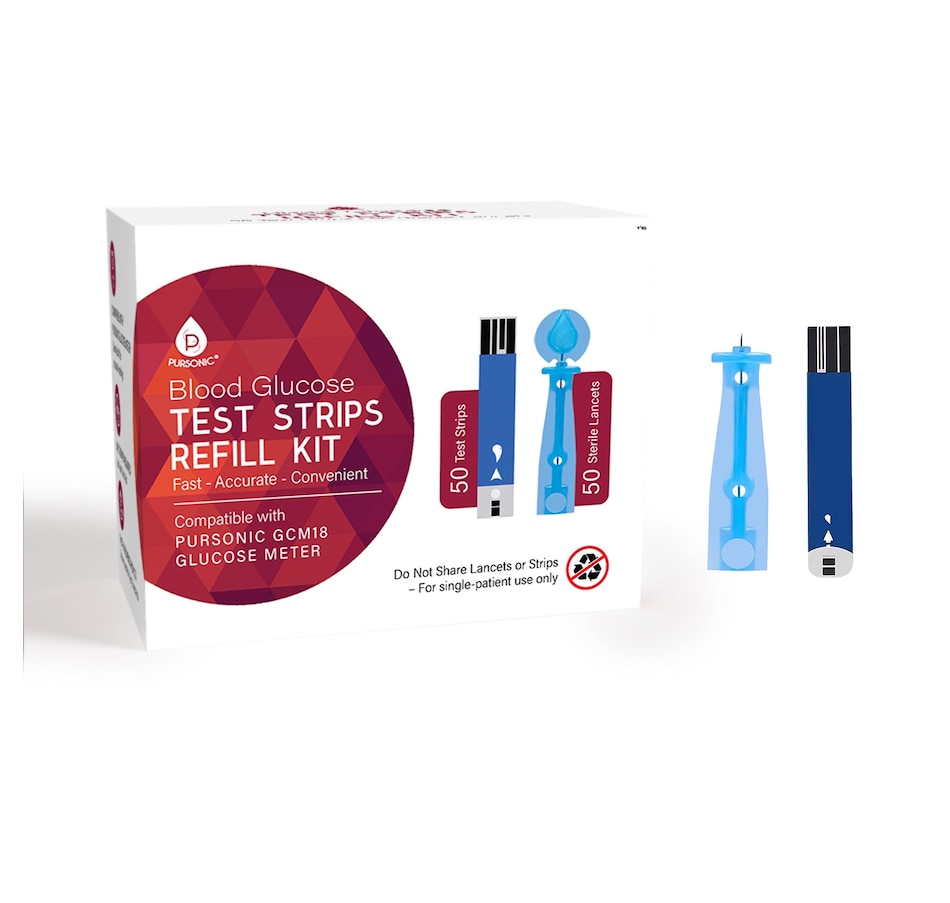 Monitor your blood glucose levels with confidence, accuracy, and ease using the Pursonic Blood Glucose Test Strips Refill Kit. This all-in-one refill pack includes 50 high-performance test strips and 50 sterile lancets, designed to work seamlessly with your Pursonic glucose meter. Whether you’re managing diabetes or simply keeping your health on track, this kit delivers fast and reliable results you can trust.Fast, Accurate, and Convenient:Delivers accurate results in just 5 secondsRequires only a tiny blood sample (0.7 μL), making testing less invasive and more comfortableCompatible with Pursonic glucose meters for a secure and accurate fit every timeSmart Design for Simple Use:No coding required – simply insert the strip and testCompact and portable – perfect for use at home or on the goClear results – designed to minimize user error and maximize reliabilitySterile Lancets Included:Includes 50 sterile lancets compatible with most standard lancing devicesDesigned for single-patient use onlyUniversal fit for convenience across a wide range of devicesQuality You Can Trust:Manufactured under strict quality standardsSafe and Reliable Chemistry:Glucose Oxidase (Aspergillus niger) – 10%Electron Shuttle – 50%Enzyme Protector – 8%Non-reactive ingredients – 32%Usage Instructions:Read manual before usingStore between 4°C and 30°C (39.2°F – 86°F)Do not refrigerateDo not apply blood on the surface of the stripAny part of the strip may be touched – results will not be affectedNote:Do not share strips or lancets. For single-patient use only.