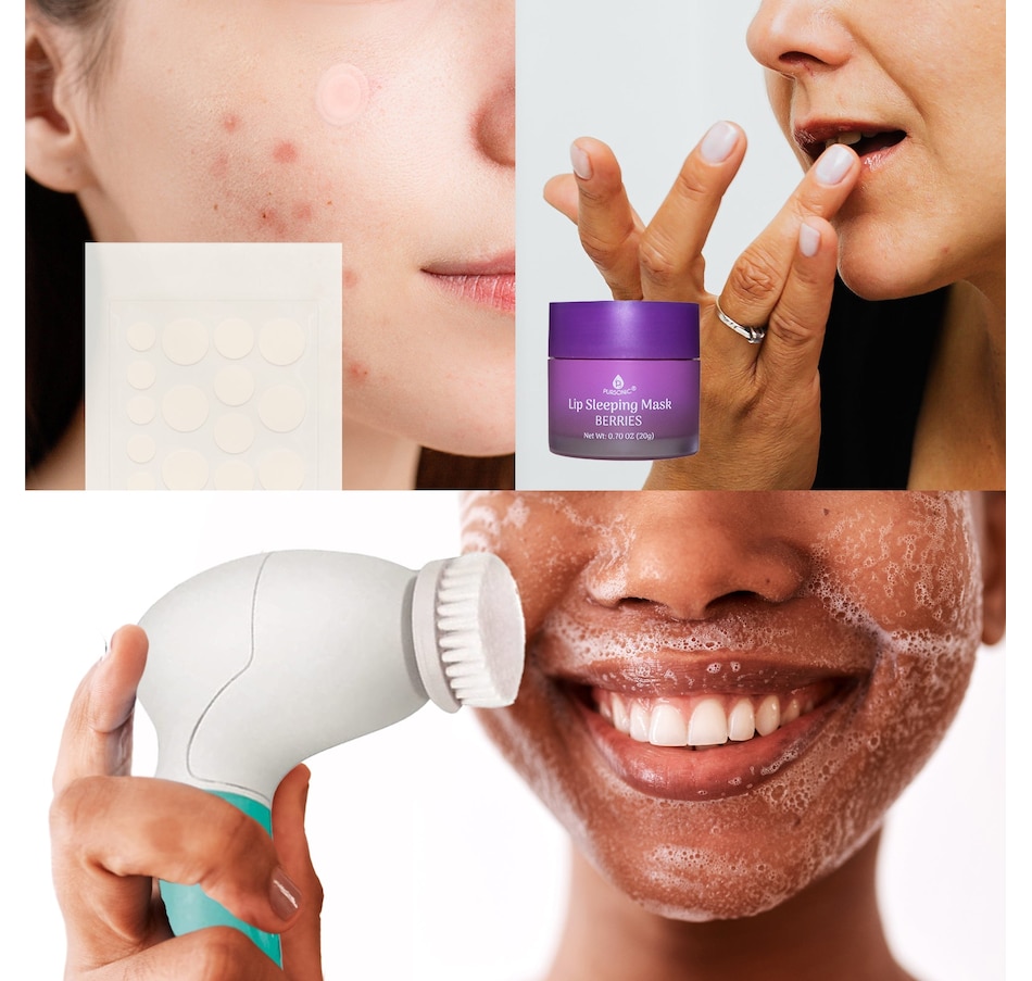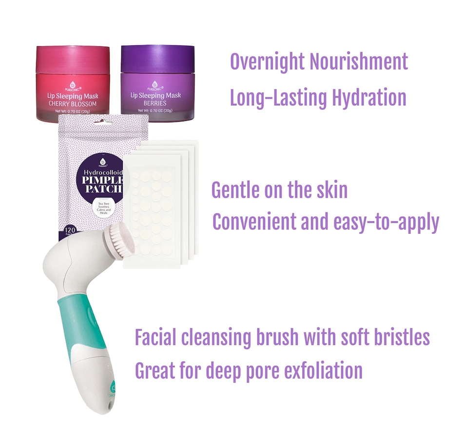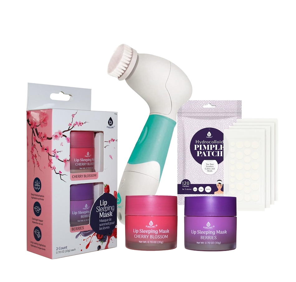 Revitalize your skincare routine with the Pursonic Ultimate Skincare Bundle, featuring three essential products for a complete pampering experience.1. Lip Sleeping Mask 2 Pack - Cherry Blossom & Berries: Indulge in overnight luxury for your lips with our Lip Sleeping Mask 2-Pack. The delightful scents of Cherry Blossom and Berries transport you to a fragrant garden of sweet, fruity delight. Formulated with natural ingredients, these lip masks deeply hydrate, exfoliate, and repair your lips while you sleep. Enjoy long-lasting hydration, easy application, and cruelty-free, safe ingredients. Treat yourself or share this perfect gift with a loved one.Key Features:Two Irresistible Flavors: Cherry Blossom and BerriesOvernight Nourishment and RepairExfoliation for Smooth, Rosy LipsLong-Lasting HydrationEasy-to-Apply, Non-Greasy FormulaConvenient 2-PackCruelty-Free and SafePerfect Gift2. Hydrocolloid Pimple Patch, 120-Count: Say goodbye to acne the gentle way with Pursonic Hydrocolloid Pimple Patches. Crafted from a soft, flexible material, these patches create a protective barrier against dirt and bacteria, promoting a quicker healing process. The 120-count pack in three different sizes offers convenience for on-the-go acne management. Experience clear, smooth skin without harsh chemicals.Key Features:Soft, Flexible MaterialProtective Barrier Against Dirt and BacteriaGentle, Easy-to-Apply SolutionEffective Absorption of ImpuritiesPromotes Skin Recovery120-Count in Three Sizes3. Advanced Facial and Body Cleansing Brush: Unleash the power of the Advanced Cleansing Microdermabrasion System for a complete skincare experience. This waterproof design includes four multifunction brush heads for body cleansing, facial skin cleansing, exfoliation, and makeup removal. The system promotes blood flow, restores skin vitality, and reveals younger-looking skin. Enjoy a cordless, easy-to-use design suitable for all skin types.Key Features:4 Multifunction Brush HeadsFull Range Skincare: Face and BodyPromotes Skin Tightness and VitalityWaterproof Design for Shower UseCordless and Easy-to-UseSuitable for All Skin TypesElevate your skincare routine with the Pursonic Ultimate Skincare Bundle, designed for beauty enthusiasts seeking the perfect balance of luxury and effectiveness.