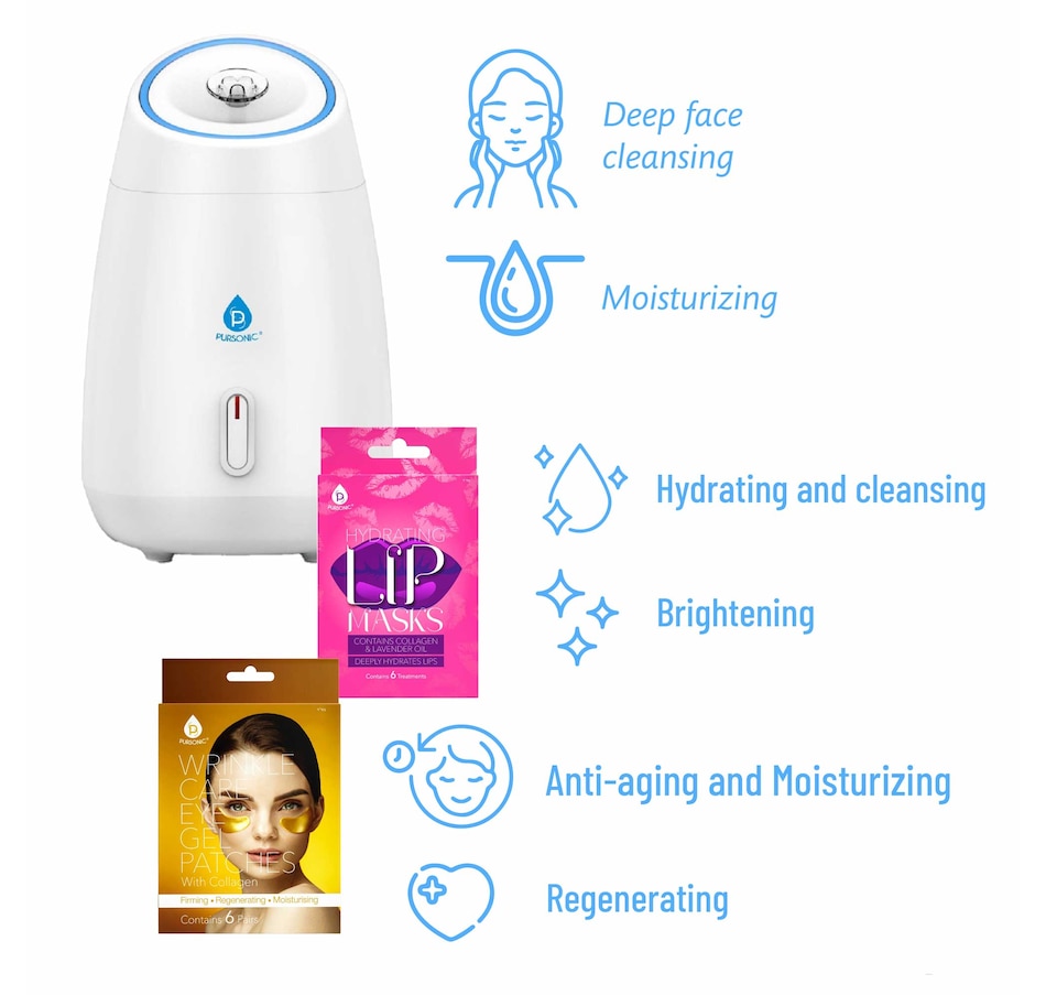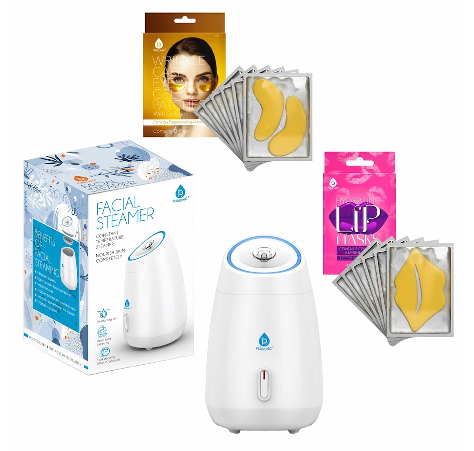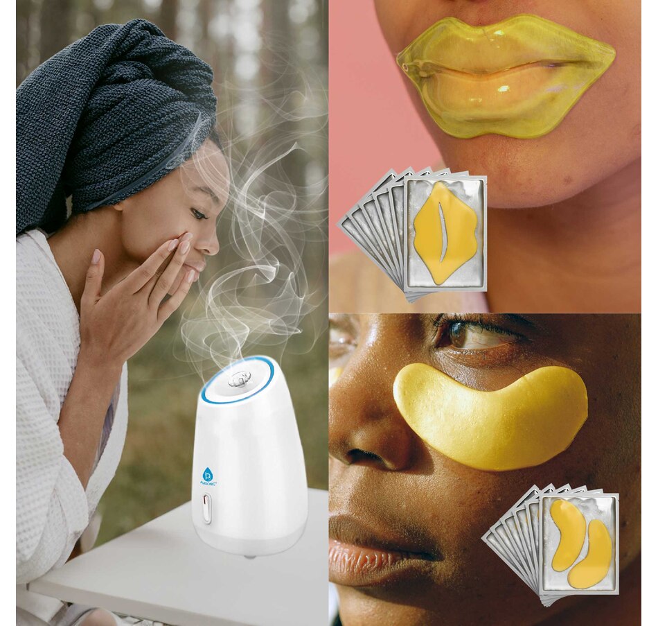 Discover the epitome of self-care with our Ultimate Relaxation Trio. This exclusive bundle is designed to provide a luxurious spa experience right in the comfort of your home.Deluxe Facial Steamer: Immerse yourself in the gentle embrace of our advanced facial steamer. Engineered with the latest nano-ionic steam technology, it opens and cleanses pores, leaving your skin feeling refreshed and rejuvenated. Its adjustable steam levels allow for a customized facial experience, suitable for all skin types.Soothing Eye Masks (6 Pack): Escape into tranquility with our specially crafted eye masks. Infused with calming ingredients like lavender and chamomile, these masks are your remedy for tired, puffy eyes. Their unique hydrogel formulation ensures maximum absorption, providing an instant cooling effect and reducing dark circles.Nourishing Lip Masks (6 Pack): Complete your pampering session with our hydrating lip masks. Rich in collagen and hyaluronic acid, these masks deeply moisturize and plump your lips, leaving them soft and lusciously smooth. The soothing essence of rose and vitamin E helps to repair and rejuvenate dry, chapped lips.Easy to Use & Safe: Each product in the Ultimate Relaxation Trio is designed with your safety and convenience in mind. The facial steamer features an auto shut-off mechanism for peace of mind, while the eye and lip masks are dermatologically tested and free from harmful chemicals.Ideal Gift: Packaged in an elegant box, this trio makes for a thoughtful gift for anyone looking to indulge in some self-care. Perfect for birthdays, anniversaries, or just a special treat for yourself.