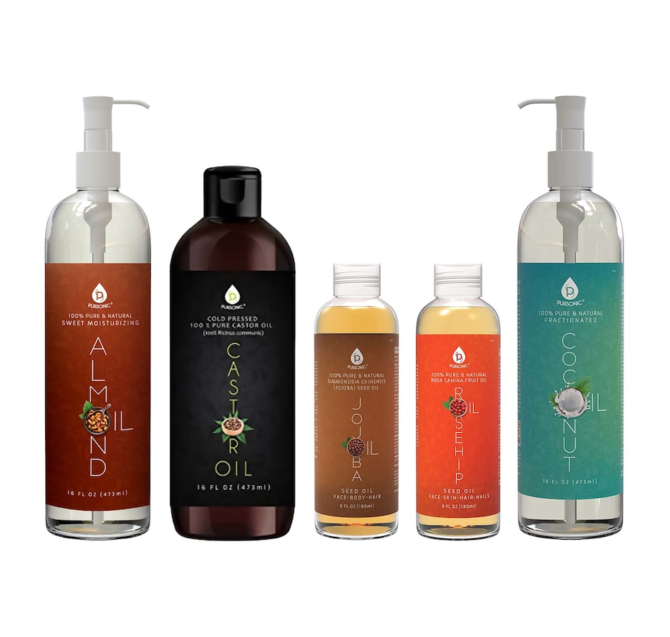 Nourish your skin, hair, and nails with this all-in-one premium bundle of Pursonic's best essential oils. Each product is crafted with natural, cold-pressed, or fractionated formulas to deliver powerful moisture, rejuvenation, and therapeutic benefits.What's Included:Pursonic 100% Pure Golden Jojoba Oil (6 oz)Ideal for dry skin and damaged hair, this luxurious oil regulates oil production, improves skin texture, and deeply nourishes hair and nails.Pursonic 100% Pure Rosehip Oil (6 oz)Rich in vitamins A and C, this anti-aging serum reduces wrinkles, scars, and sun spots while restoring elasticity for radiant, youthful skin.Pursonic 100% Pure Sweet Almond Oil (16 oz)A lightweight moisturizer that hydrates from head to toe, soothes irritation, and promotes hair growth with a smooth, glowing finish.Pursonic 100% Pure Fractionated Coconut Oil (16 oz)A non-greasy, multi-use oil perfect for massages, hair treatments, and aromatherapy recipes. Hydrates deeply without clogging pores.Pursonic 100% Cold Pressed Castor Oil (16 oz)Known for its powerful moisturizing properties, this oil enhances hair growth, strengthens lashes and brows, and helps clear makeup and impurities from hair follicles.Why Choose Pursonic?Multi-Use Power: Perfect for moisturizing skin, restoring hair, blending with essential oils, and therapeutic massage.Natural & Pure Ingredients: Hexane-free, cold-pressed, and formulated to be gentle on all skin types.Premium Quality: Backed by Pursonic’s commitment to customer satisfaction and long-lasting results.Transform your beauty routine from head to toe with these nourishing essentials. A thoughtful gift for skincare enthusiasts or a personal indulgence for radiant, healthy skin and hair.
