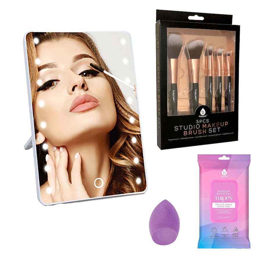 Elevate your makeup routine with the Pursonic Makeup Essentials Set, a complete kit for flawless application and easy removal. This bundle includes top-quality tools, convenient makeup removal, and a smart vanity mirror to perfect your look every time.Bundle Includes:1. Pursonic 5-Piece Studio Makeup Brush Set (Black)Stylish set with 5 essential brushes for every step of your makeup routine.Made with durable, self-cleaning synthetic fibers for smooth, even application.Sleek black design with gold accents; studded handles for easy grip and control.2. Pursonic Makeup Removal Wipes (Ultra-Soft Facial Cleansing Towelettes)Gentle, effective wipes that dissolve makeup, dirt, and oil in one step.Safe for all skin types and contact lens wearers; no rinsing needed.Pack includes 360 pre-moistened wipes, perfect for daily use and on-the-go freshening.3. Pursonic Facial Makeup Blender Sponge with StandNon-latex, hypoallergenic blender sponge for seamless blending of foundation, powders, and creams.Use wet or dry for a flawless finish; comes with a stainless steel display stand for easy storage.4. Pursonic Smart Mirror Touchscreen Makeup VanitySleek LED-lit mirror with 16 adjustable lights for perfect lighting.Features a smart touch button to control brightness and adjustable angles.Compact, portable, and designed to enhance any modern makeup setup. Requires 4 AAA batteries (not included).Your Complete Beauty Routine, Simplified:With the Pursonic Makeup Essentials Set, enjoy precision application, effortless makeup removal, and a beautifully lit vanity mirror for a perfect look every time. Whether you're at home or on the go, this bundle offers everything you need for a polished and convenient beauty routine.