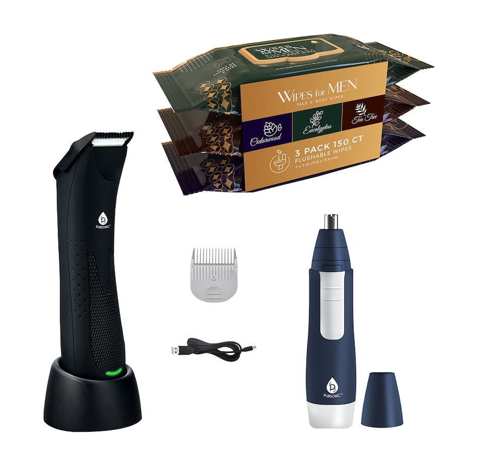 Upgrade your grooming game with this all-in-one men’s care bundle from Pursonic. Whether you're at home or on the go, this grooming set has you covered from head to toe. Featuring the Pursonic - Mario Lopez Wireless Body Hair Trimmer & Shaver, the Pursonic Nose and Ear Hair Trimmer, and a 3-pack of Men’s Assorted Face and Body Wipes, this bundle offers unmatched precision, convenience, and freshness for your daily routine.Pursonic - Mario Lopez Wireless Body Hair Trimmer & ShaverTake control of your grooming with a cordless, high-performance tool designed for versatility and comfort. This sleek trimmer is waterproof and equipped with an LED light for precision, even in low lighting.Key Features:Cordless Charging Base – Always ready for use without messy cords or battery swaps.LED Light – Trim with accuracy in any environment.Precision Ceramic Blade – Cuts effortlessly through thick and coarse hair.Waterproof Design – Safe for dry and in-shower grooming.USB Charging Comb Attachment – Customizable and travel-friendly.Pursonic Nose and Ear Hair TrimmerClean up your look—without the mess. This compact trimmer is ideal for nose, ears, and facial detail grooming. With its built-in Micro-Vacuum System, it captures clippings as you go, keeping your sink clean.Highlights:Smart Vacuum System – No cleanup needed after trimming.Multi-Use – Perfect for brows, nose, ears, and mustache.Dual-Edge Hypoallergenic Blades – Comfortable trimming without pulling.Battery Powered – Uses 1 AAA battery (not included); ideal for home or travel.Men’s Assorted Face and Body Wipes – Cedarwood, Tea Tree, and Eucalyptus (3-Pack, 150 Wipes)gRefresh on demand with these pH-balanced wipes that are gentle, effective, and ideal for daily use. This 3-pack includes 150 wipes total—perfect for the gym, your car, or busy days.Bundle Includes:50 Cedarwood Wipes – Warm, earthy scent50 Tea Tree Wipes – Naturally clarifying50 Eucalyptus Wipes – Invigorating and coolWhy You’ll Love Them:Great for face and bodyGentle on all skin typesConvenient and compactHelps remove dirt, sweat, and oil quicklyWhy Choose This Bundle?Complete grooming set for face, body, and detailsIdeal for travel, home use, or quick touch-upsDesigned with men’s needs in mind—clean, efficient, and powerfulHigh-quality tools and wipes from the trusted Pursonic brandKeep your style sharp and your skin fresh with the Pursonic – Mario Lopez Trimmer & Shaver Bundle, a curated collection for men who take their grooming seriously.