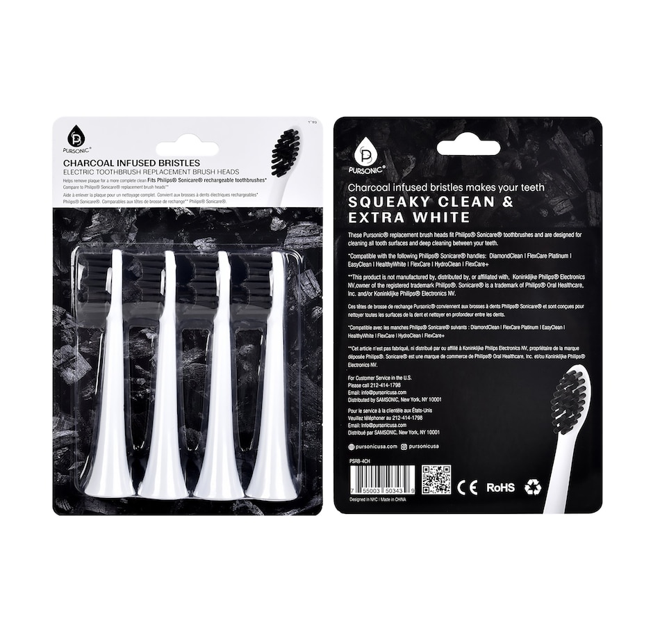 Upgrade your oral care routine with the Pursonic Replacement Toothbrush Heads. Designed for compatibility with a wide range of Philips Sonicare electric toothbrush handles, these replacement heads feature Dupont Tynex nylon bristles infused with activated charcoal, providing a superior brushing experience. Charcoal bristles are known for their natural whitening properties, helping to remove stains, reduce plaque, and freshen breath.These replacement heads are compatible with several Philips Sonicare models, including DiamondClean, EasyClean, FlexCare, FlexCare , FlexCare Platinum, HealthyWhite, and HydroClean. Whether you're aiming for deep cleaning or daily maintenance, the Pursonic brush heads are designed to optimize your oral hygiene routine.The activated charcoal-infused bristles are gentle yet effective, making them perfect for removing surface stains, absorbing impurities, and promoting overall gum health. They help keep your teeth clean, white, and fresh, while the Dupont Tynex Nylon ensures durability and precision cleaning with each use.Each head is designed for easy snap-on attachment to your existing Philips Sonicare handle, offering a seamless and convenient replacement. Pursonic delivers a budget-friendly alternative to branded heads without compromising on performance.DISCLAIMER: Pursonic is not affiliated with Philips Sonicare. All product names, logos, and trademarks used are strictly for identification purposes and belong to their respective owners.With Pursonic Replacement Toothbrush Heads, you can maintain your oral hygiene without breaking the bank. Get the same high-quality performance for less, with the added benefit of charcoal-infused bristles for a cleaner, whiter smile!