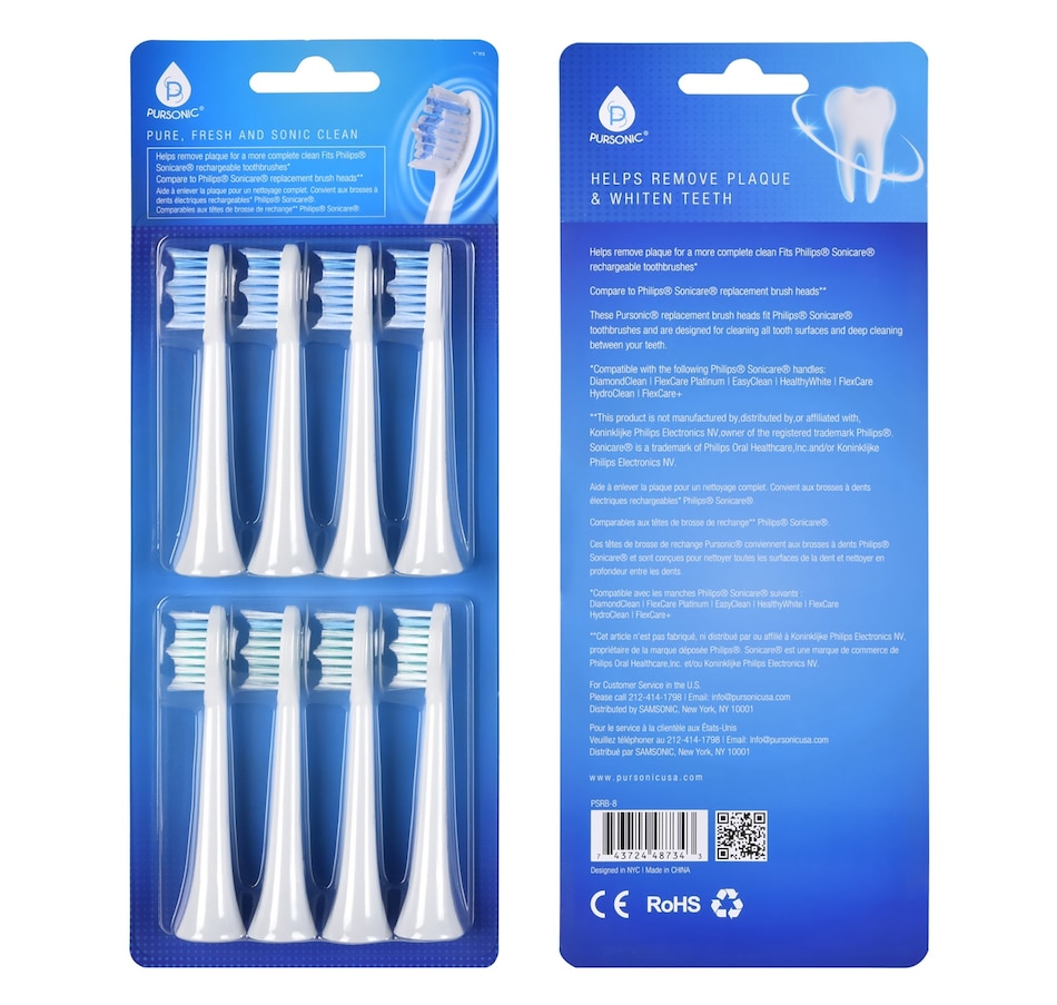 Enhance your oral hygiene routine with Pursonic Replacement Toothbrush Heads, designed to be fully compatible with Philips Sonicare Electric Toothbrushes. This 8-pack offers a high-quality, cost-effective alternative to name-brand replacements, ensuring a deep clean for your teeth and gums every time.Key Features:Made with DuPont Tynex Nylon Bristles, these replacement heads provide superior cleaning while being gentle on your gums.Compatible with popular Philips Sonicare handles, including DiamondClean, EasyClean, FlexCare, FlexCare , FlexCare Platinum, HealthyWhite, and HydroClean, making them a versatile choice for many Sonicare users.The precision-shaped bristles fit into hard-to-reach areas, effectively removing plaque and improving gum health.With eight brush heads in each pack, you’ll have a long-lasting supply, ensuring your toothbrush remains effective over time. These generic replacement heads offer the same great benefits as branded options but at a fraction of the price.DISCLAIMER: All brand names, logos, and trademarks are used strictly for identification purposes. All are the property of their respective owners.Switch to Pursonic Replacement Toothbrush Heads for a reliable, effective clean without breaking the bank. Keep your smile bright and your gums healthy with this convenient, high-quality alternative.