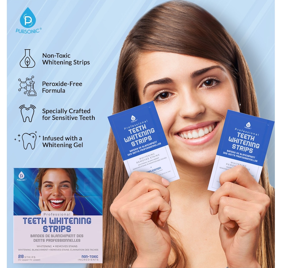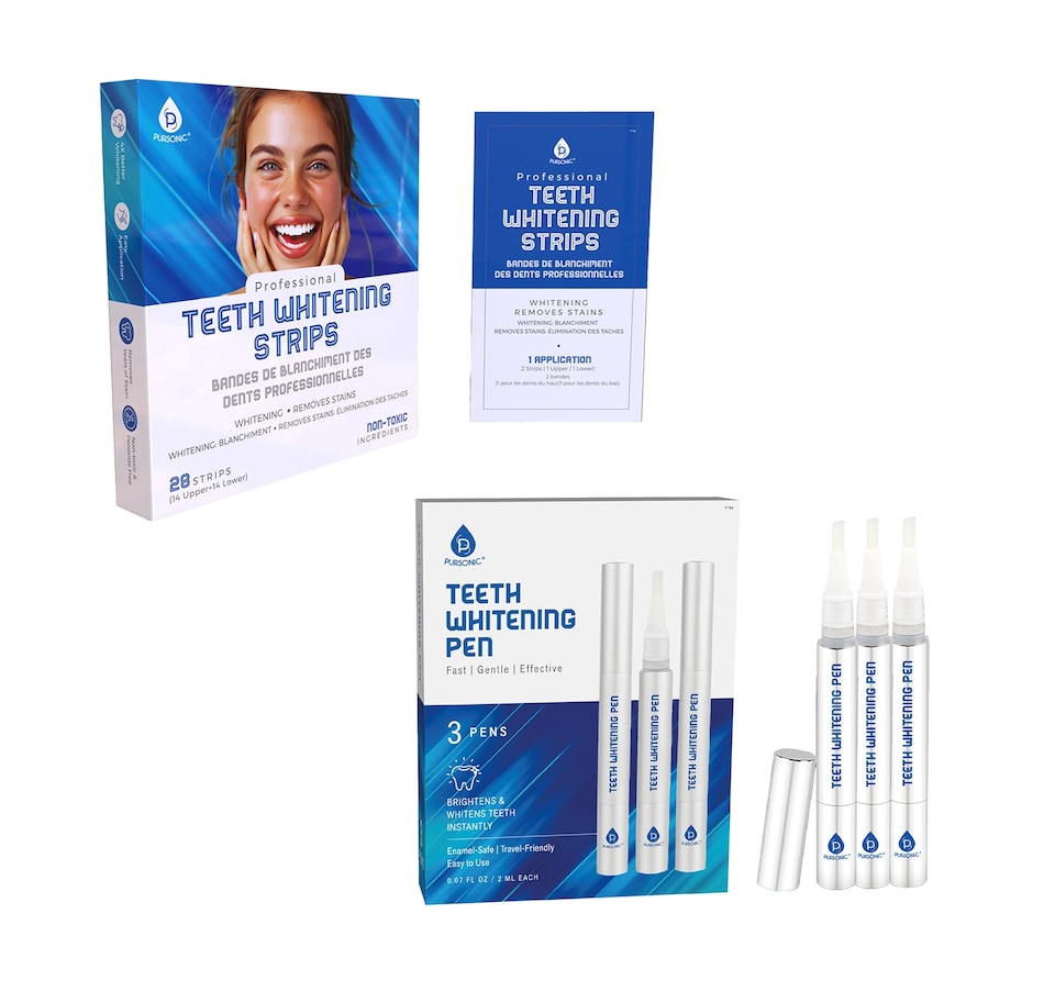 Get a brighter, more confident smile at home or on the go with this powerful two-piece bundle. Featuring the Pursonic Teeth Whitening Pens (3-Pack) and Professional Whitening Strips, this set gives you the versatility to whiten your teeth anytime, anywhere—whether you need quick touch-ups or a deeper whitening treatment.Pursonic Teeth Whitening Pens (3-Pack)Perfect for daily use or last-minute touch-ups, these easy-to-use pens contain a gentle yet effective whitening gel that removes stains without sensitivity or harsh abrasives. Compact and travel-friendly, they’re ideal for pockets, purses, or carry-ons—so your smile stays bright wherever life takes you.Professional Teeth Whitening StripsDesigned for powerful, peroxide-free whitening, these strips deliver up to 4x better results than standard whitening products. They target tough stains from coffee, wine, and tea, all while staying securely in place for hassle-free whitening during your day. Gentle on enamel, yet effective enough to reveal a noticeably whiter smile.Why You’ll Love This Bundle:Dual Whitening Power: Strips for deep stain removal pens for quick, on-the-go brightness.Gentle & Safe: Both products are enamel-safe, peroxide-free, and designed for sensitive teeth.Travel-Ready & Convenient: Pens slip easily into your bag, while strips offer a simple, hands-free whitening treatment.Confidence Boosting Results: Maintain a radiant, camera-ready smile without expensive treatments or messy strips alone.Whether you’re getting ready for an important event, maintaining your daily routine, or tackling stubborn stains, this bundle gives you everything you need for a smile that’s whiter, brighter, and always photo-ready.
