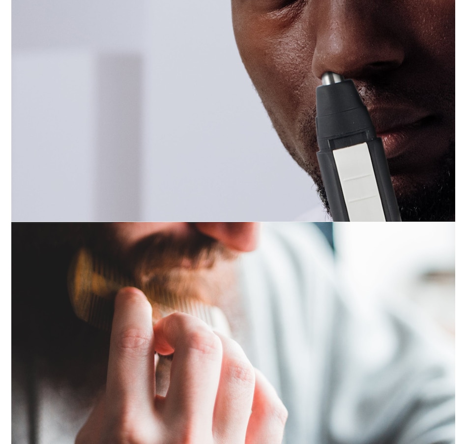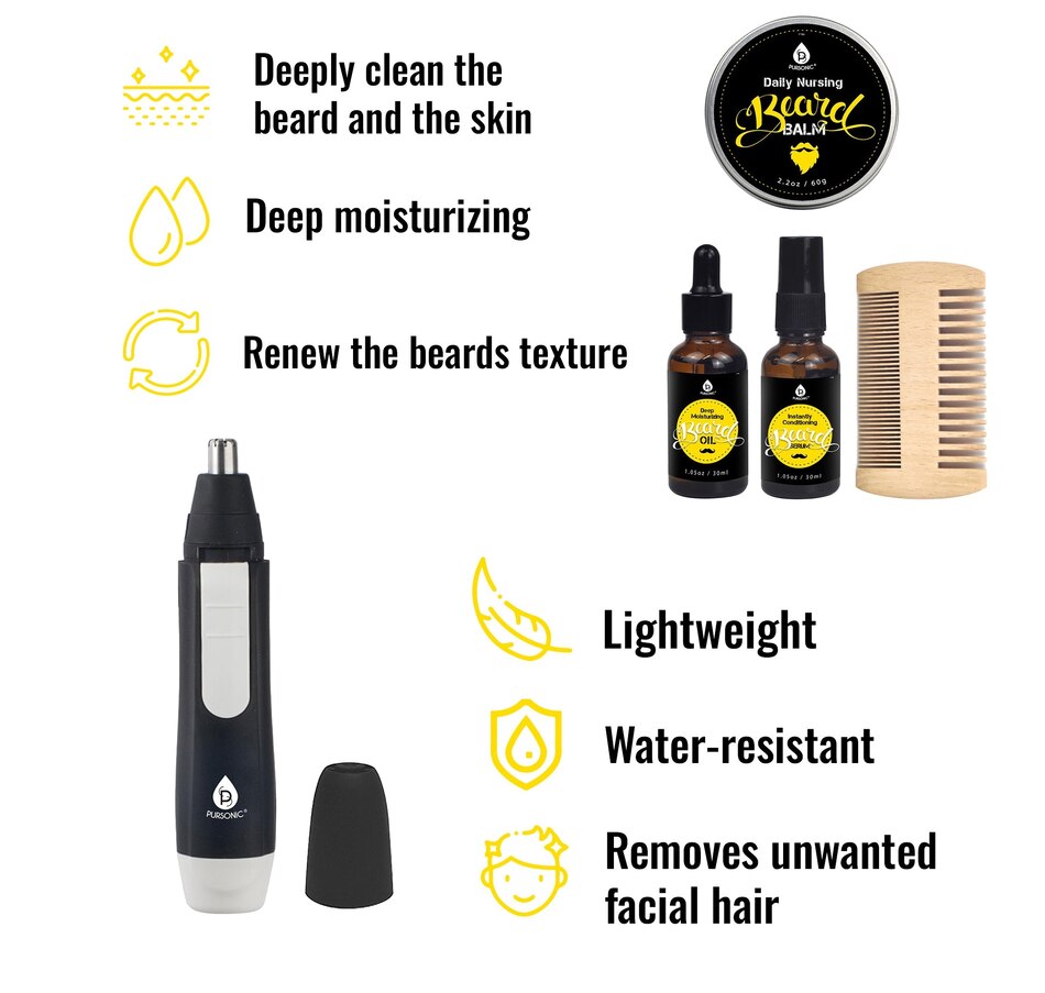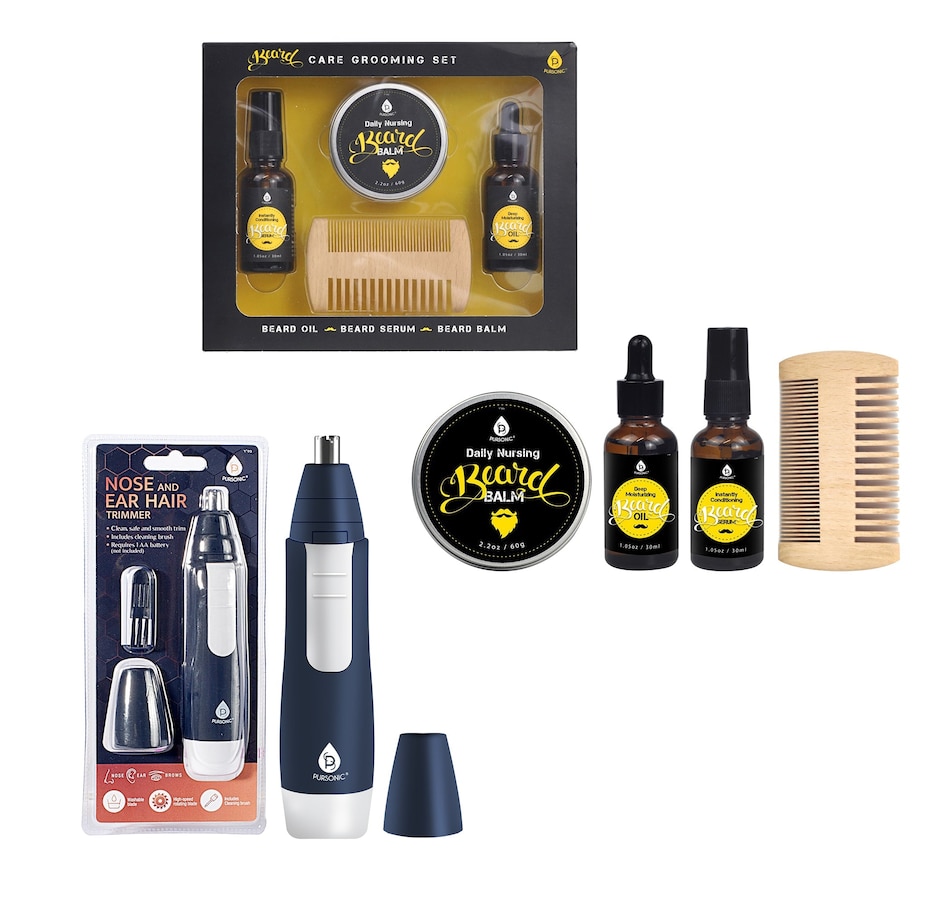 Beard Care and Grooming Set:Beard Comb and Brush Included: Comes with a beard comb and brush for effective grooming and styling of facial hair.Beard Oil (30 ml):Deep Moisturizing: Provides deep hydration to the beard, keeping it well-nourished.Smoothing Effect: Helps smooth out the beard texture for a refined appearance.Enriched Formula: Contains vitamin E essences and Golden Jojoba oil for added benefits.Sebum Balance: Regulates the balance of sebum on the skin, promoting a healthier beard.Beard Balm (60 g):Shape and Shine: Firms the shape of the beard while keeping it shining for a prolonged period.Multi-functional: Serves multiple purposes, including shaping, nurturing, and even for shaving.Beard Serum (30 ml):Deep Cleansing: Effectively cleans the beard and the skin underneath.Oil Reduction: Reduces excess oil on the skin, promoting a cleaner and refreshed feeling.Nose and Ear Hair Trimmer:Versatile Trimming: Comfortably removes nose, ear, and unwanted facial hair, while also detailing beard and eyebrows.Dual-Edge Blades:Curved Hypoallergenic Blades: The stainless-steel blades are curved for safe and clean cutting without irritating the skin or pulling hairs.Battery-Powered Convenience:Battery Requirement: Uses 1 x AAA battery (not included) with a power rating of 1.5 V for easy and convenient operation.