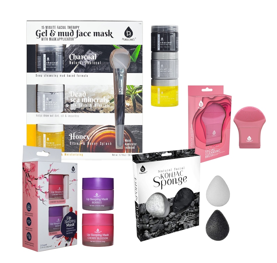 Pursonic Advanced Facial Cleansing Brush Microdermabrasion System Silicone Facial Brush,Skin Cleanser Anti-Aging Face Massager Deep Cleansing Remove Blackhead and Skin Care for All Skin TypesEnjoy a full skin care routine wherever you are with the Pursonic FC200. This silicone facial brush delivers superior cleansing and anti-aging benefits for radiant skin at home or on the go.Sonic pulsations help remove dirt and oil while gentle exfoliation promotes smoother, younger-looking skin.Suitable for all skin types, including sensitive skin. Mild, anti-sensitive, and non-abrasive design ensures effective cleansing without irritation.Powered by 2 AA batteries (not included) for convenient, cordless use.Natural Facial Konjac Sponge Duo SetMade of natural fiber, these Konjac sponges are gentle and ideal for all skin types, even newborns.White sponge for all skin types; charcoal sponge for oily or problematic skin. Charcoal sponge can be used weekly for deeper cleansing.Exfoliates to bring back the natural glow of skin, balances the skin's pH, and moisturizes naturally.Konjac Root detoxifies and restores vitality, promoting a refined facial complexion.Easy to use: soak sponge in water until soft, massage gently in circular motion on face, and rinse after use. Sanitize every 1-2 weeks by boiling for 1 minute.Lip Sleeping Mask 2 Pack- Cherry Blossom & BerriesIndulge in an overnight pampering experience with lip masks in Cherry Blossom and Berries scents.Formulated with natural ingredients to deeply hydrate, repair, and rejuvenate lips while you sleep.Exfoliating agents gently remove dead skin cells, leaving lips smooth and rosy.Creates a protective barrier for long-lasting hydration and prevention of dryness.Creamy, non-greasy formula glides on smoothly for easy application.Perfect for gifting, beautifully packaged for a loved one or yourself.3 Pack Facial Therapy Mud Face Mask with Mask ApplicatorValue pack includes Charcoal Mud Mask, Dead Sea Minerals Mask, and Honey Mask for a variety of skin benefits.Charcoal mud mask draws out impurities, sloughs away dead skin, and reveals new skin beneath.Dead Sea minerals strengthen skin tissues, stimulate blood circulation, and provide protection against dehydration.Honey mask benefits oily and acne-prone skin, keeping it moist without oiliness.Easy-to-use: Apply evenly over face, avoiding eyes and lips. Wear for 10-15 minutes and wash off residue immediately. Recommended usage: 2-3 times a week.Elevate your skincare routine with the Pursonic Ultimate Skin Care Gift Bundle, featuring a comprehensive selection of products for radiant, healthy-looking skin from head to toe.