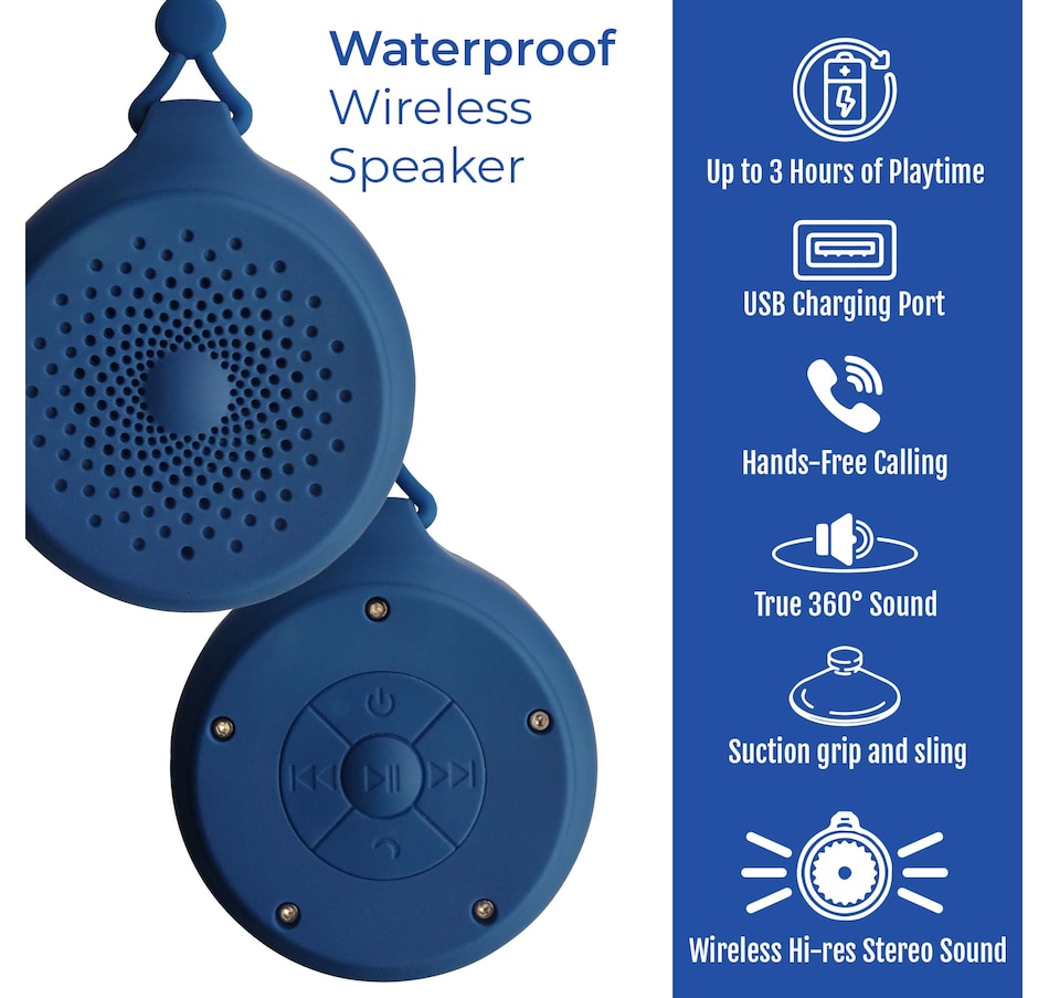 Elevate your listening experience in any wet environment with our Waterproof Wireless Speaker. This robust speaker is designed with a strong suction grip and a convenient sling, making it perfect for use in showers, on tiles, or even marble surfaces. Rated IPX4 for water resistance, it stands up to splashes and moisture without missing a beat. With up to 3 hours of playtime and true 360-degree sound, enjoy uninterrupted, high-resolution audio from all angles. The built-in USB charging port and hands-free calling feature add functionality and convenience, making this speaker a must-have for any bathroom or outdoor adventure. True 360-Degree Sound: Delivers clear, immersive sound that fills your space, no matter the setting. Suction Grip and Sling: Easily attaches to flat surfaces like shower walls, tiles, and more, ensuring stability and security. IPX4 Waterproof: Resistant to water splashes from any direction, ideal for use in wet conditions. Up to 3 Hours of Playtime: Perfect for shorter sessions like morning routines or poolside relaxation. USB Charging Port: Convenient charging of devices, ensuring you stay connected even in the bathroom. Hands-Free Calling: Take calls without having to leave the comfort of your shower or pause your activities. Wireless High-Resolution Sound: Experience superior stereo sound quality wirelessly, enhancing your audio environment.