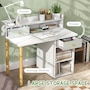 ● Spacious storage with two drawers and shelves organizes supplies neatly;