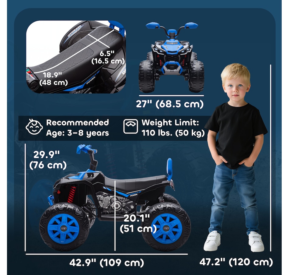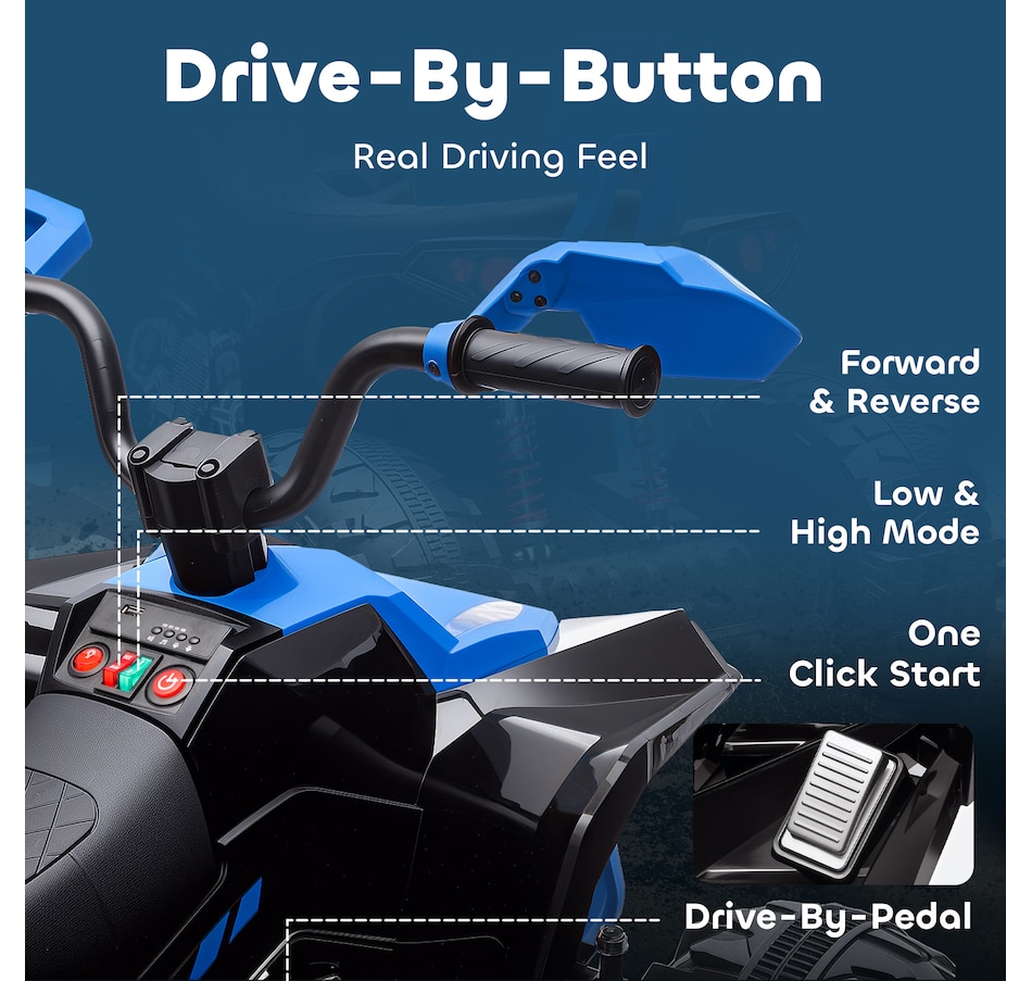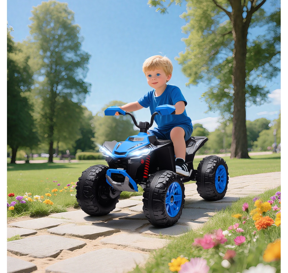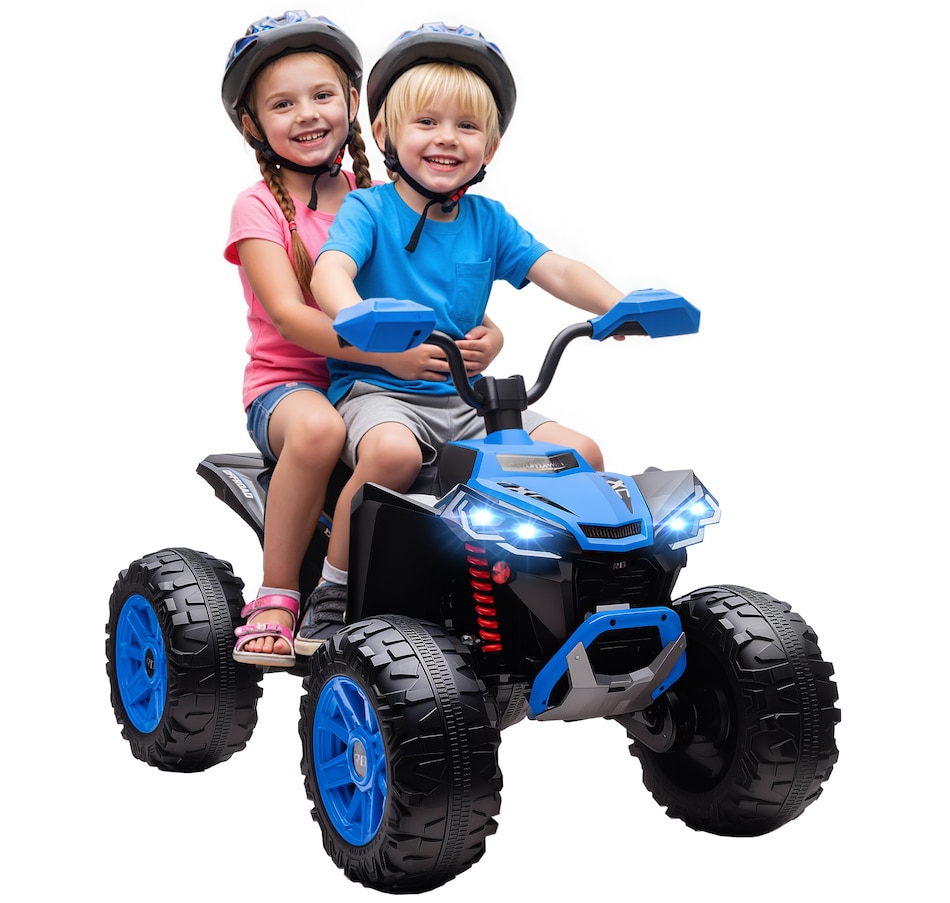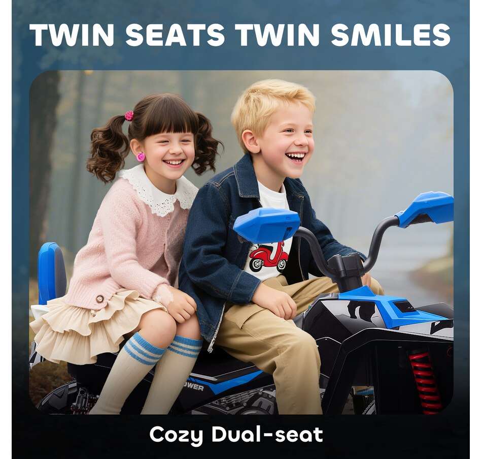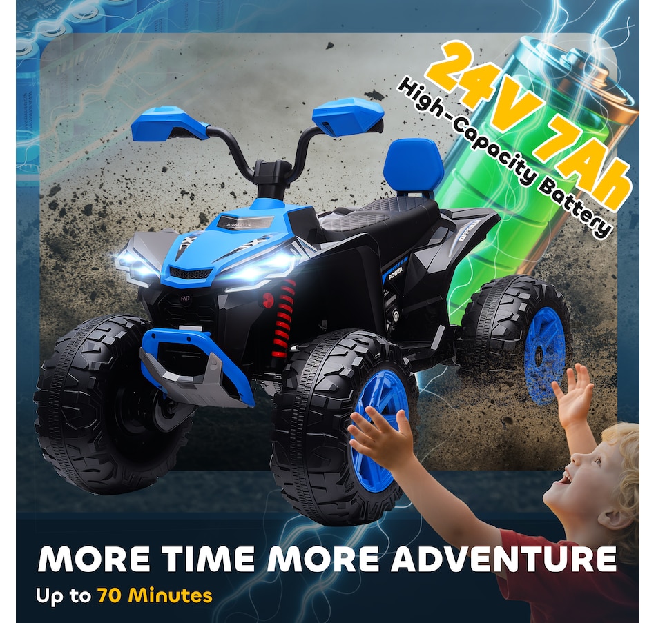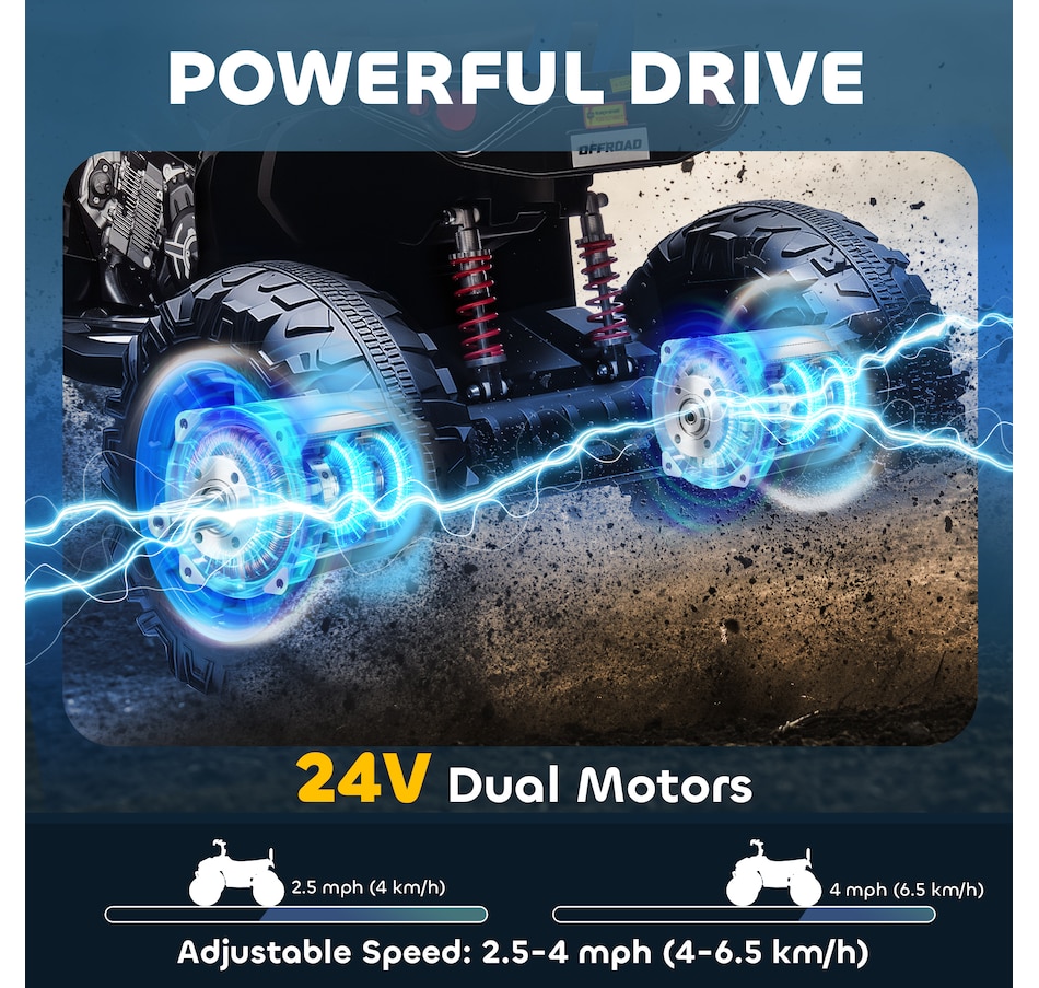 Get ready to ignite your child's imagination with thrilling outdoor adventures in this powerful Qaba kids ATV! This 24V dual-motor quad offers adjustable speeds, an extended two-seater design, and up to 70 minutes of continuous play. Its all-terrain tires with spring suspension handle pavement, grass, and sand with ease. Fun extras, such as music, MP3, and headlights, make every ride unforgettable. The great ride-on for fun, friendship, and freedom.Features: