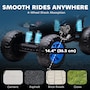● Wide wheels and dual suspension provide a smoother, safer ride;