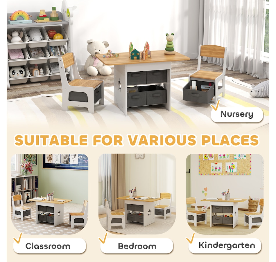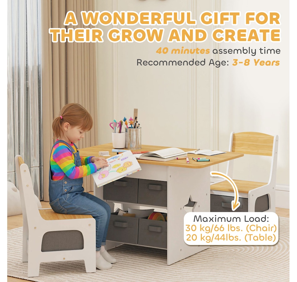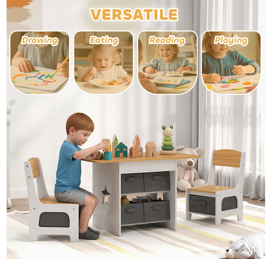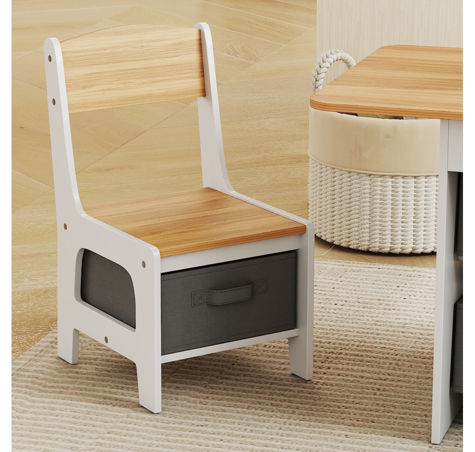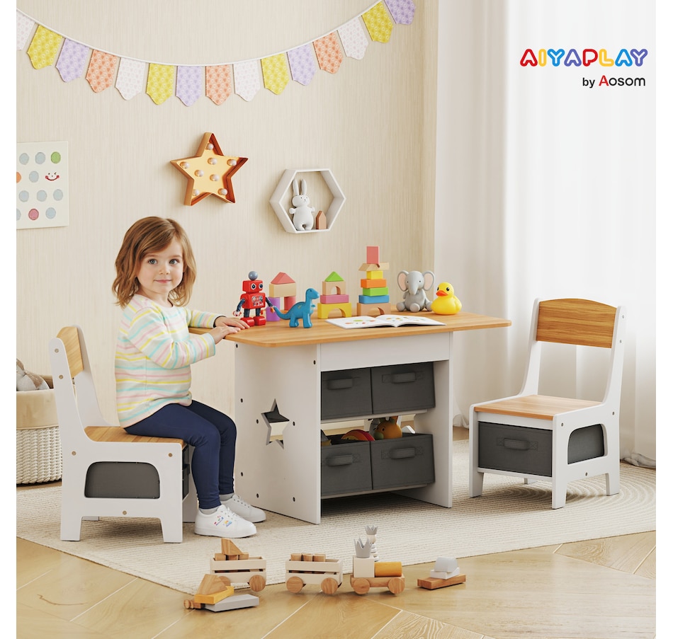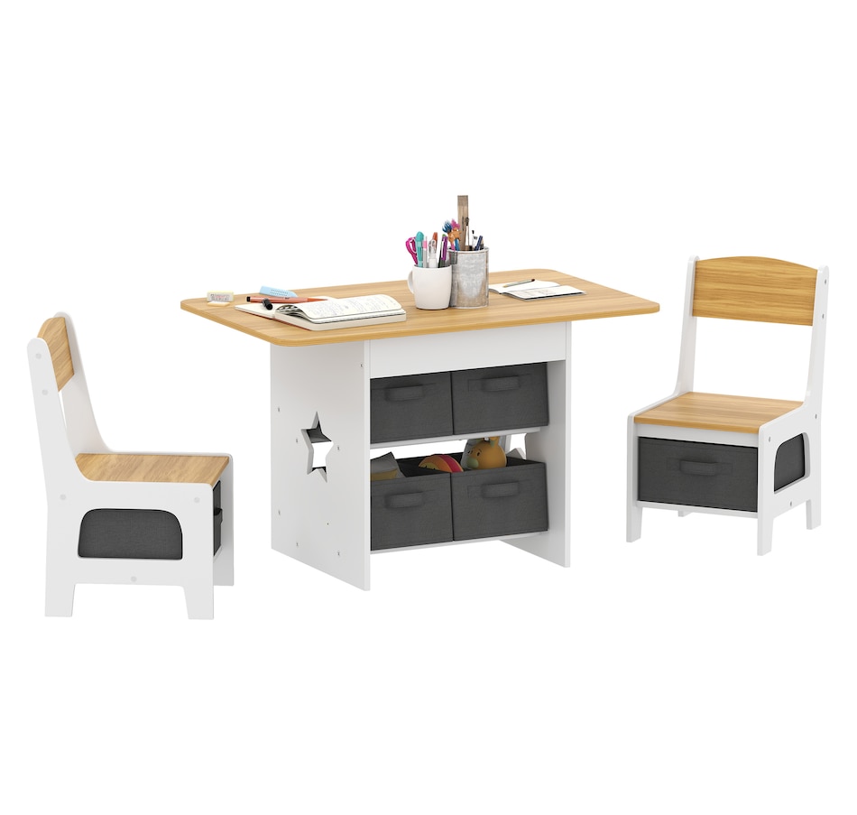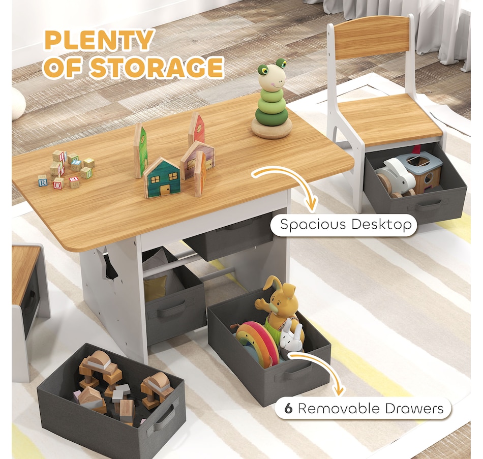 3 Piece Kids Table and Chair Set with 6 Removable Drawers, Natural