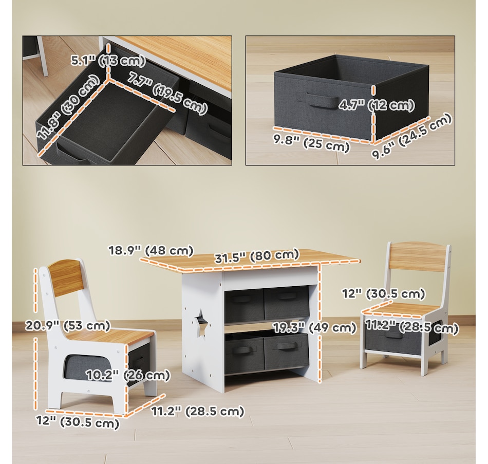 ● Storage Bin Size: 11.8" L x 7.7" W x 5.1" H (30 x 19.5 x 13 cm)(under table), 9.8" W x 9.6" D x 4.7" H (25 x 24.5 x 12 cm)(under chair);