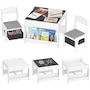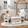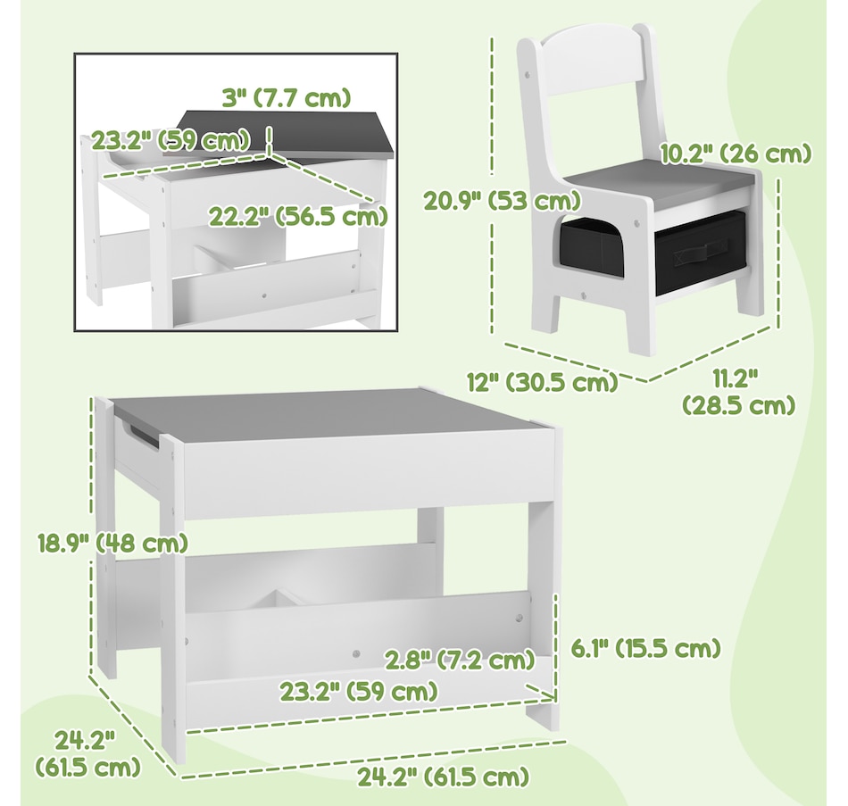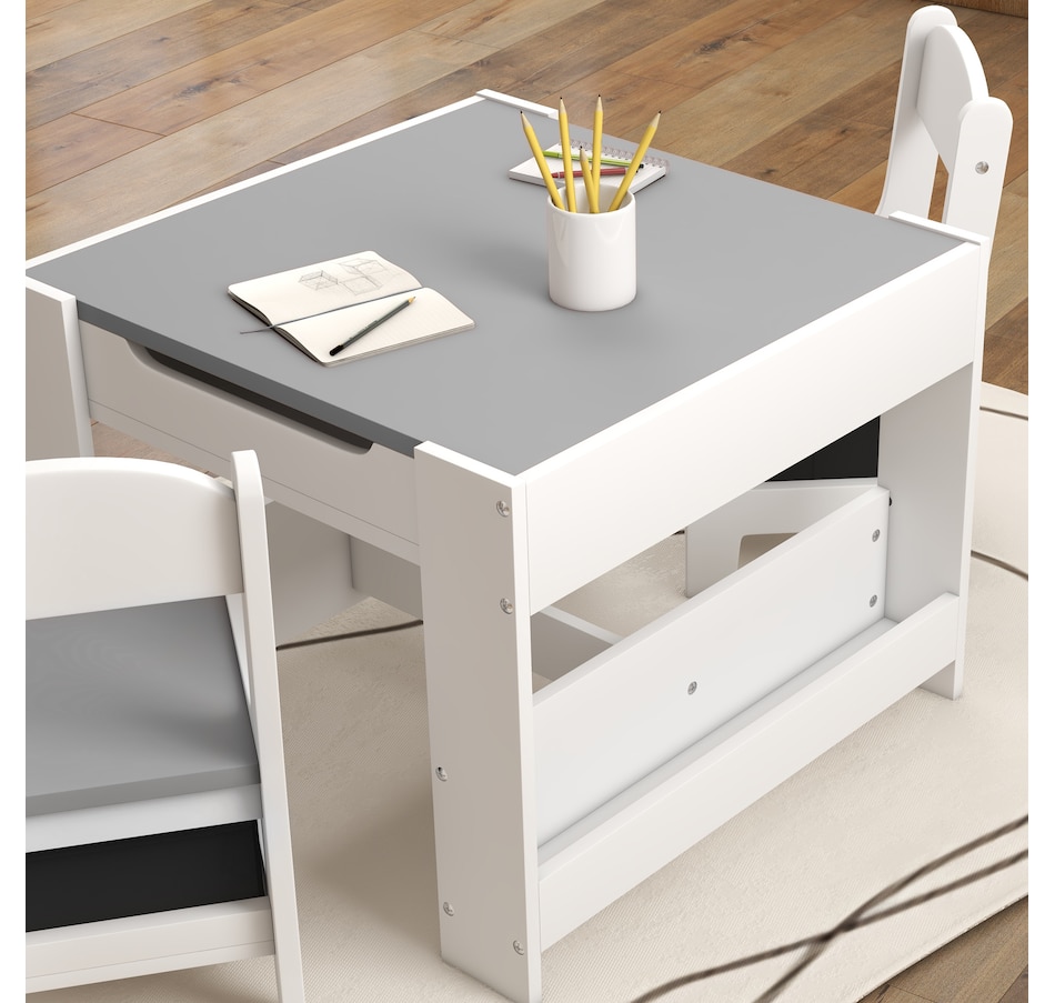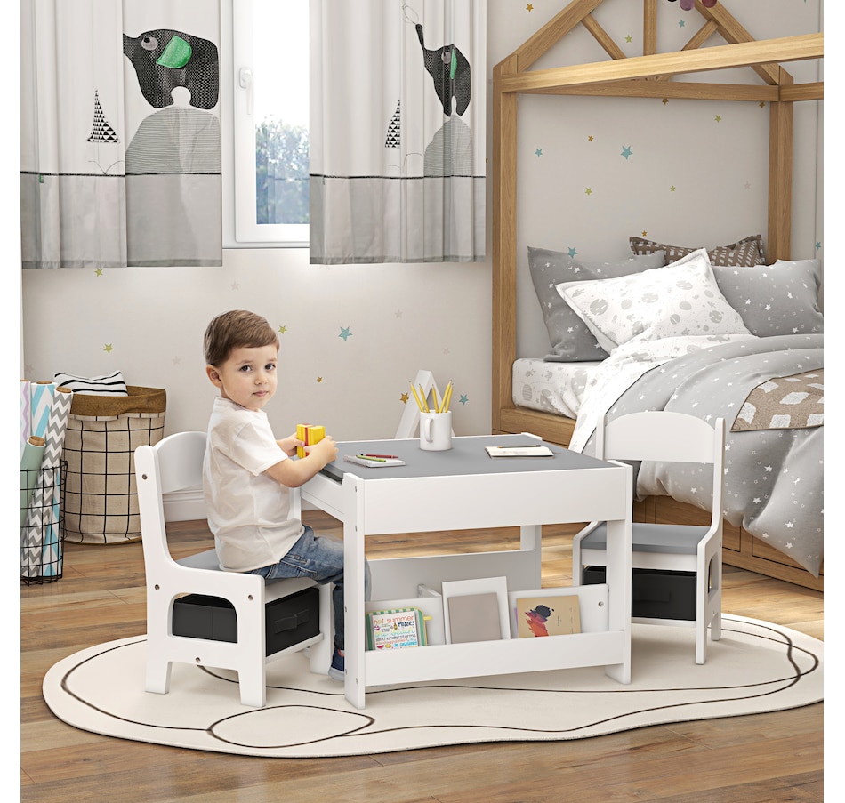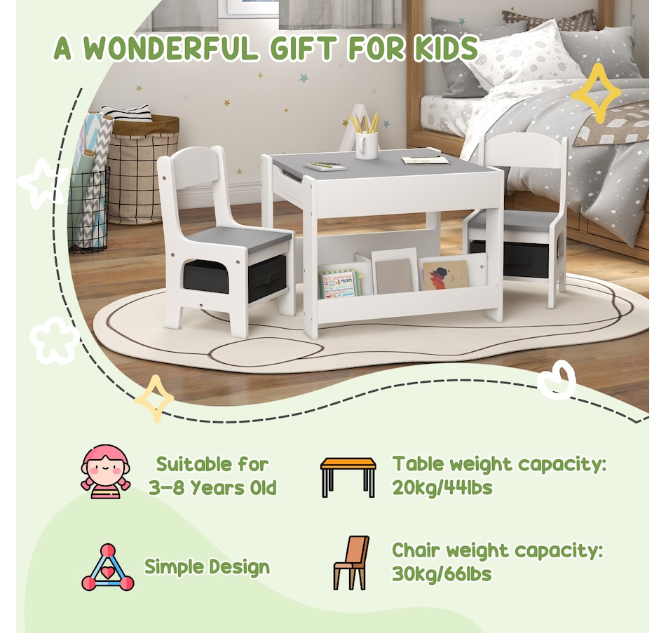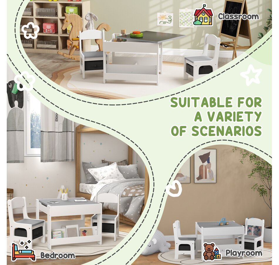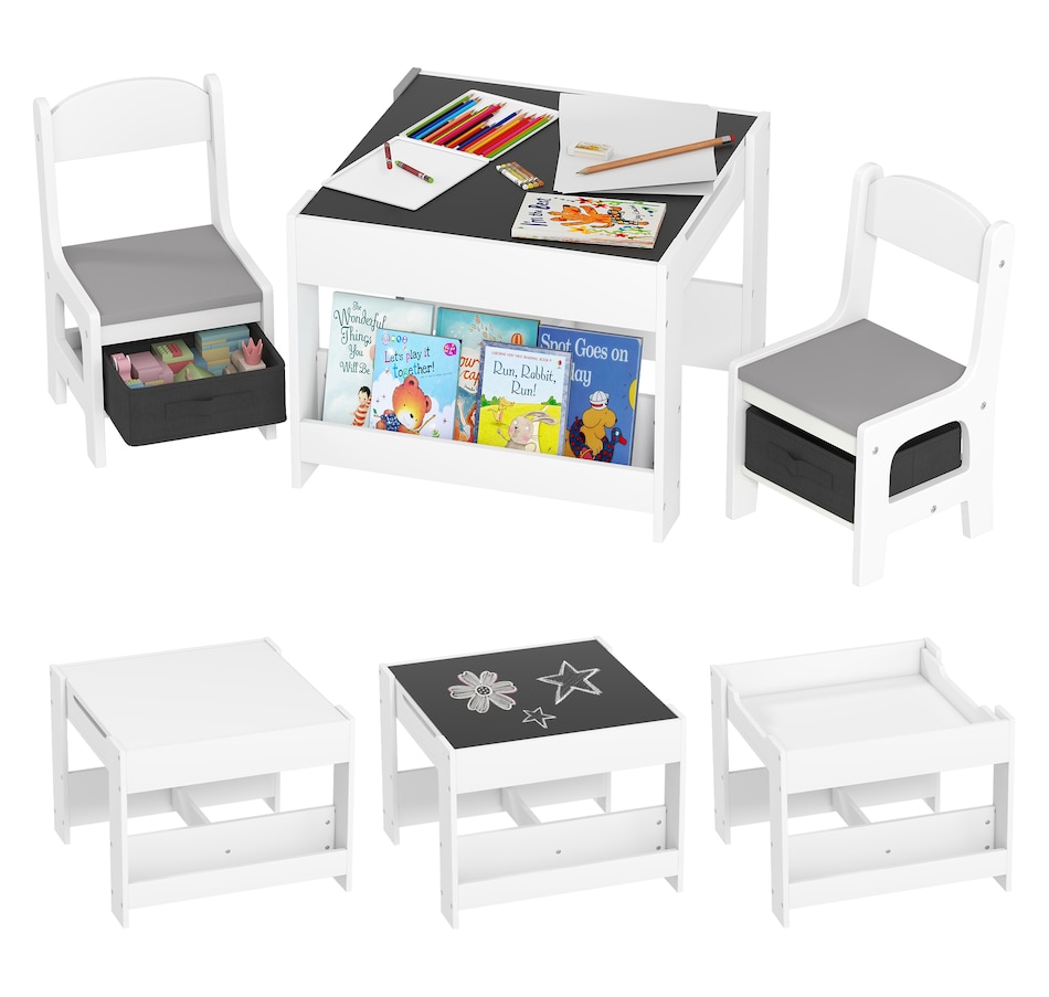 Transform your little one's space into a fun and creative hub with the Qaba Kids Table and Chair Set! This 3-piece ensemble, suitable for any nursery, classroom, or playroom, features a versatile 3-in-1 design with a flip-able tabletop for reading and drawing. Plus, it boasts ample storage solutions including a hidden compartment, drawers, and a bookshelf. Dive into a world of imagination with this delightful toddler table and chair set!