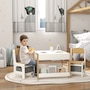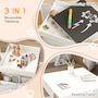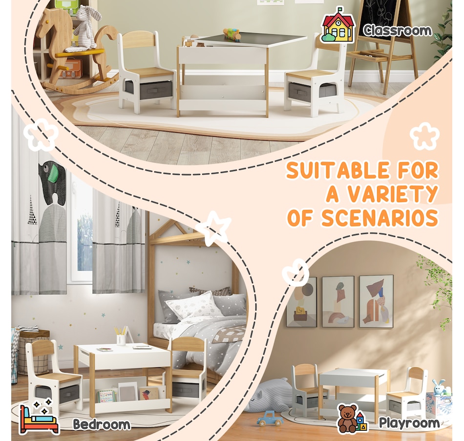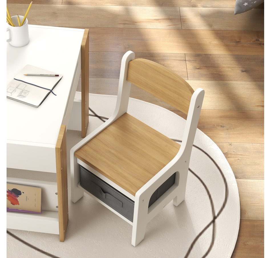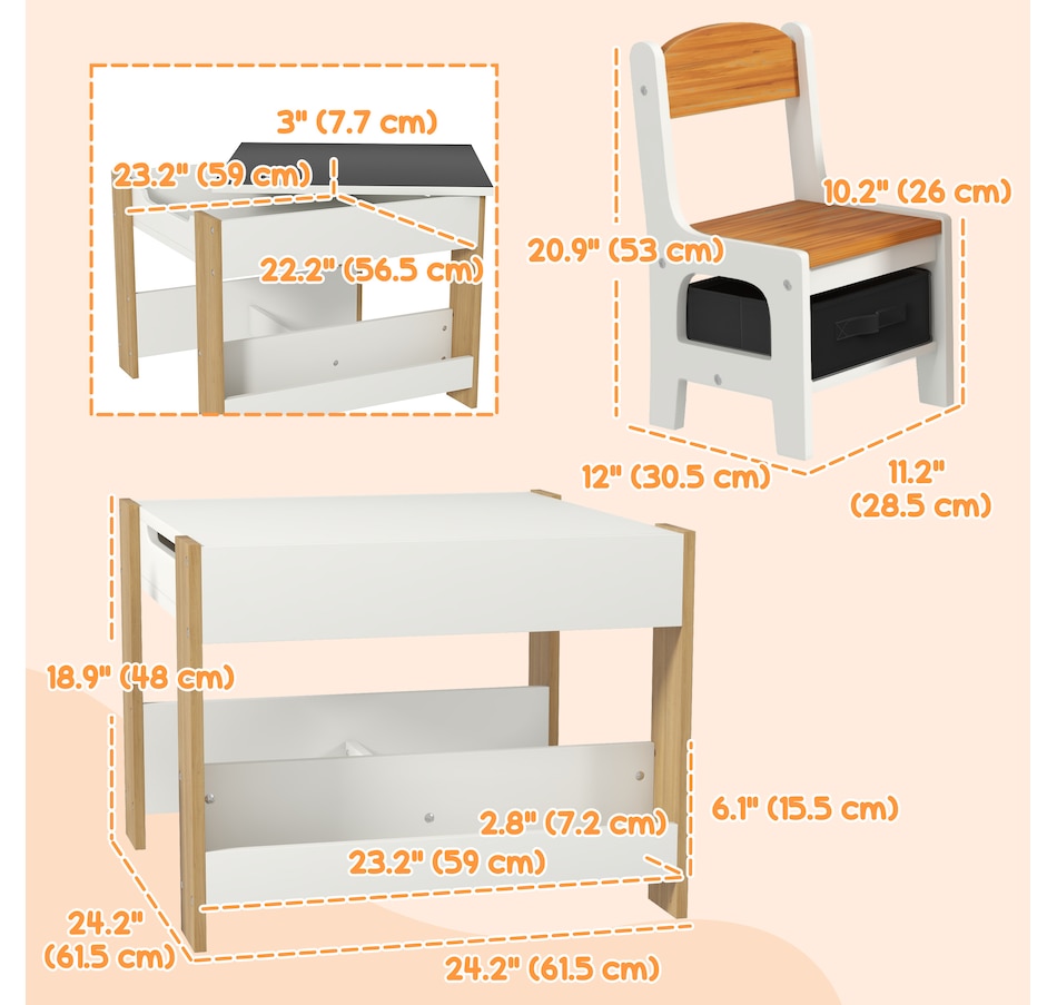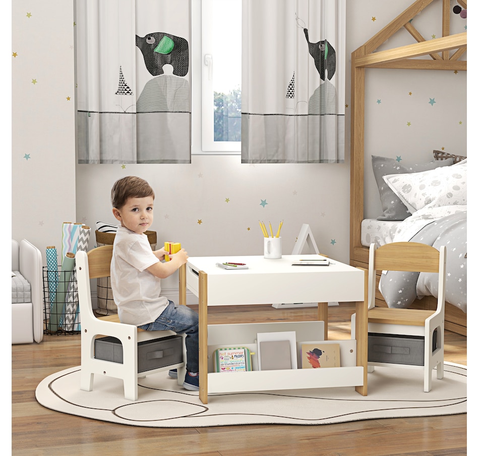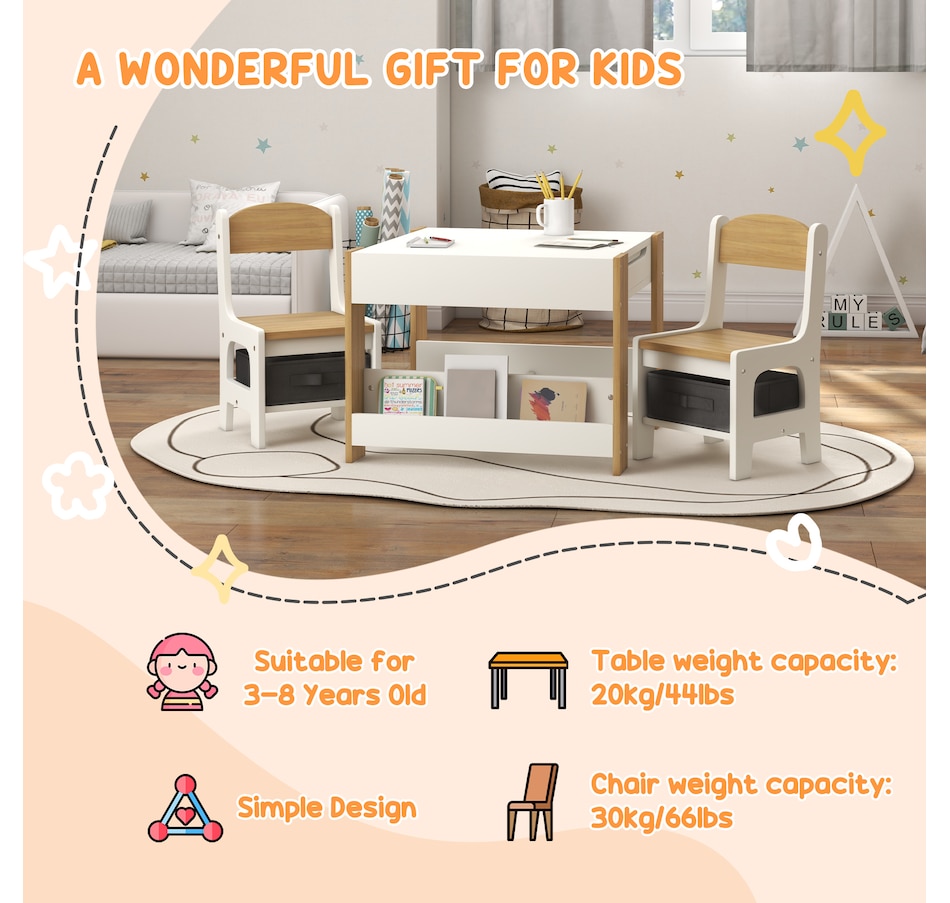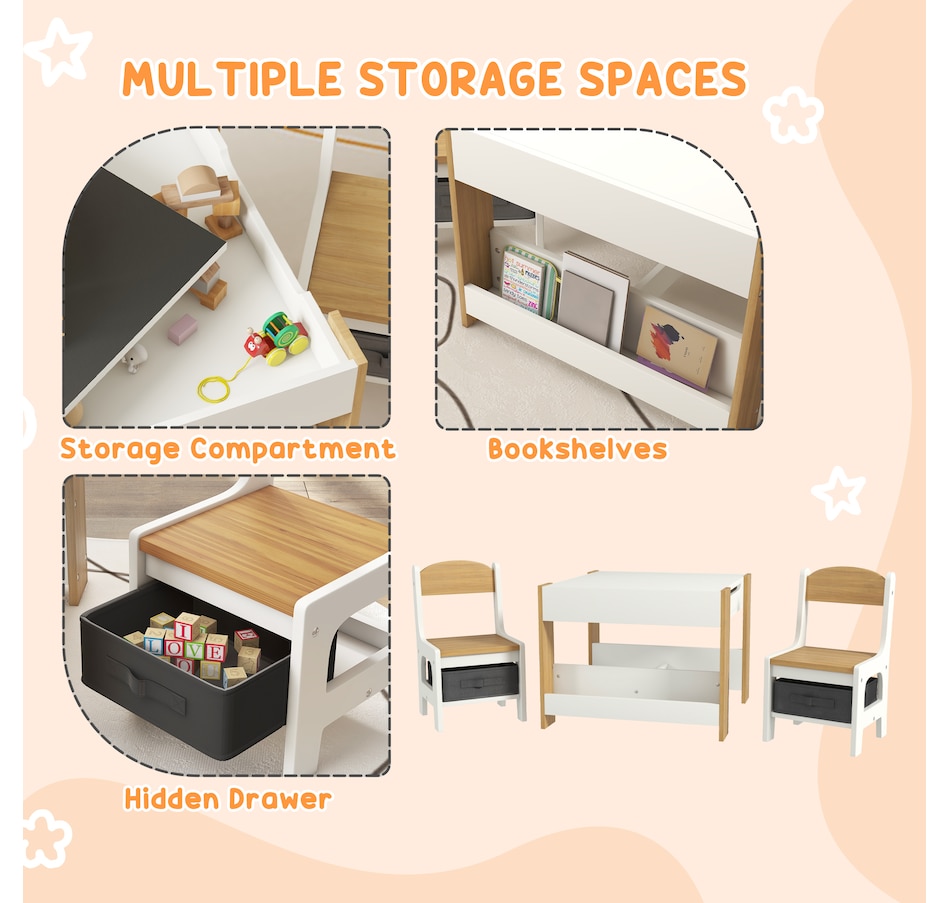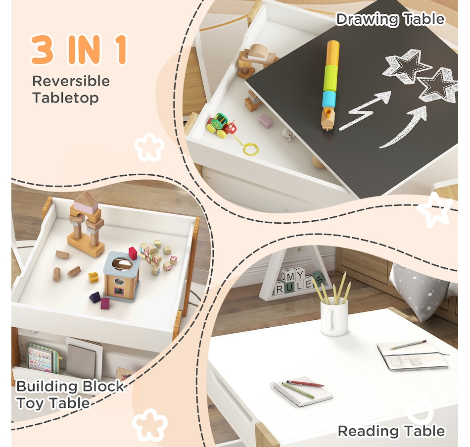 Transform your little one's space into a fun and creative hub with the Qaba Kids Table and Chair Set! This 3-piece ensemble, suitable for any nursery, classroom, or playroom, features a versatile 3-in-1 design with a flip-able tabletop for reading and drawing. Plus, it boasts ample storage solutions including a hidden compartment, drawers, and a bookshelf. Dive into a world of imagination with this delightful toddler table and chair set!