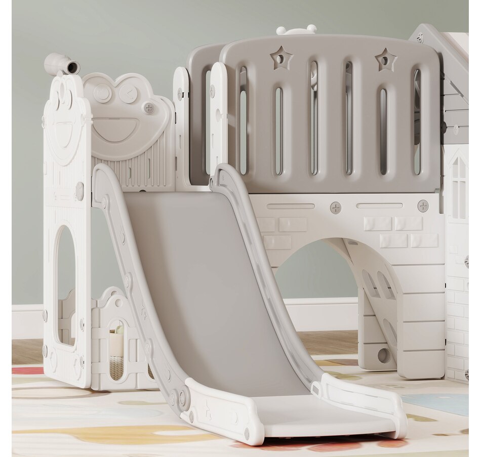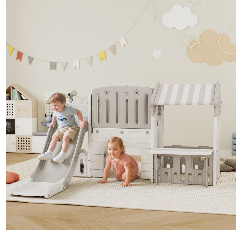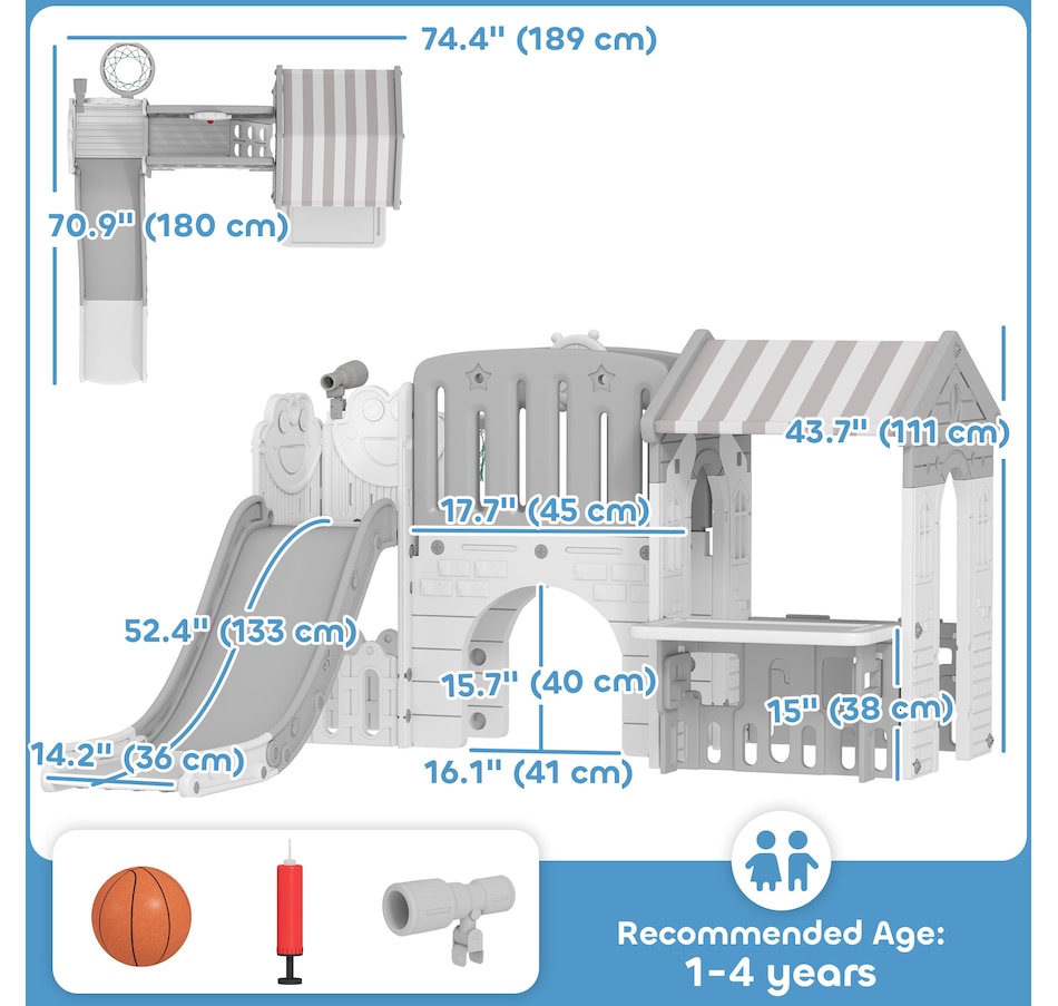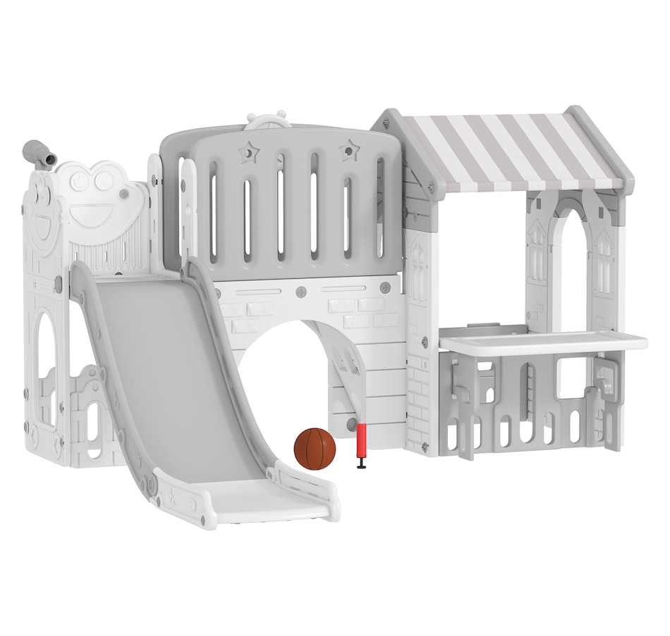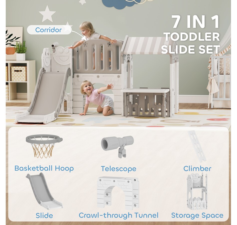 7-in-1 Toddler Slide with Playhouse and Basketball Hoop, Kids Slide Climber Playset for Indoor Play, Grey