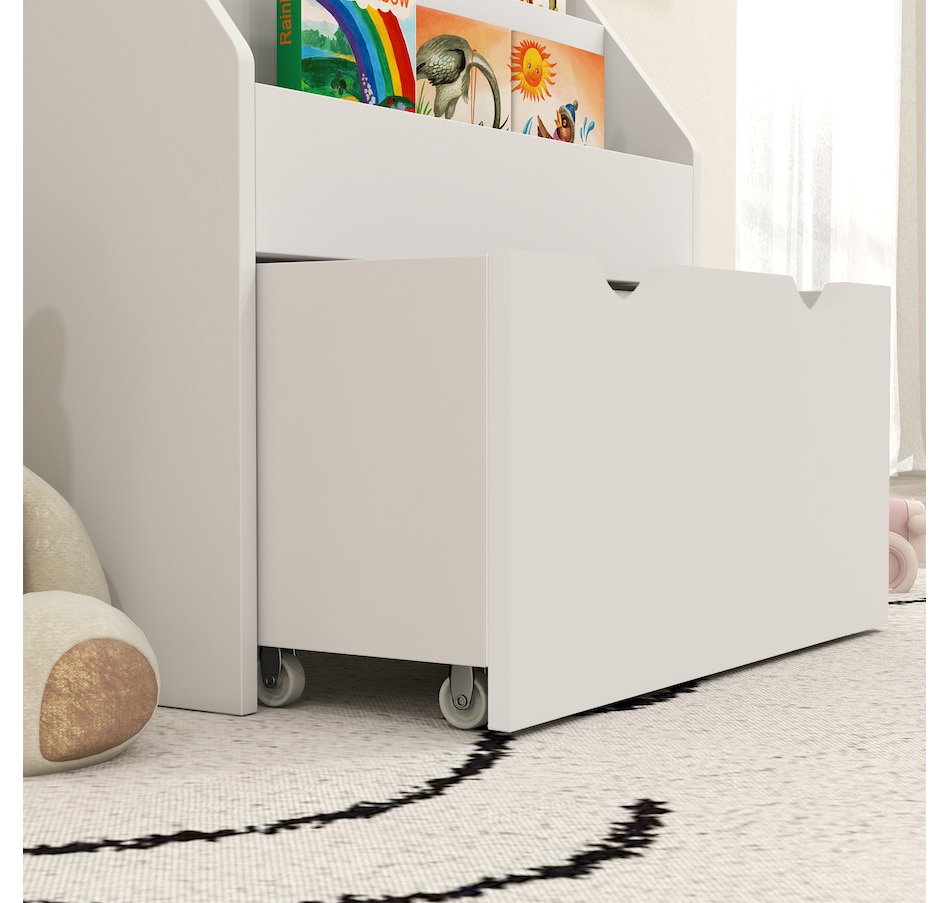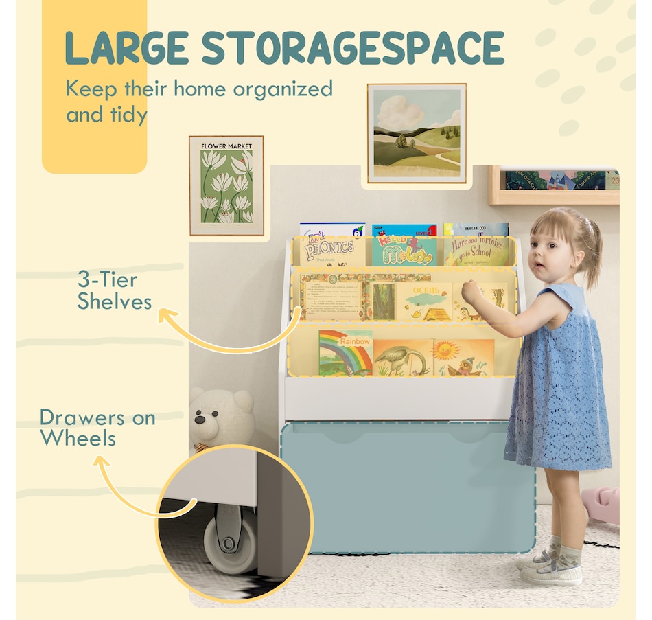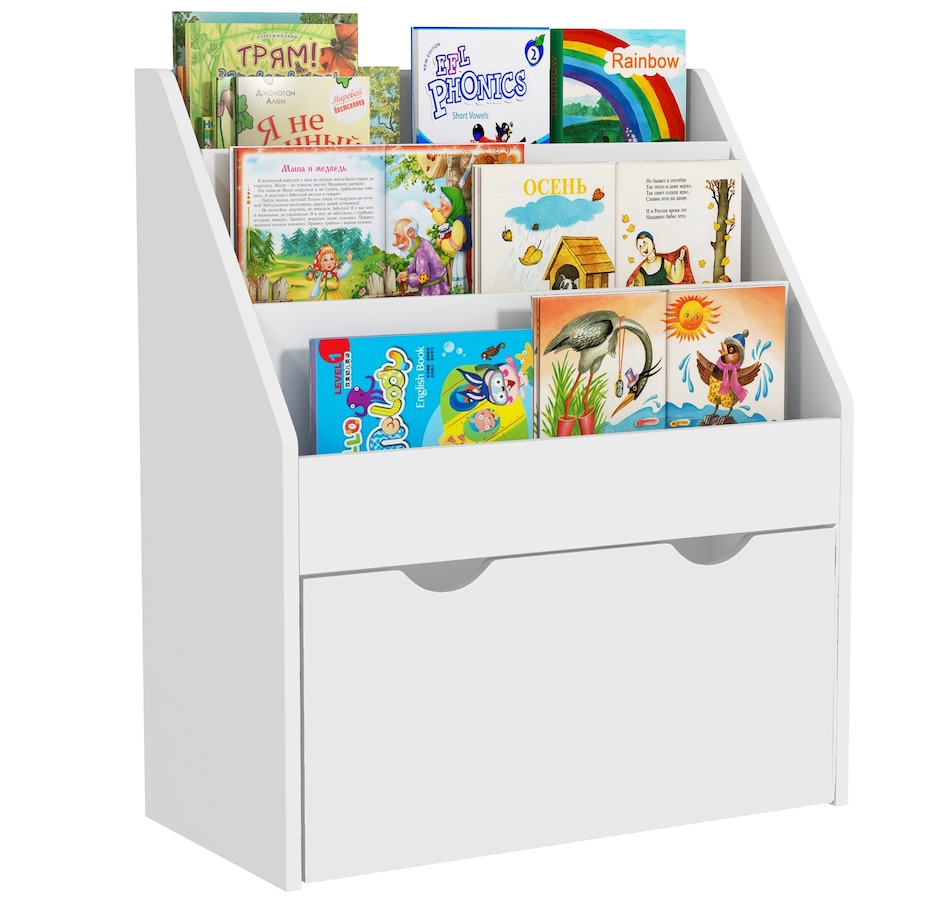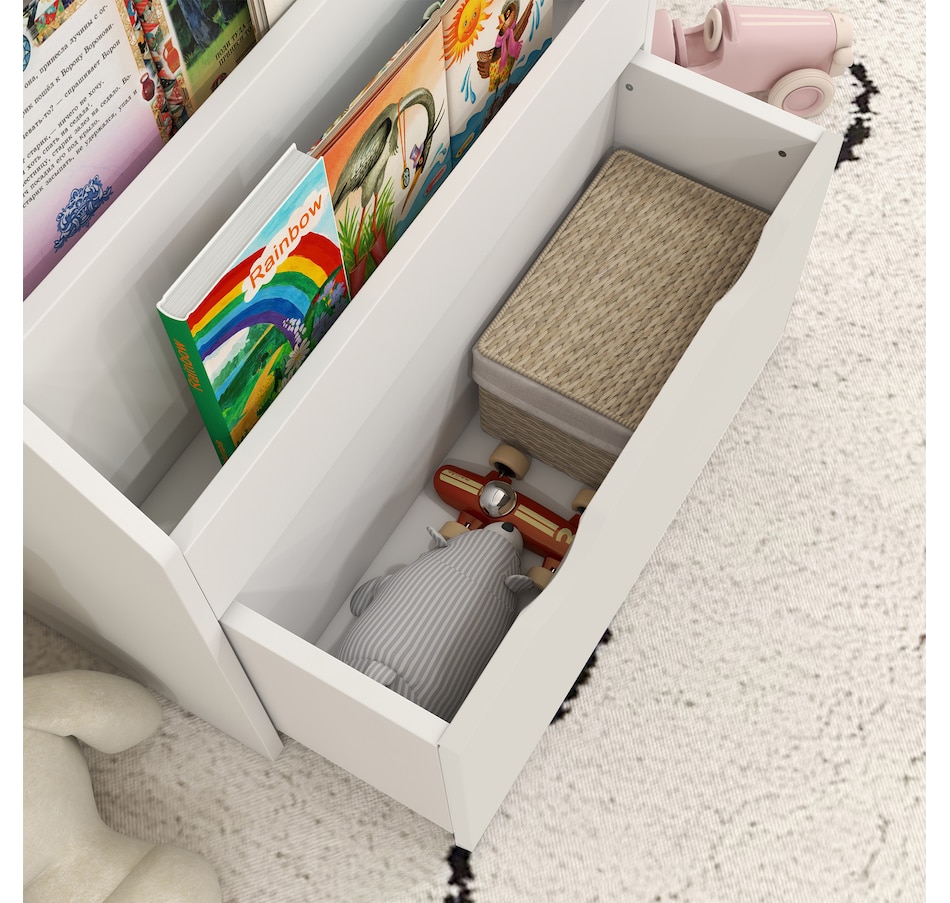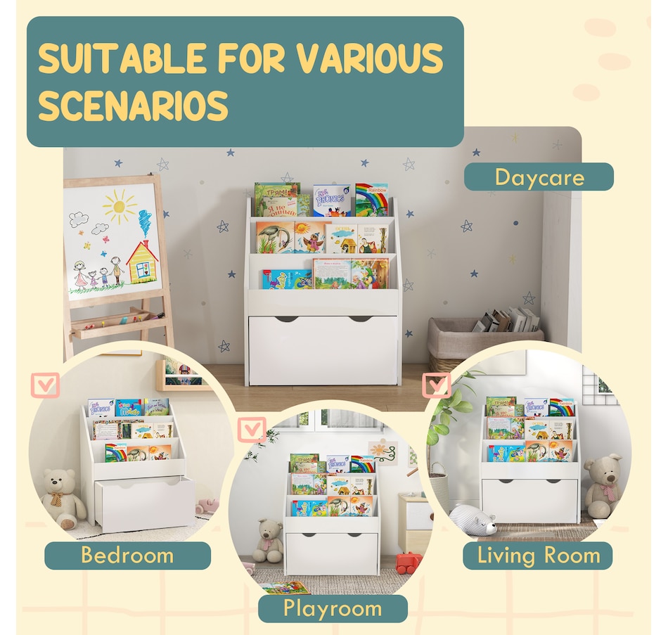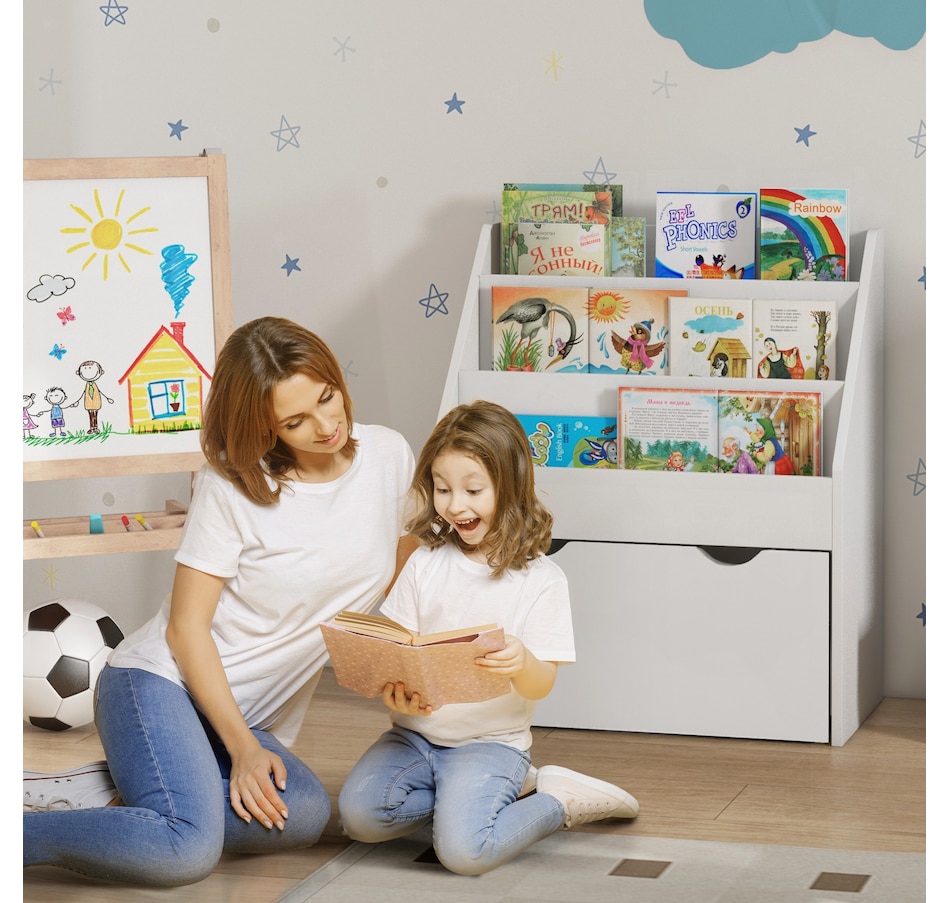 Kids Bookshelf with 3 Tier Display Shelves, Drawer for Nursery, White