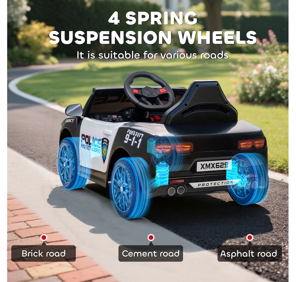 Picture your child cruising through the park in the Qaba kids police car, feeling like a true hero. With dual driving modes, kids can steer independently or parents can take control using the 2.4G remote, providing safety and peace of mind. It features secure seat belts, shock absorbers, and smooth acceleration, offering a safe and thrilling outdoor adventure.Features: