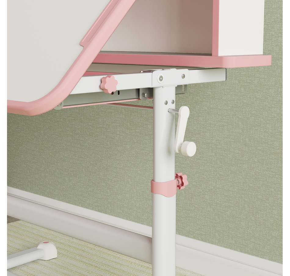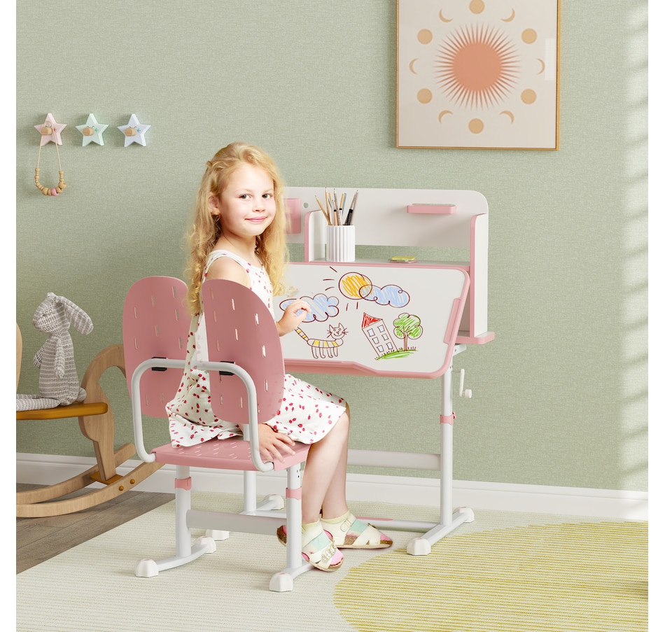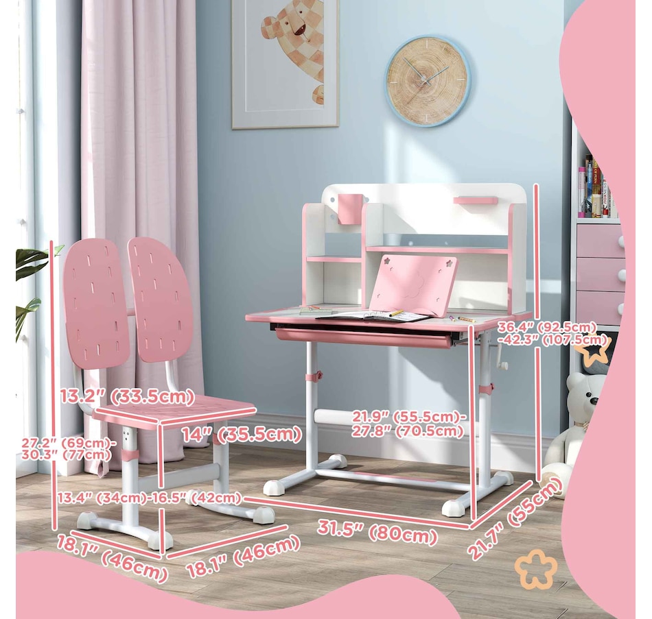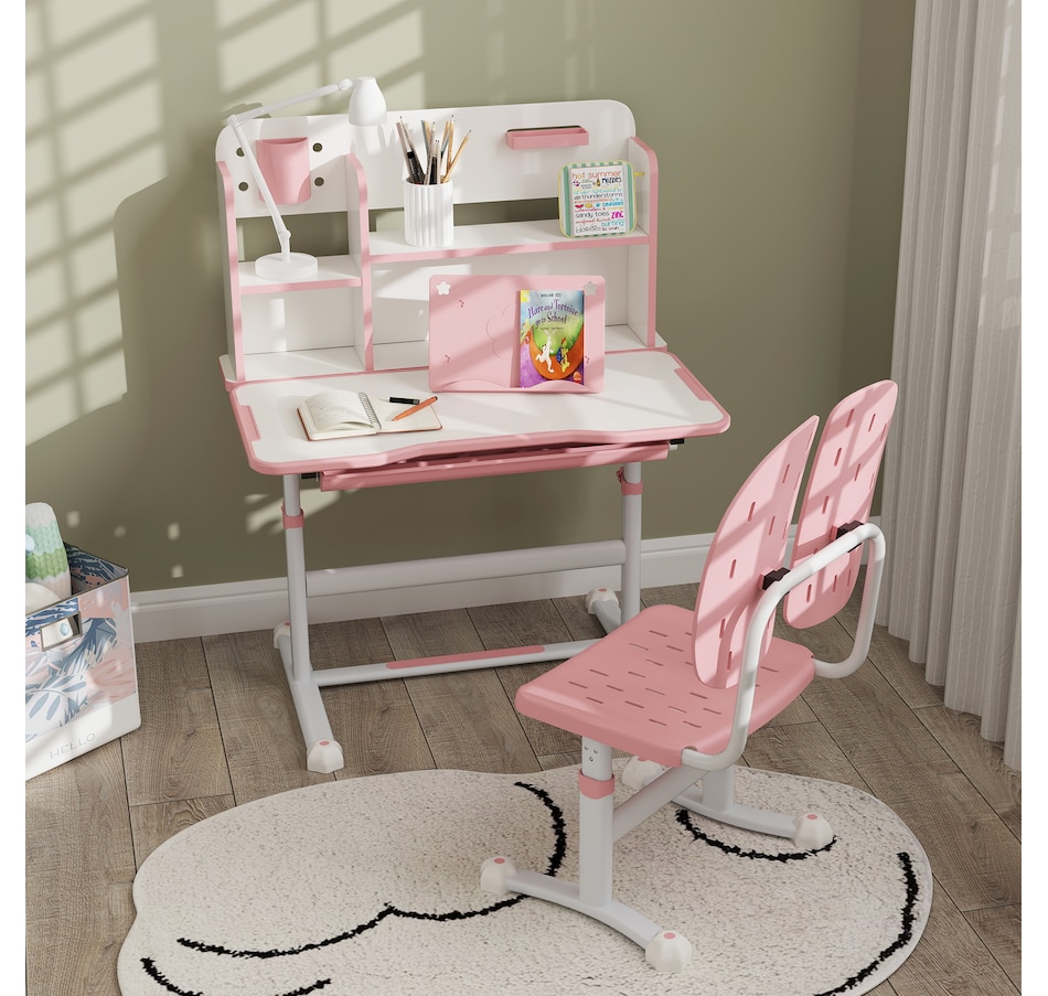 A dedicated space for little ones, this kids desk and chair set is great for studying, projects or just general play for ages 3-12 years. You can adjust the table and chair to their height, while the tiltable tabletop encourages good posture during long periods of sitting. With bookshelves, a pull-out drawer and a reading rack, everything stays organized, promoting productive learning and clutter-free playtime. It's their own spot to learn, grow and develop independently.Features: