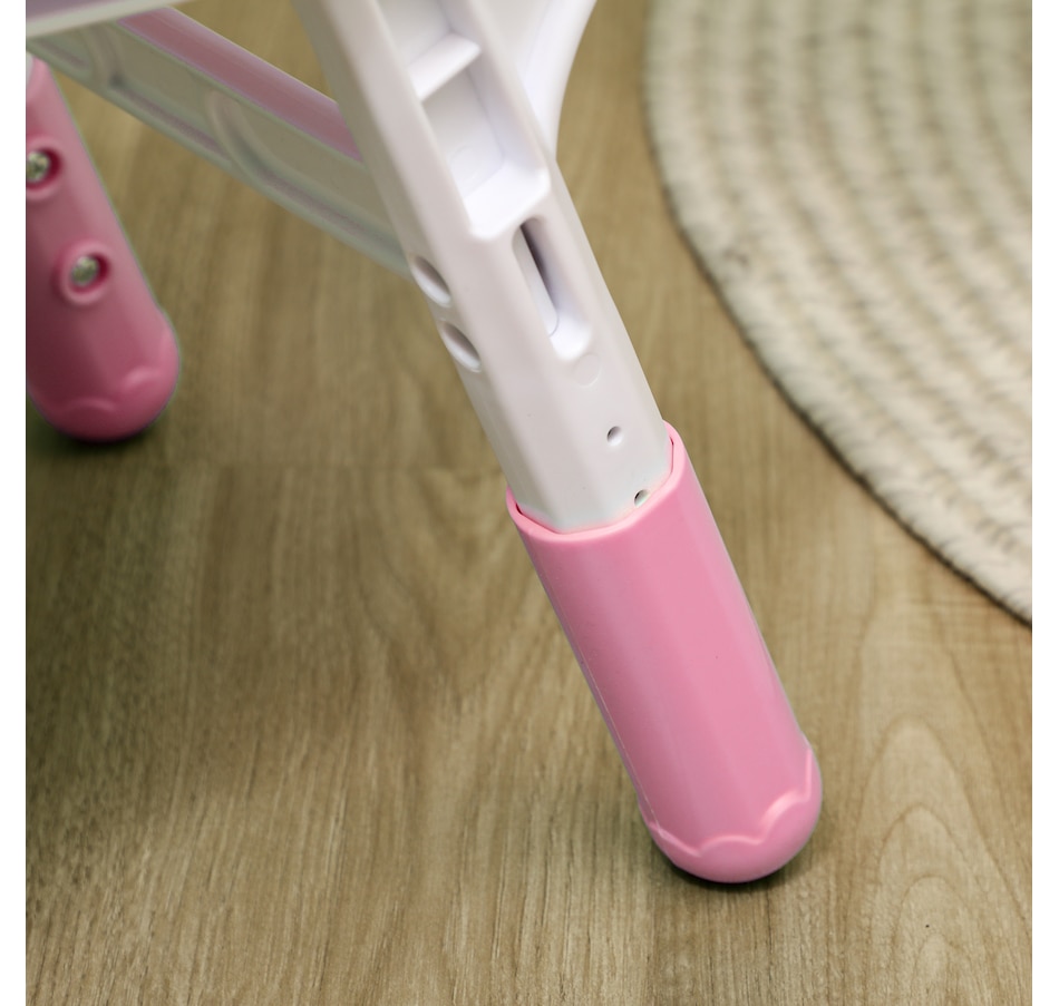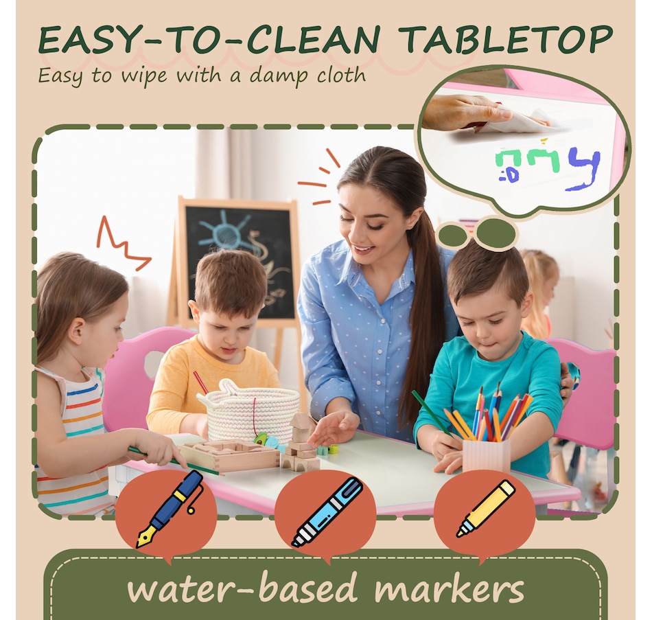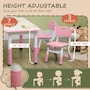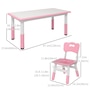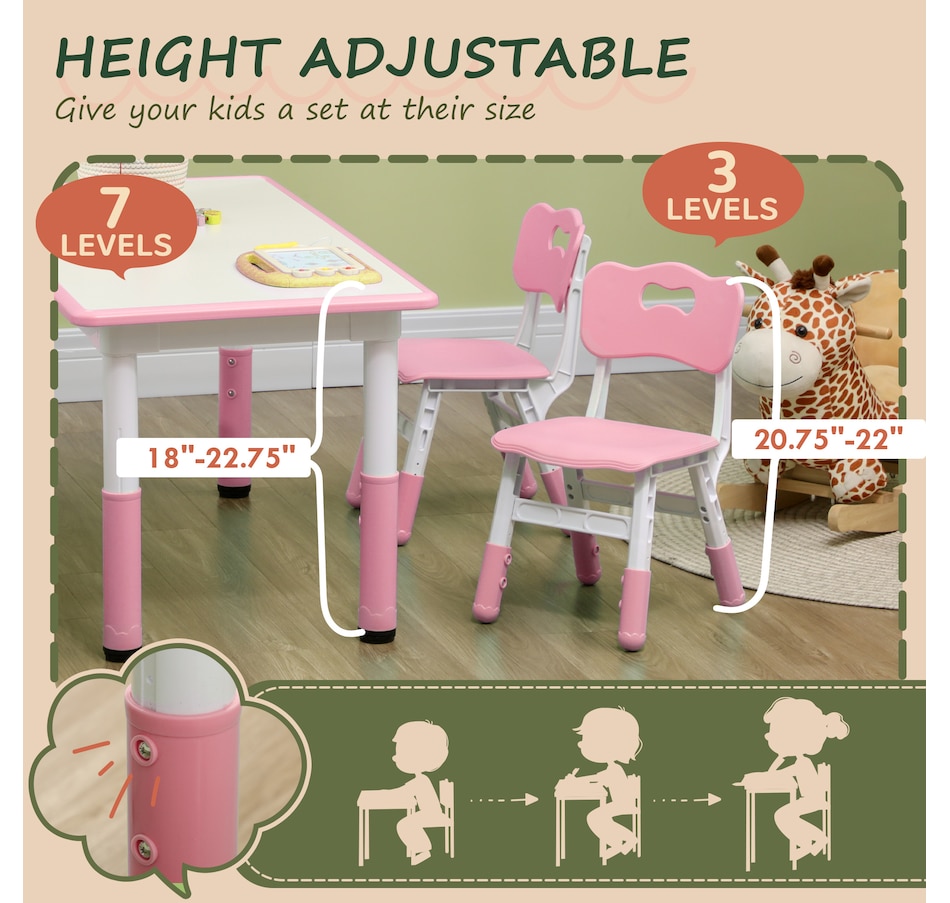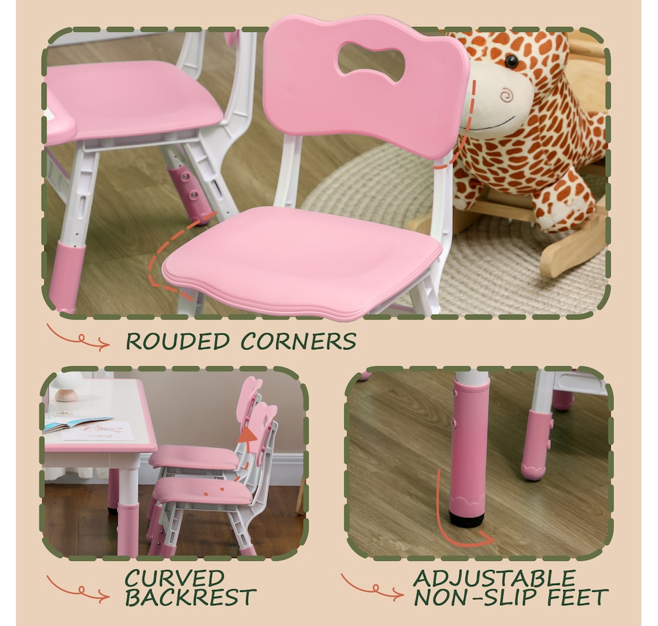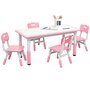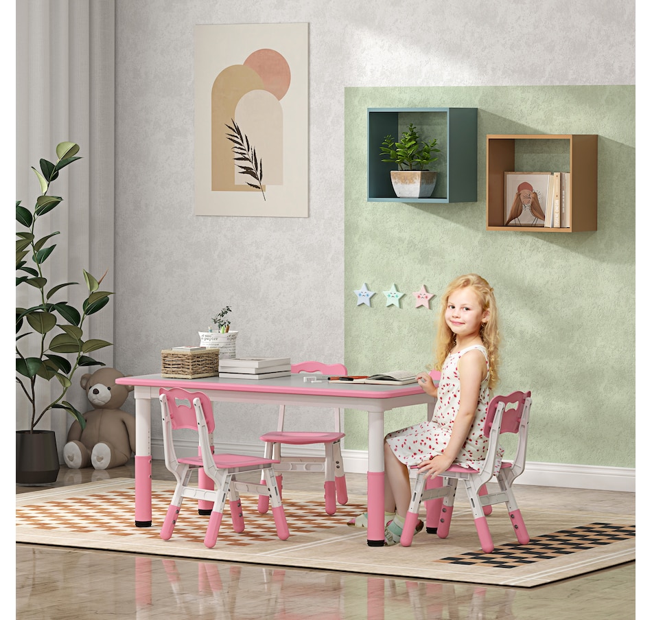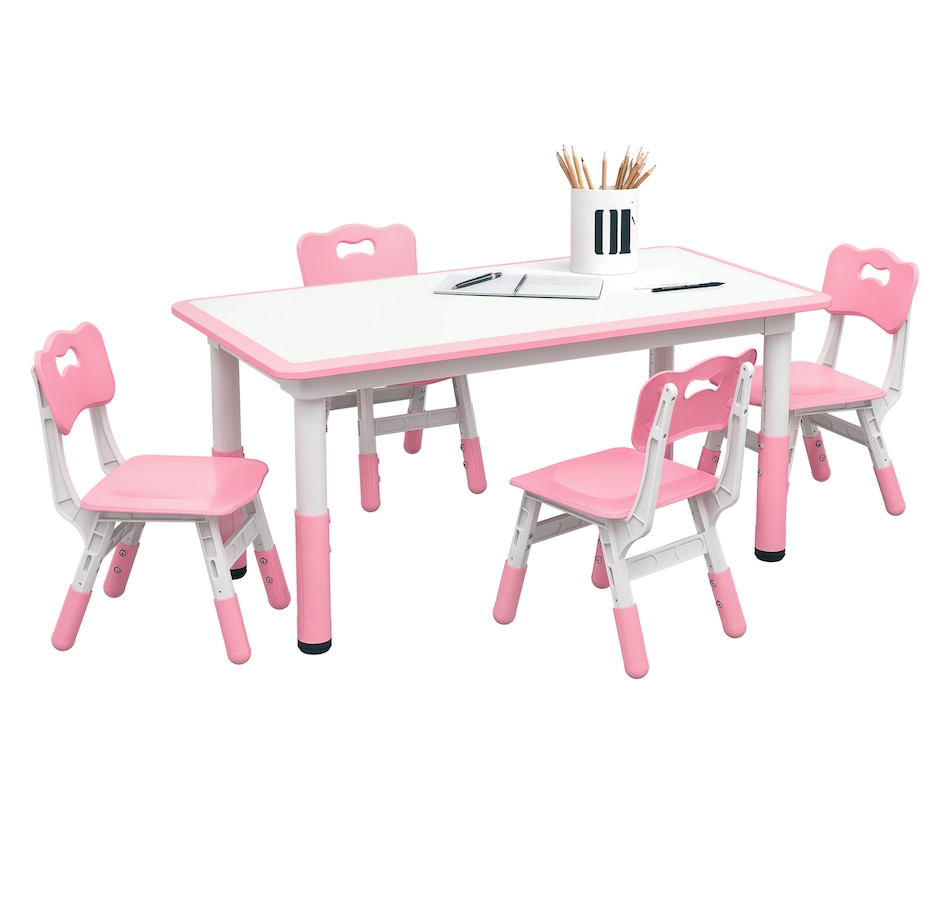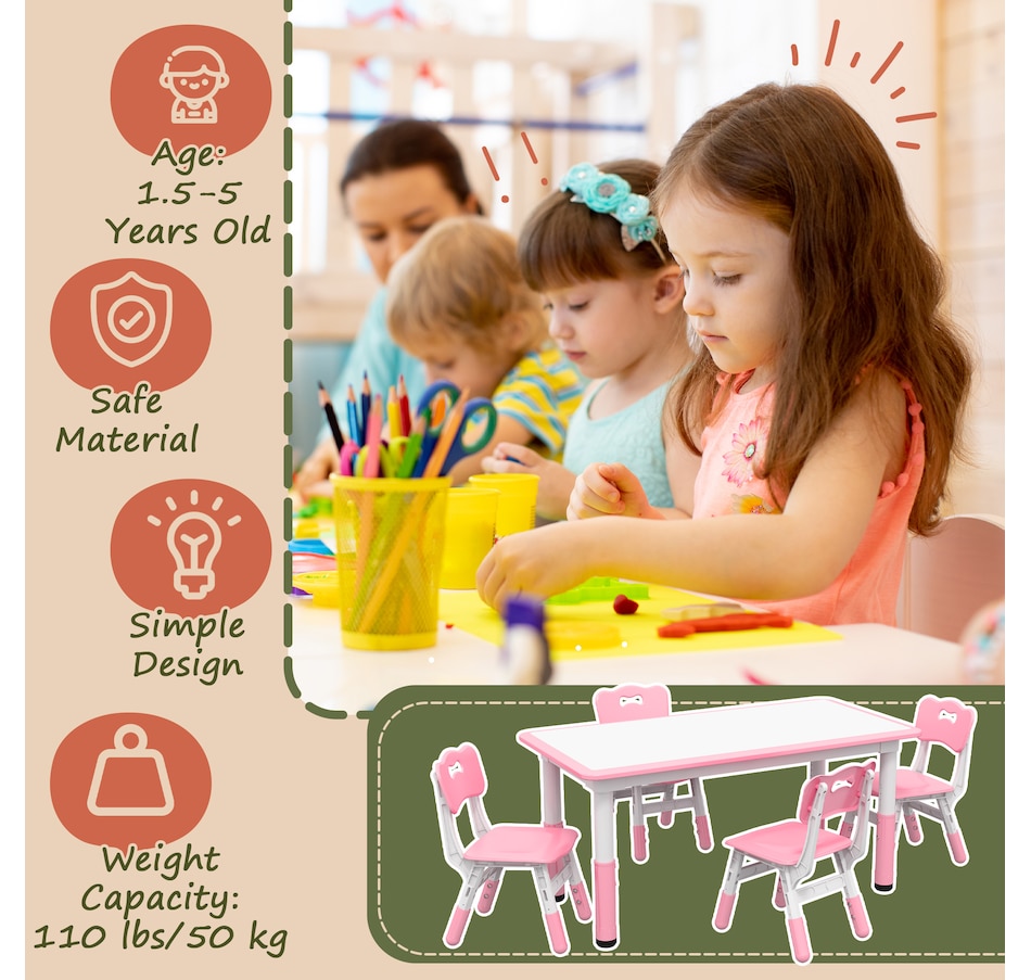 Welcome to the world of fun and creativity with the kids table and chairs set from Qaba! Designed for your child's enjoyment, this set includes a table and four chairs, great for play dates, homework sessions, and meals with friends. The adjustable height means that this set grows with your child, suiting their needs as they age. Your kids will feel like grown-ups with this feature, boosting their confidence and independence. The easy-to-clean surfaces allow for a hassle-free clean-up time.Features: