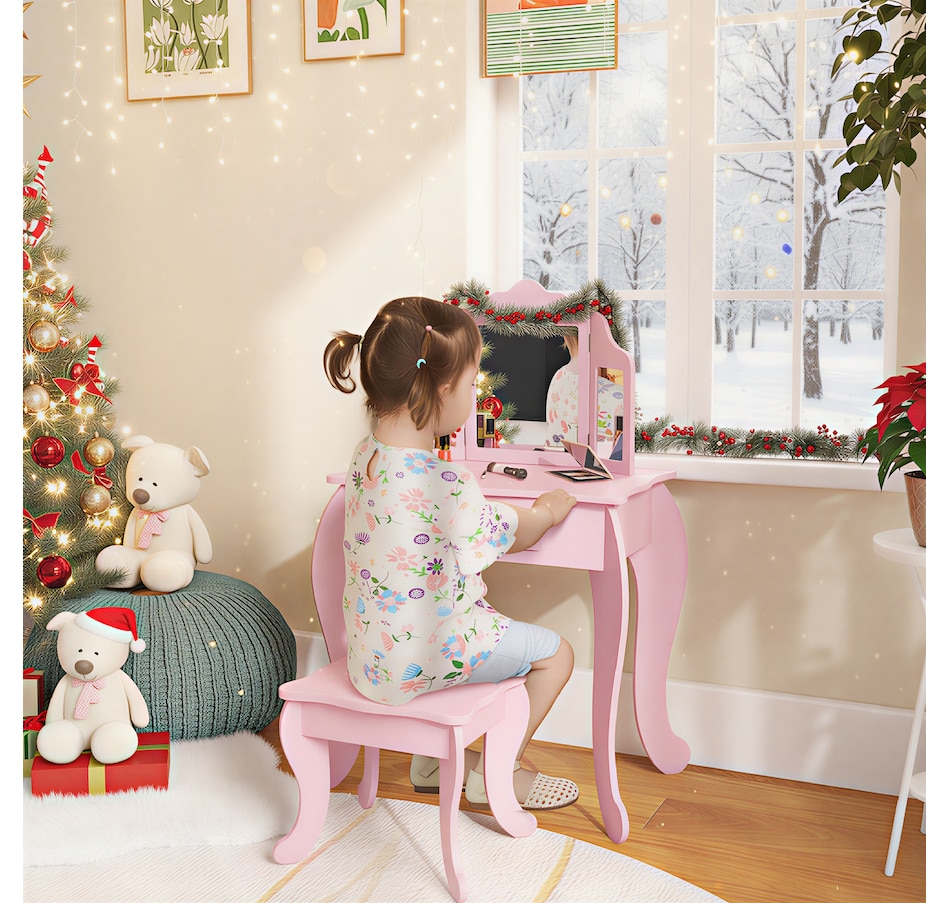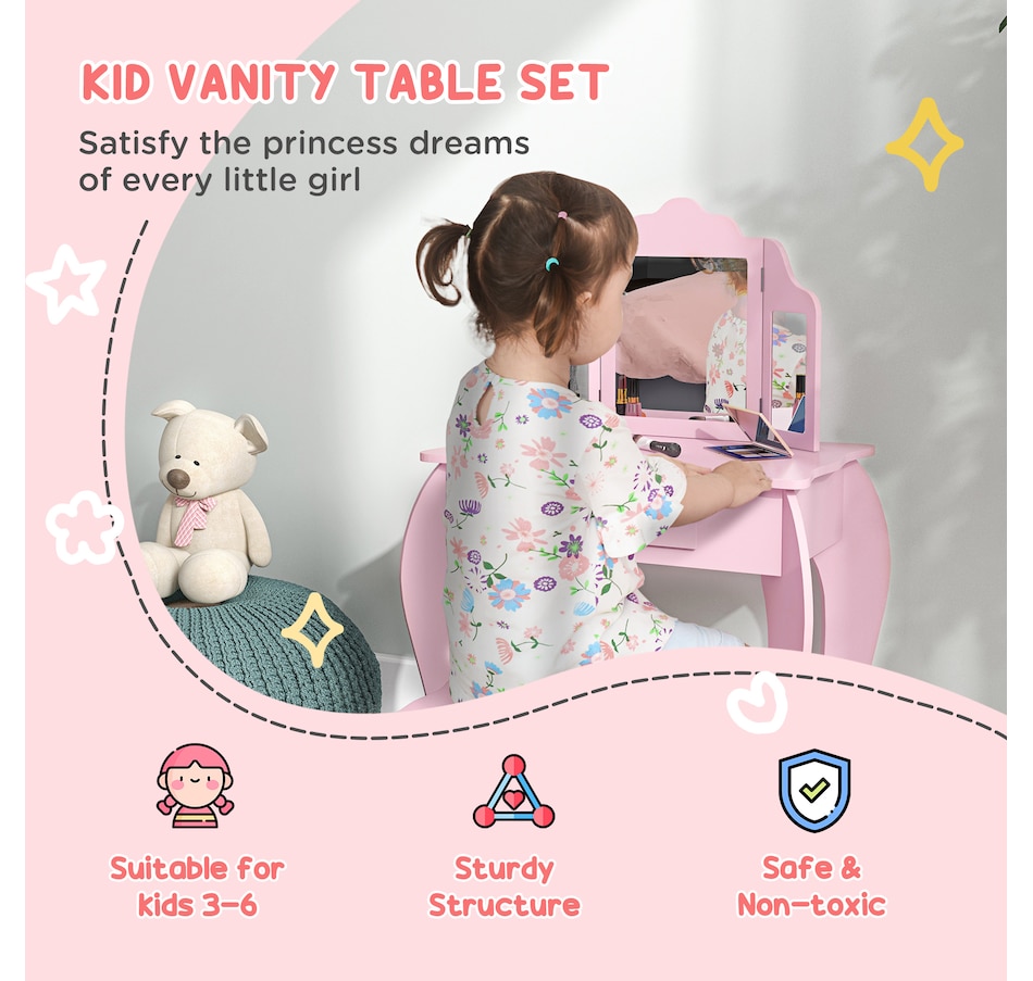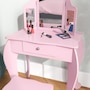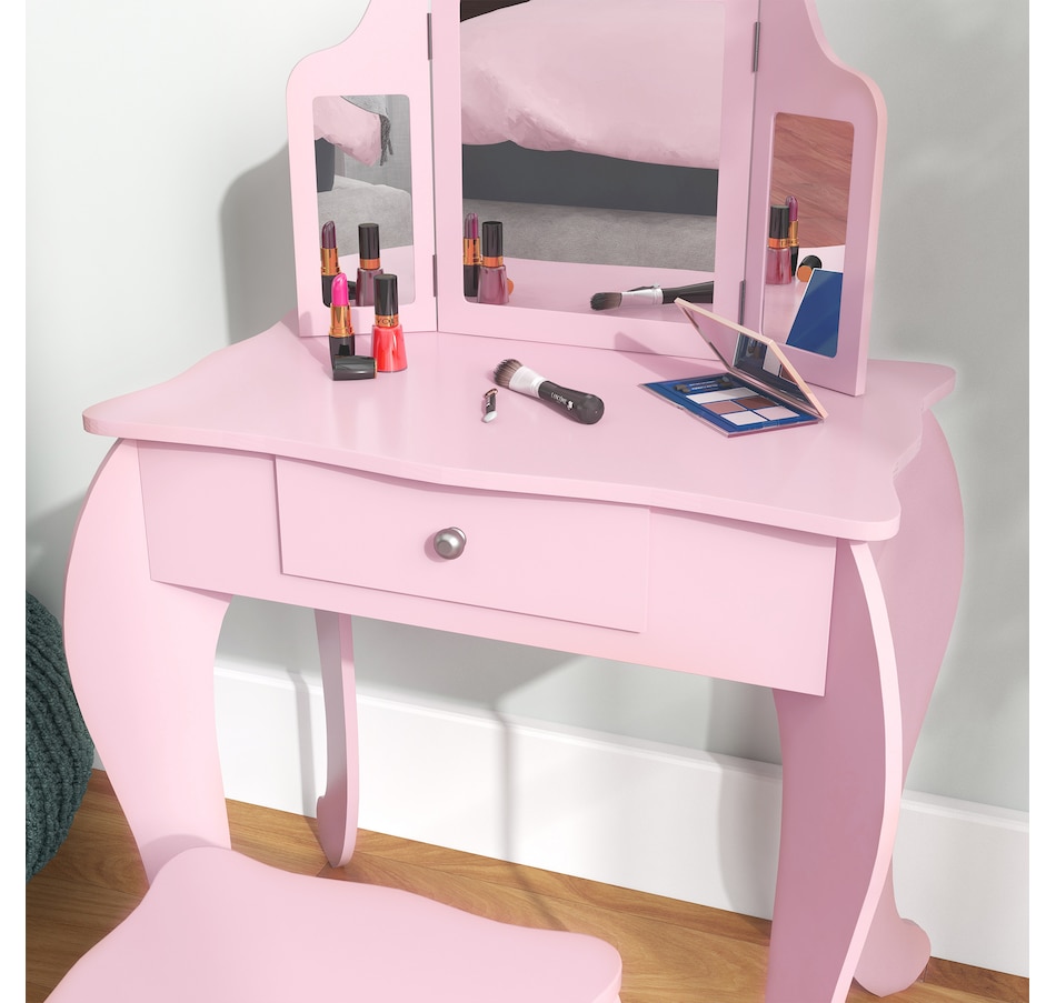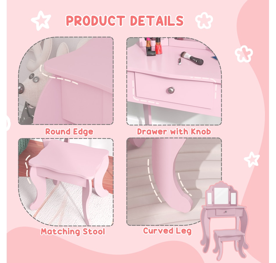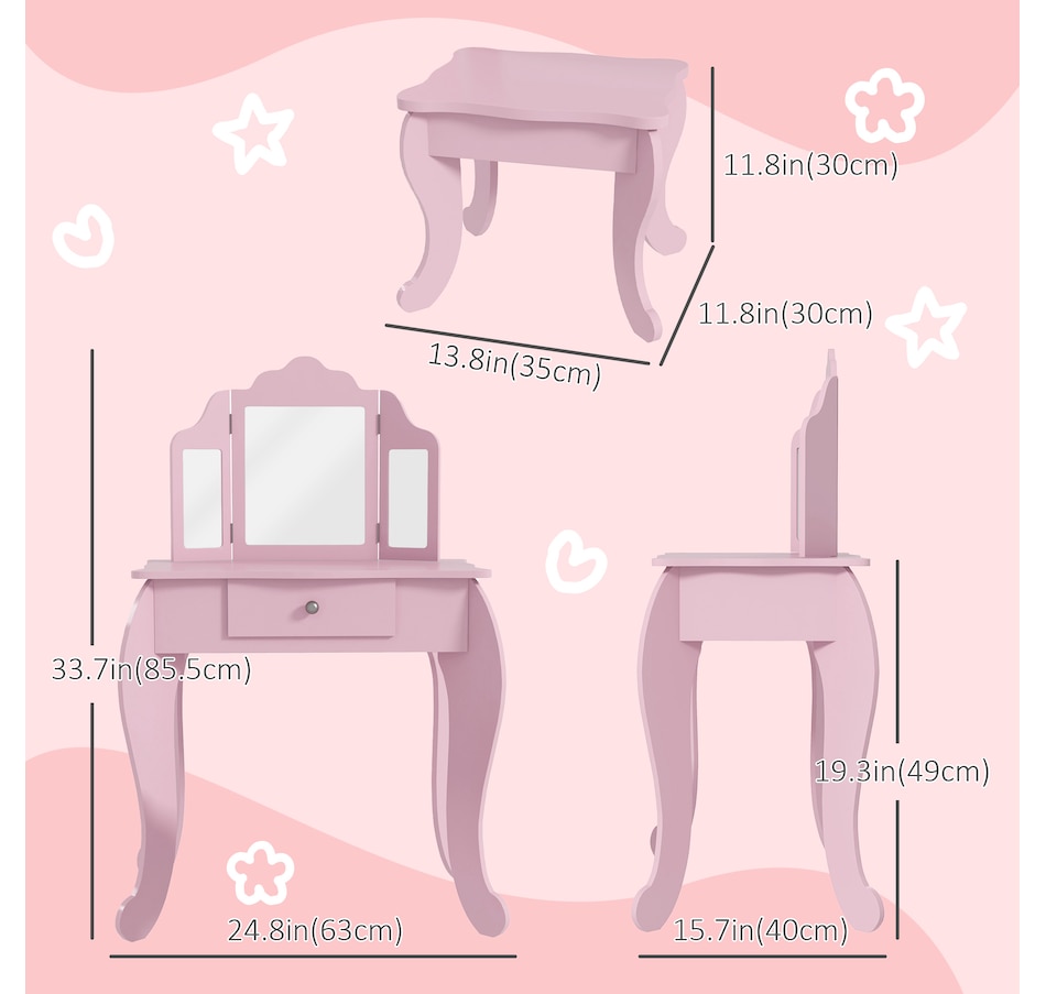 ● The 2 piece set includes a vanity makeup table and matching stool;