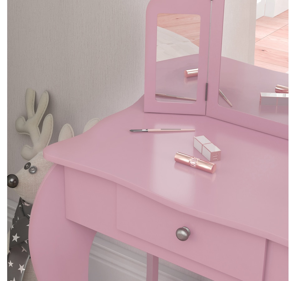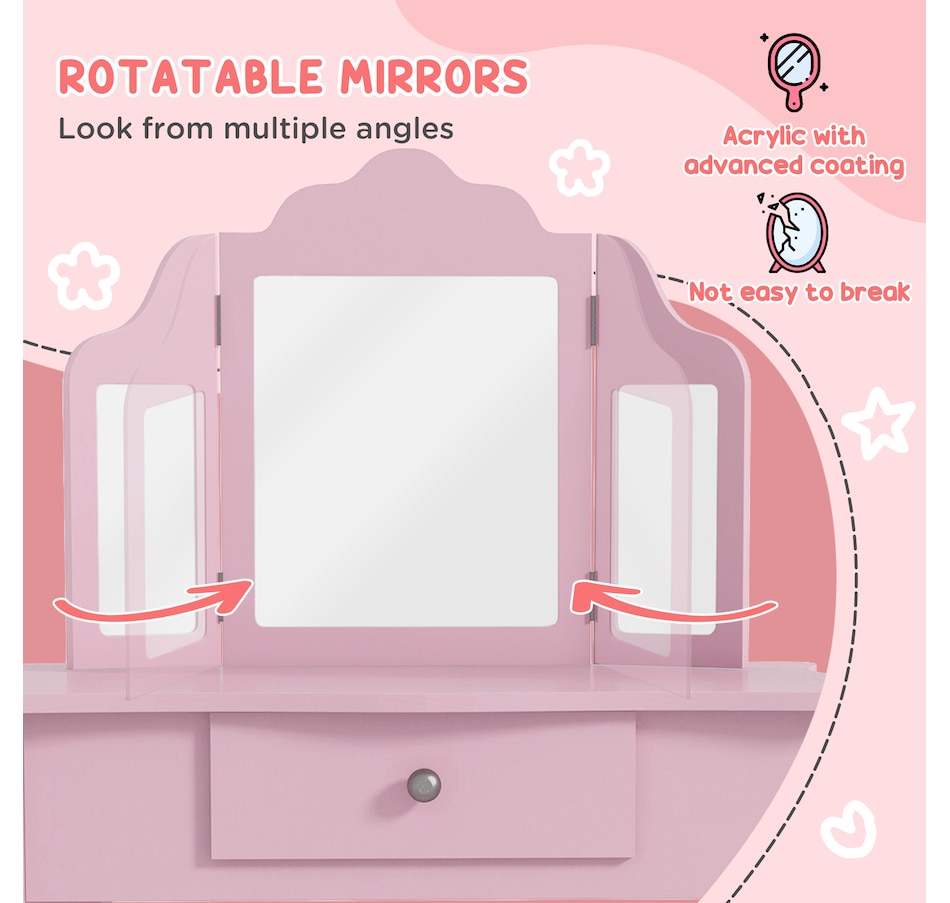 This Qaba dressing table is designed for kids, and is accompanied by a stool and mirrors. This set is an incredible item for your children to dress up, and work on as per convenience. Produced by the MDF board, the set offers added stability to the product. Completed in an extraordinary and inviting outline, this would suit almost any interior theme.