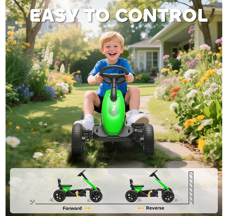 Picture your child confidently exploring the outdoors with the Qaba pedal go-kart. The all-terrain silent wheels bring a peaceful ride on any surface, while the robust design of strong plastic and solid steel provides parents with peace of mind. With easy pedal control, kids can independently navigate forward and backward, enhancing their motor skills and confidence during every garden adventure.Features: