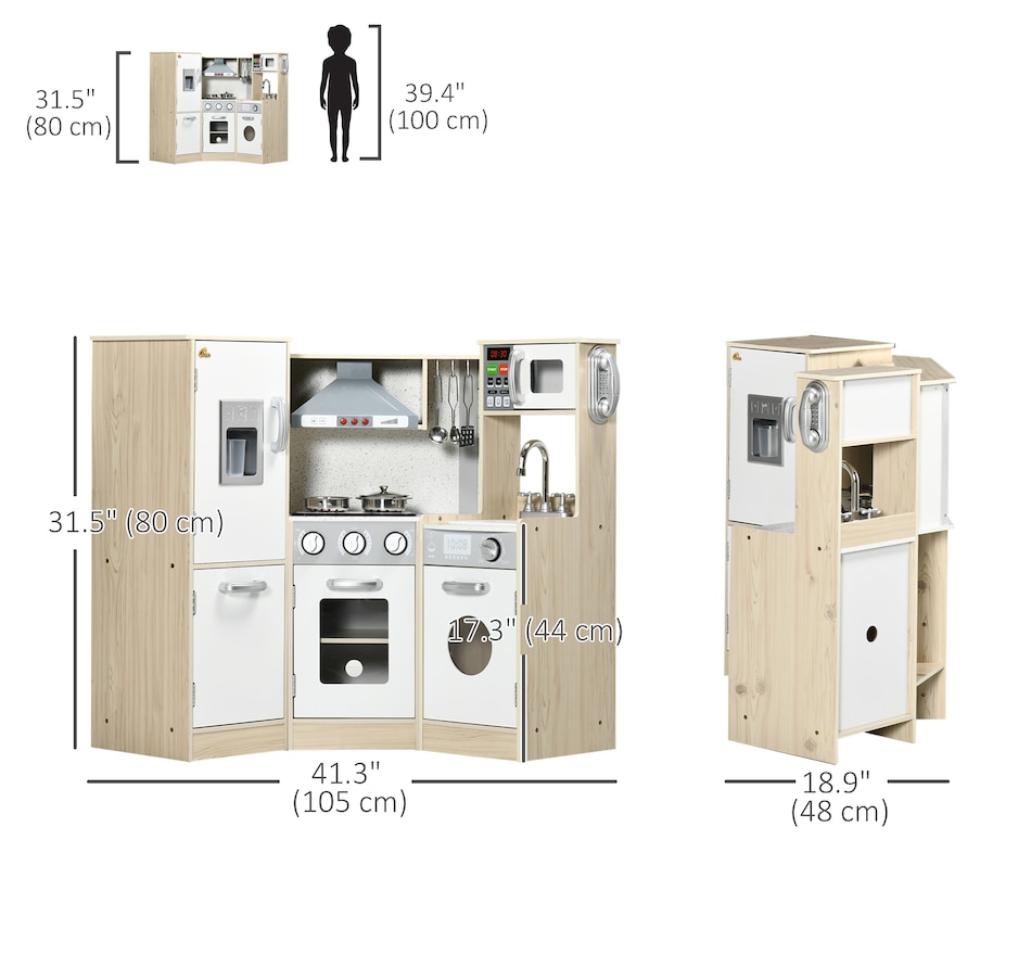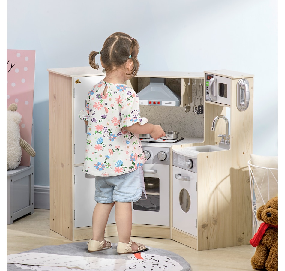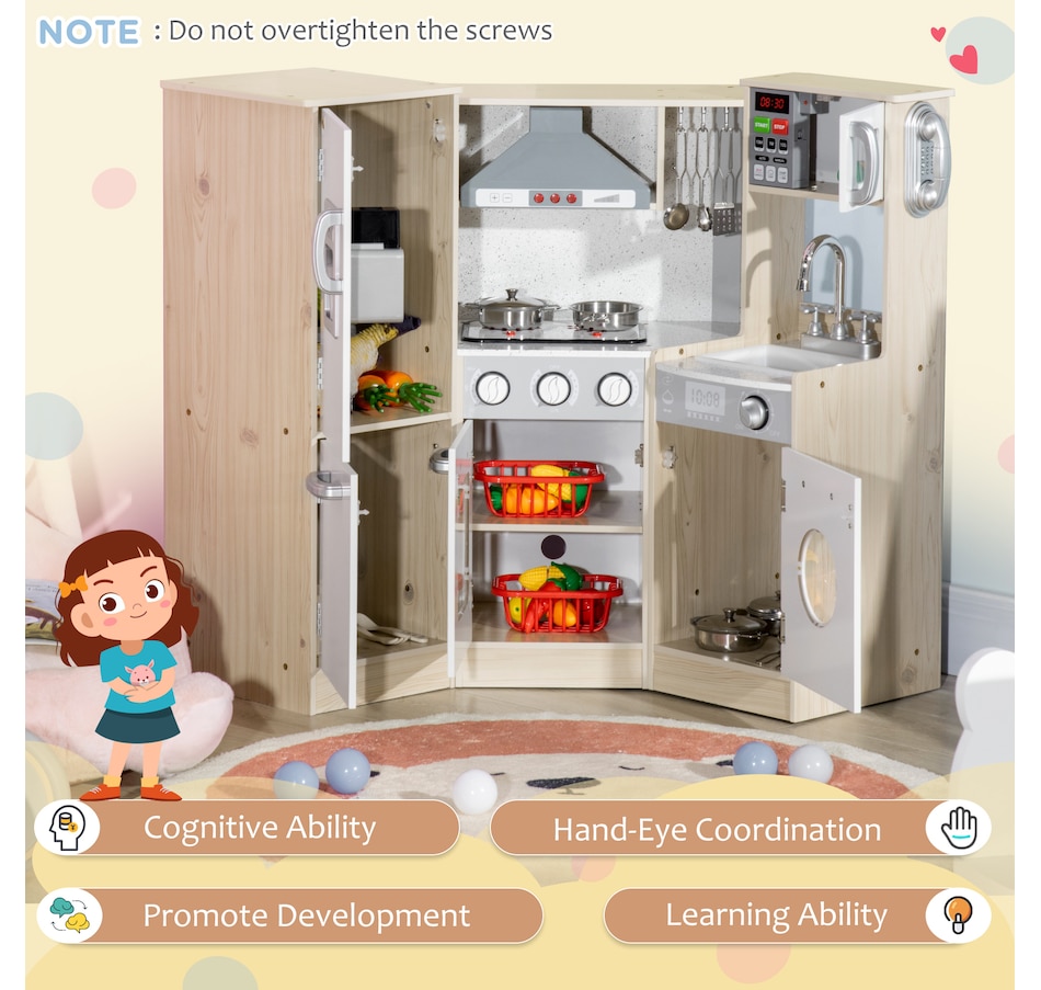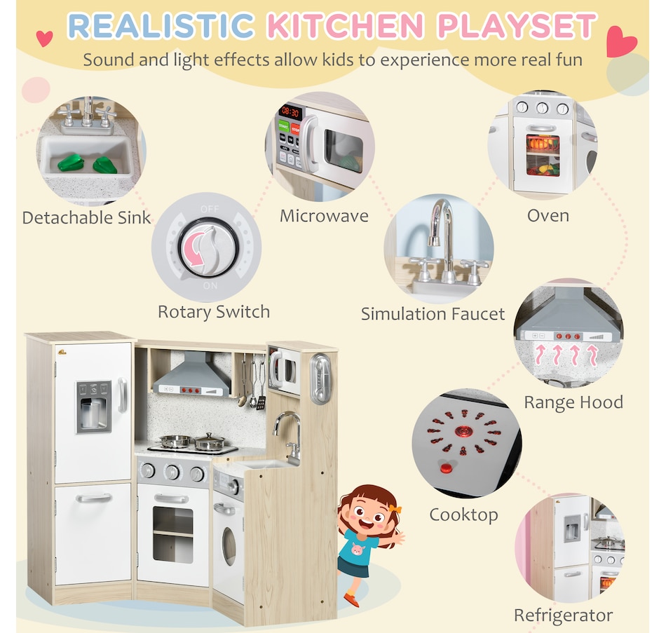Wooden Play Kitchen with Lights Sounds, Corner Kids Kitchen Playset