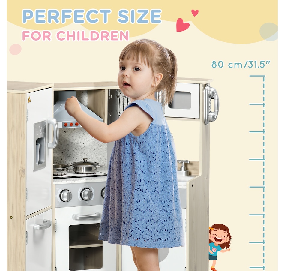 ● Full set of elements children can recognize from the kitchen they know, including a microwave, refrigerator, oven, range hood, ice maker, and sink;