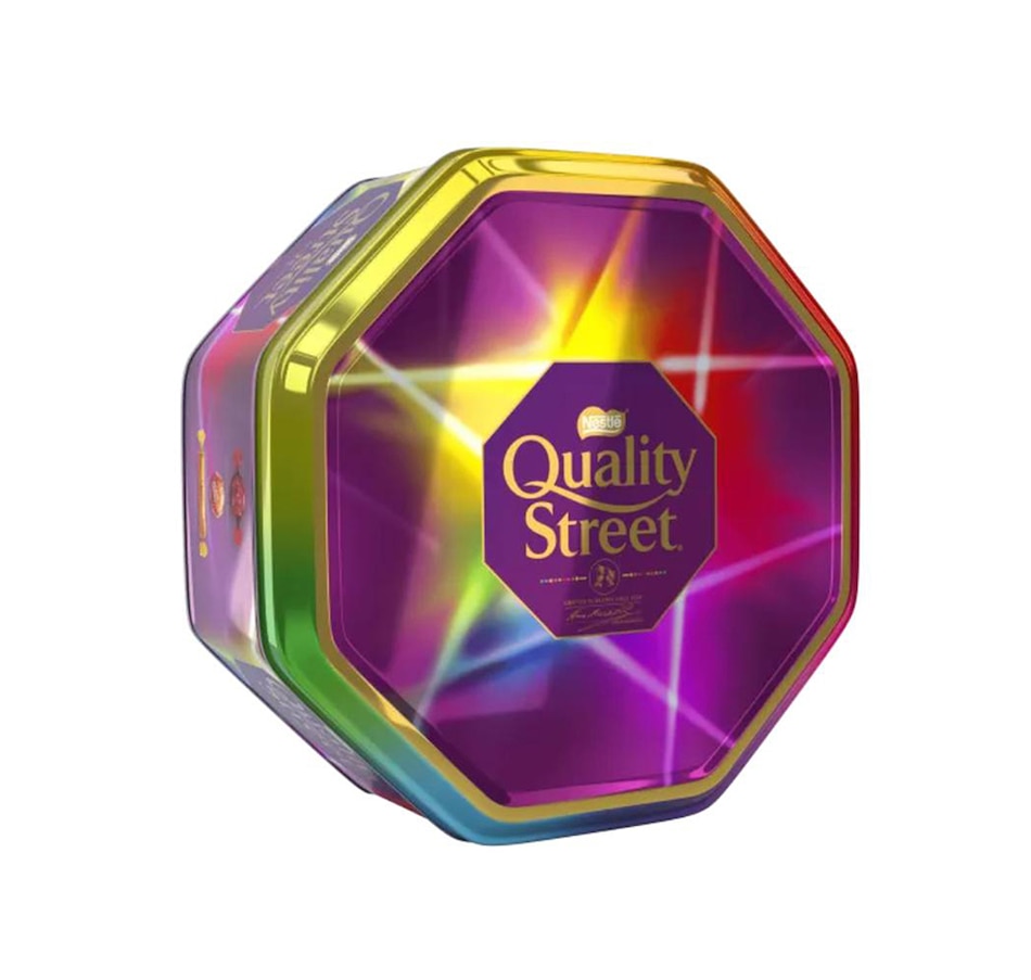 This Quality Street tin contains a variety of rich, intense chocolates and toffees in iconic shapes, wrapped like sparkling jewels, and containing no artificial colours, flavours, preservatives or hydrogenated vegetable oils.