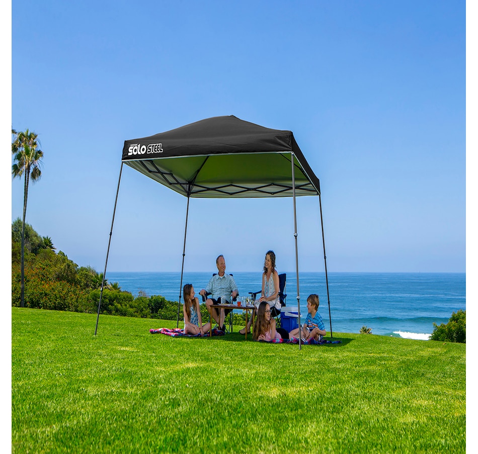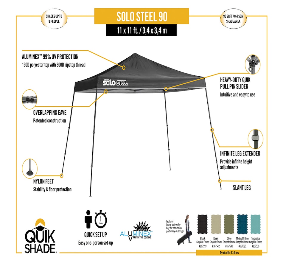 Quik Shade's Solo Steel 90 Canopy is an attractive slant leg edition that shades up to eight people and provides up to 90 square feet of shade. This top of the line, high quality pop-up canopy is portable and made from durable and top quality materials. With multiple height positions, you'll choose the canopy height that fits your needs, and with easy one person assembly!