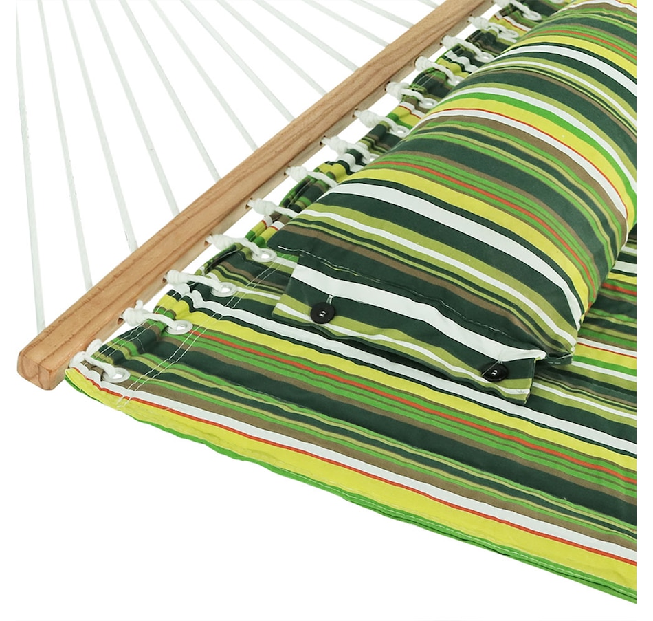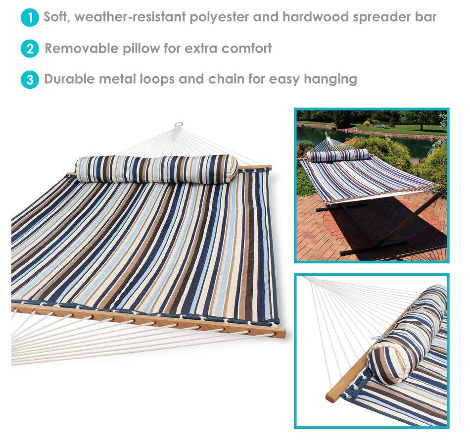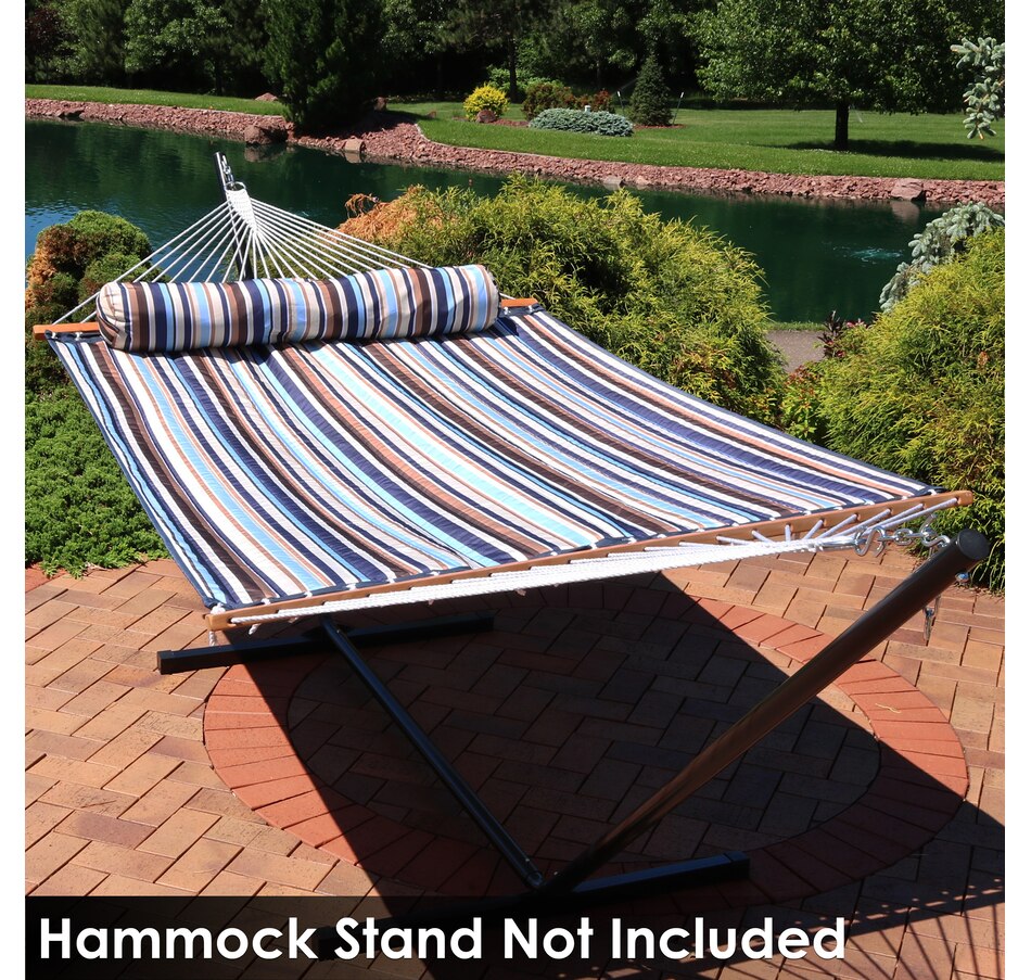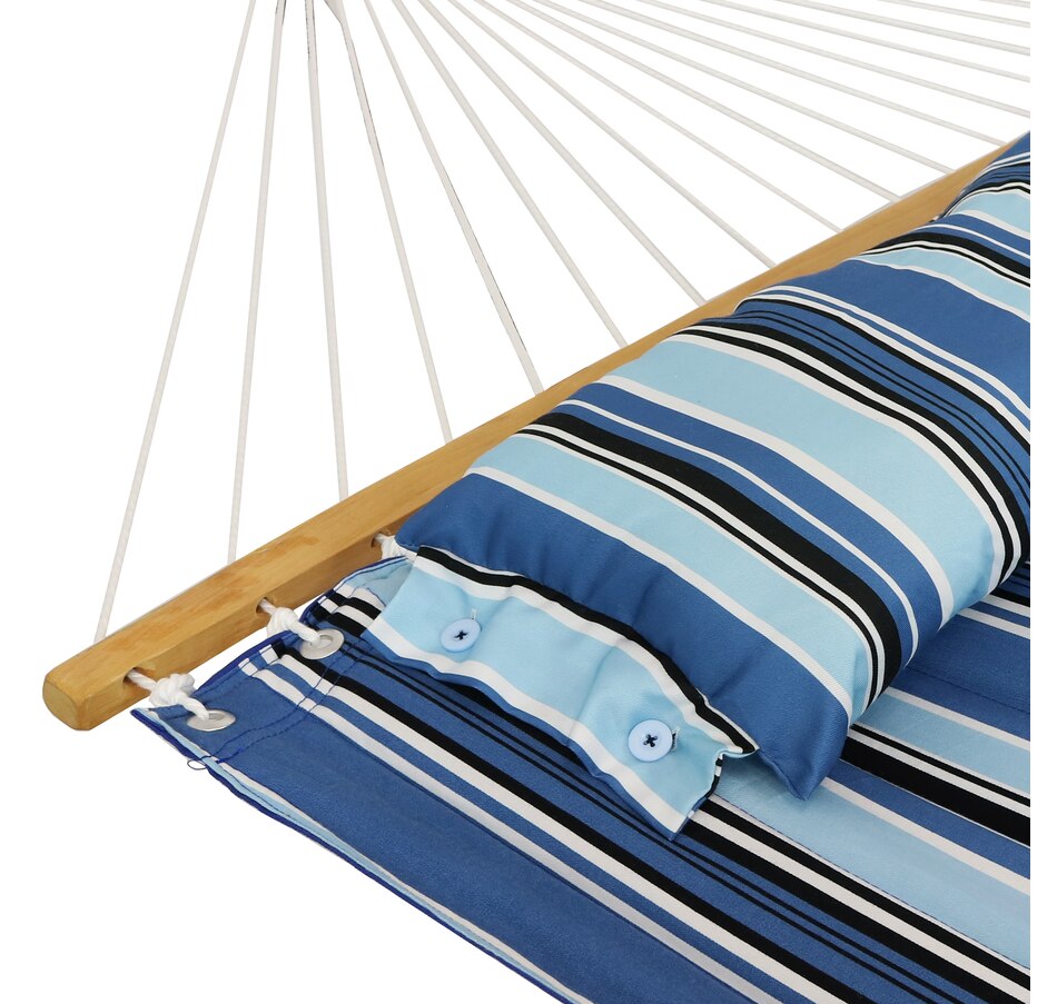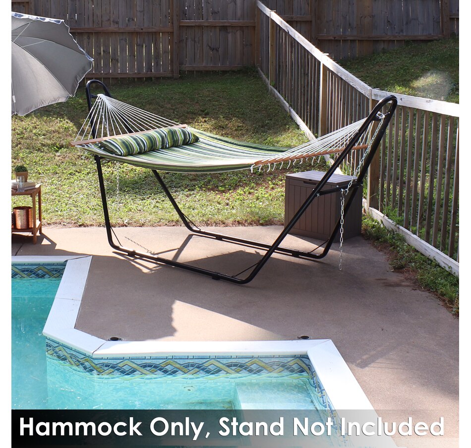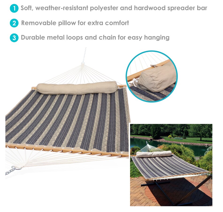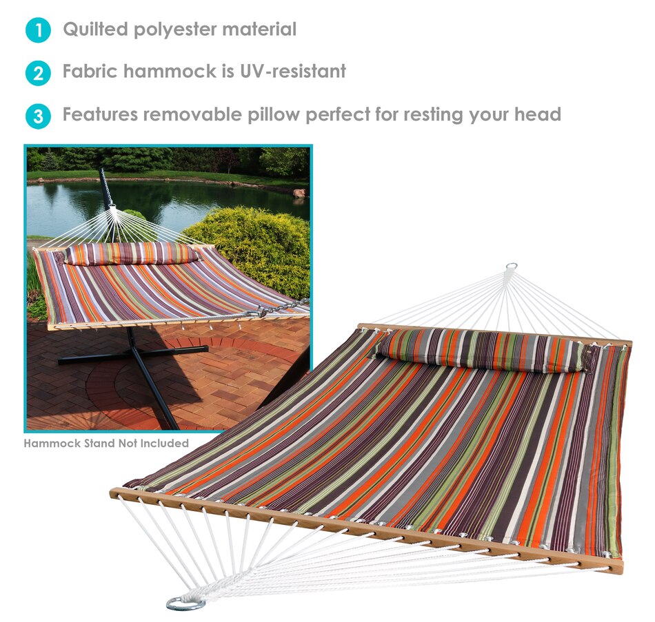Bring comfort and style to any yard, patio, deck, front porch, campsite, or any other outdoor space with this quilted hammock! The hammock includes a detachable pillow (that attaches with buttons) for a comfortable postiion when napping or relaxing after a long day. Simply hang the hammock between trees, posts, or on a 12' to 15' hammock stand (stand not included). This 2-person hammock is made from a durable polyester material that is dye-treated to make it UV resistant, ensuring outdoor relaxation for years.