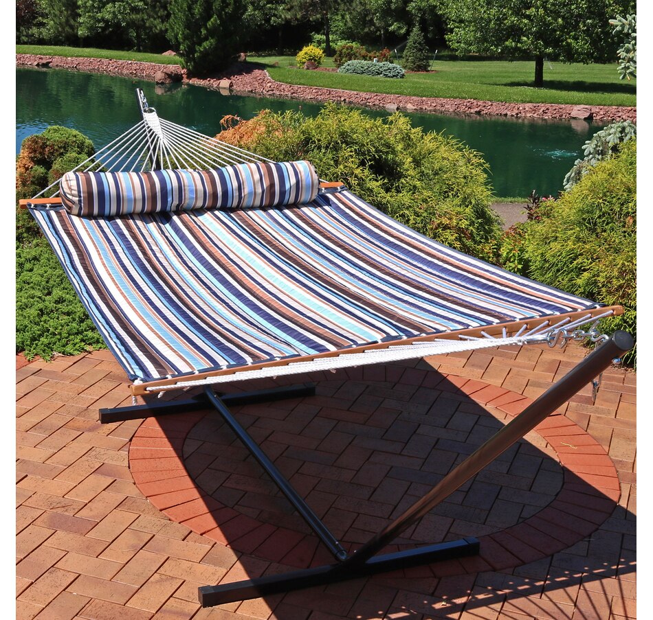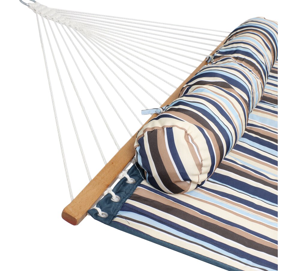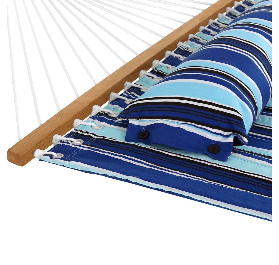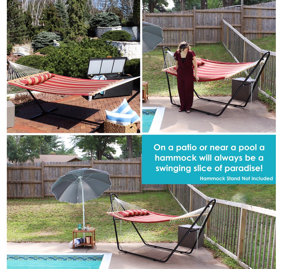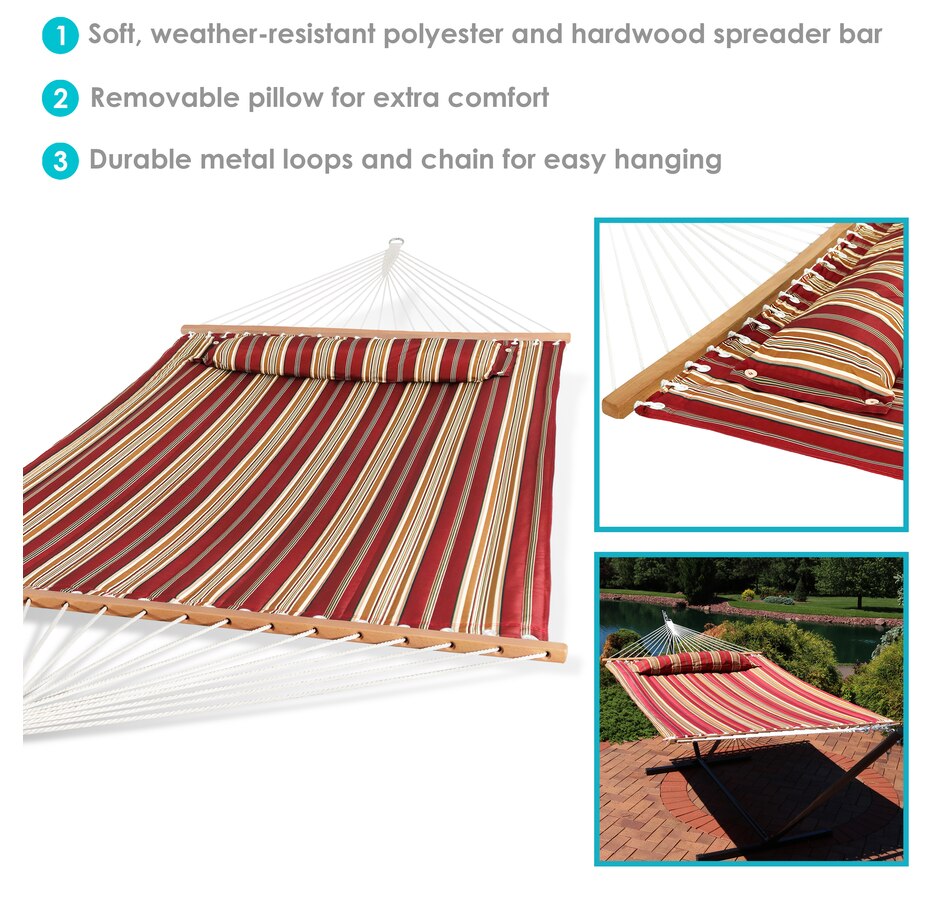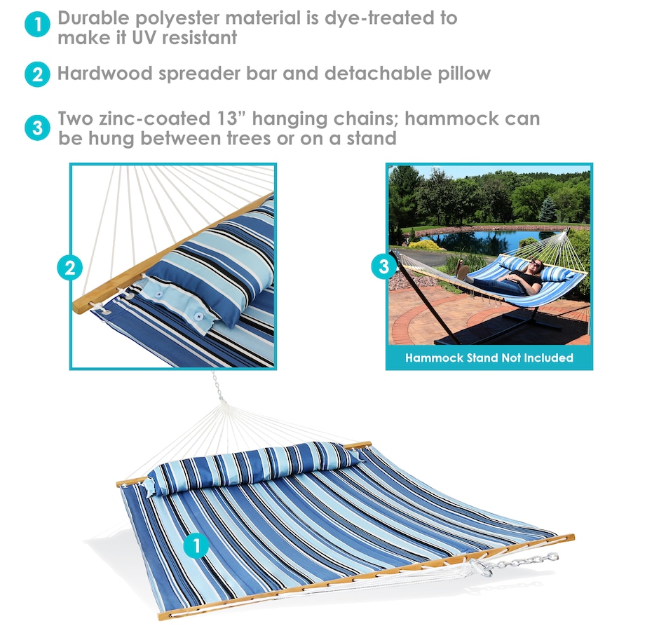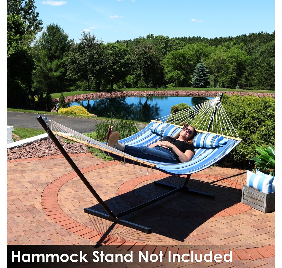 Bring comfort and style to any yard, patio, deck, front porch, campsite, or any other outdoor space with this quilted hammock! The hammock includes a detachable pillow (that attaches with buttons) for a comfortable postiion when napping or relaxing after a long day. Simply hang the hammock between trees, posts, or on a 12' to 15' hammock stand (stand not included). This 2-person hammock is made from a durable polyester material that is dye-treated to make it UV resistant, ensuring outdoor relaxation for years.