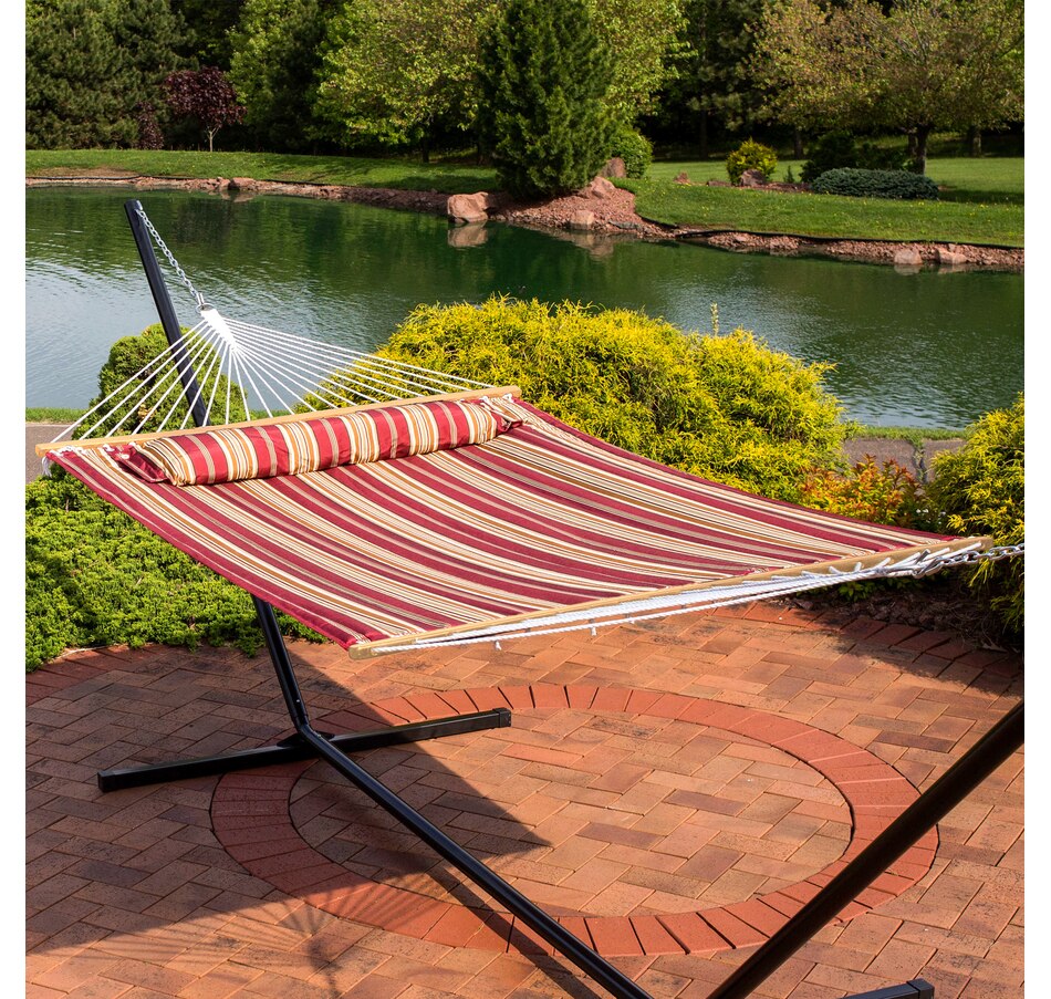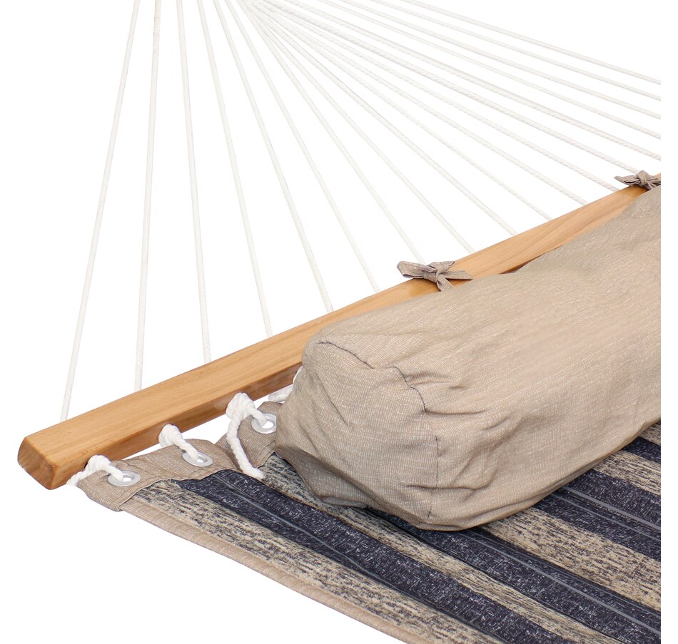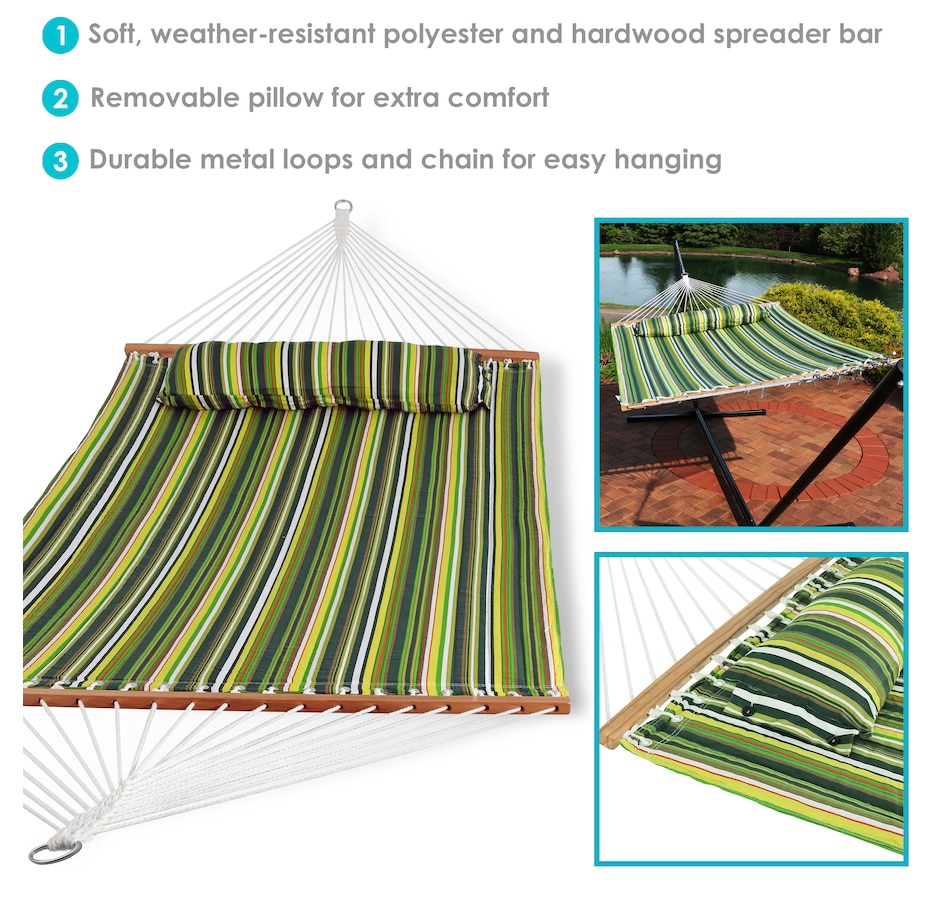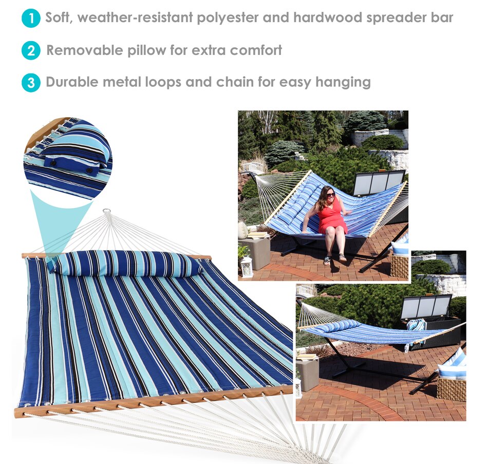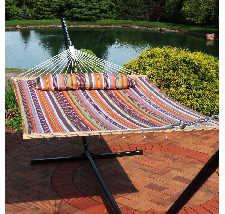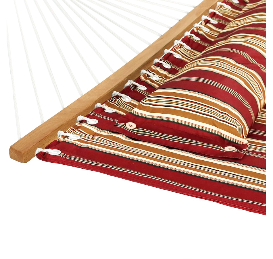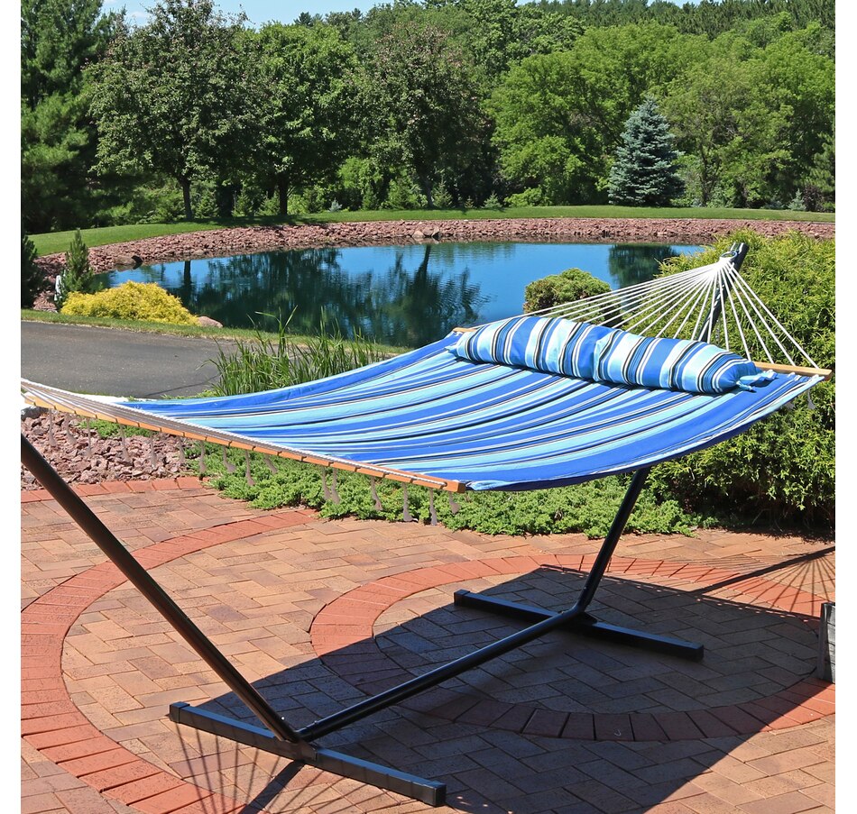 Bring comfort and style to any yard, patio, deck, front porch, campsite, or any other outdoor space with this quilted hammock! The hammock includes a detachable pillow (that attaches with buttons) for a comfortable postiion when napping or relaxing after a long day. Simply hang the hammock between trees, posts, or on a 12' to 15' hammock stand (stand not included). This 2-person hammock is made from a durable polyester material that is dye-treated to make it UV resistant, ensuring outdoor relaxation for years.