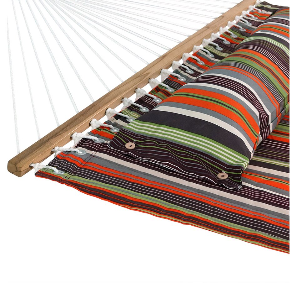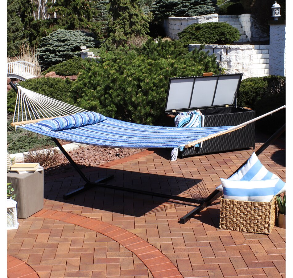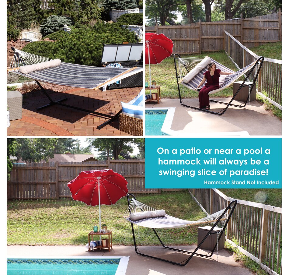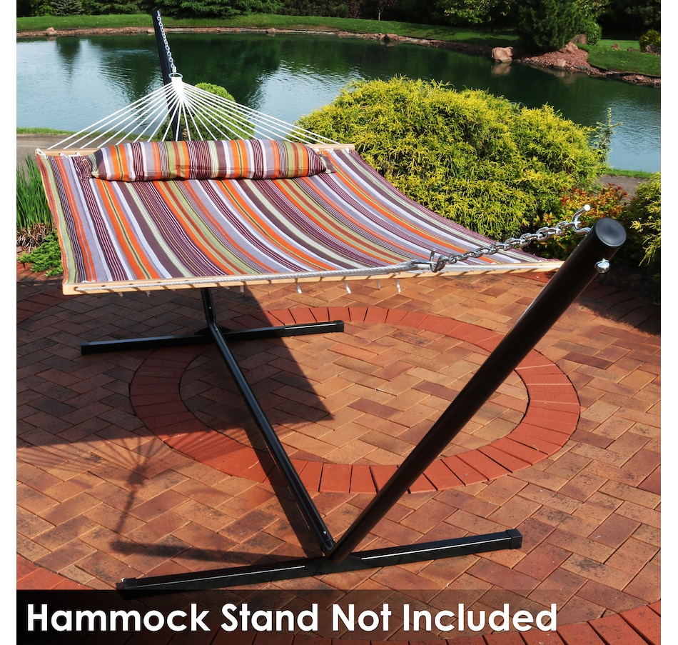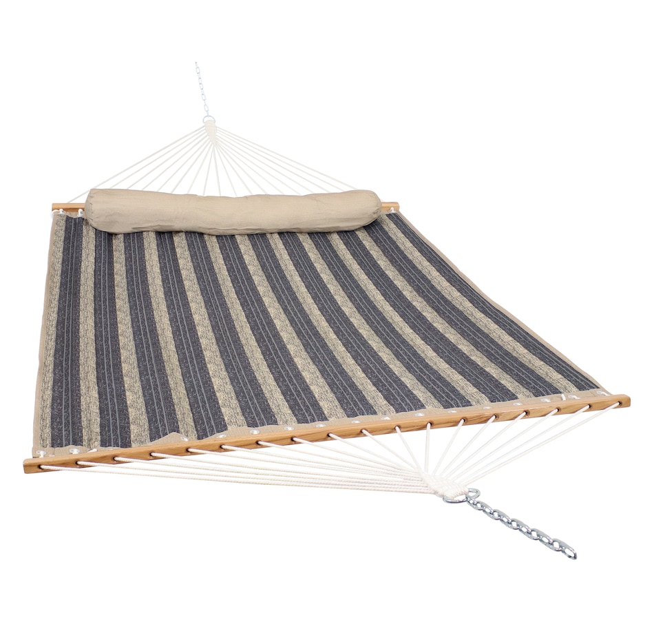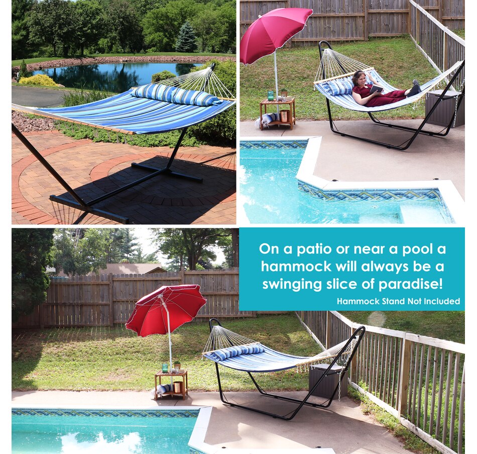 Bring comfort and style to any yard, patio, deck, front porch, campsite, or any other outdoor space with this quilted hammock! The hammock includes a detachable pillow (that attaches with buttons) for a comfortable postiion when napping or relaxing after a long day. Simply hang the hammock between trees, posts, or on a 12' to 15' hammock stand (stand not included). This 2-person hammock is made from a durable polyester material that is dye-treated to make it UV resistant, ensuring outdoor relaxation for years.