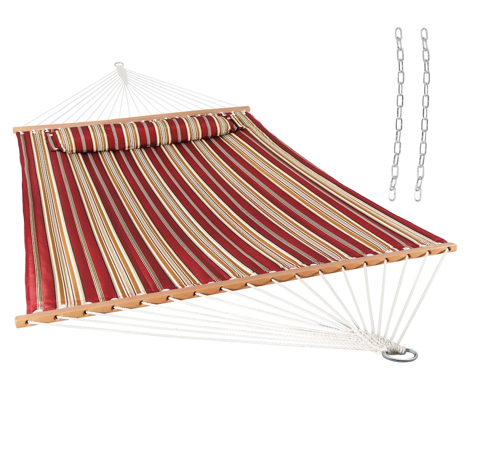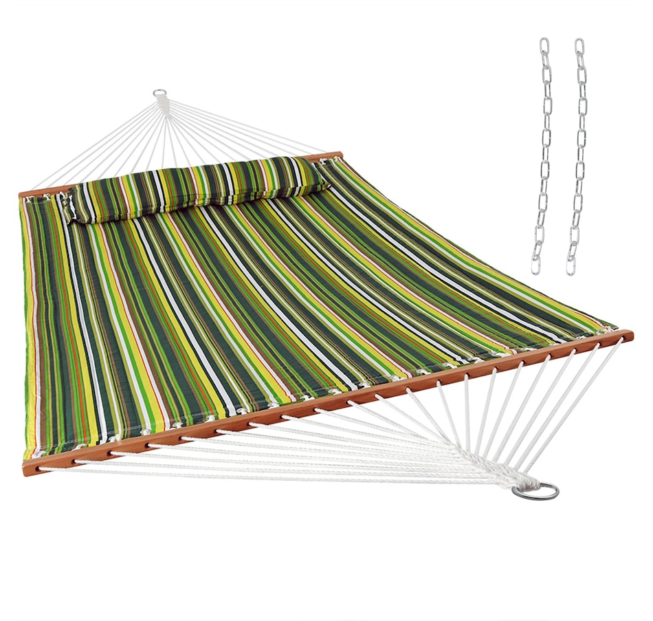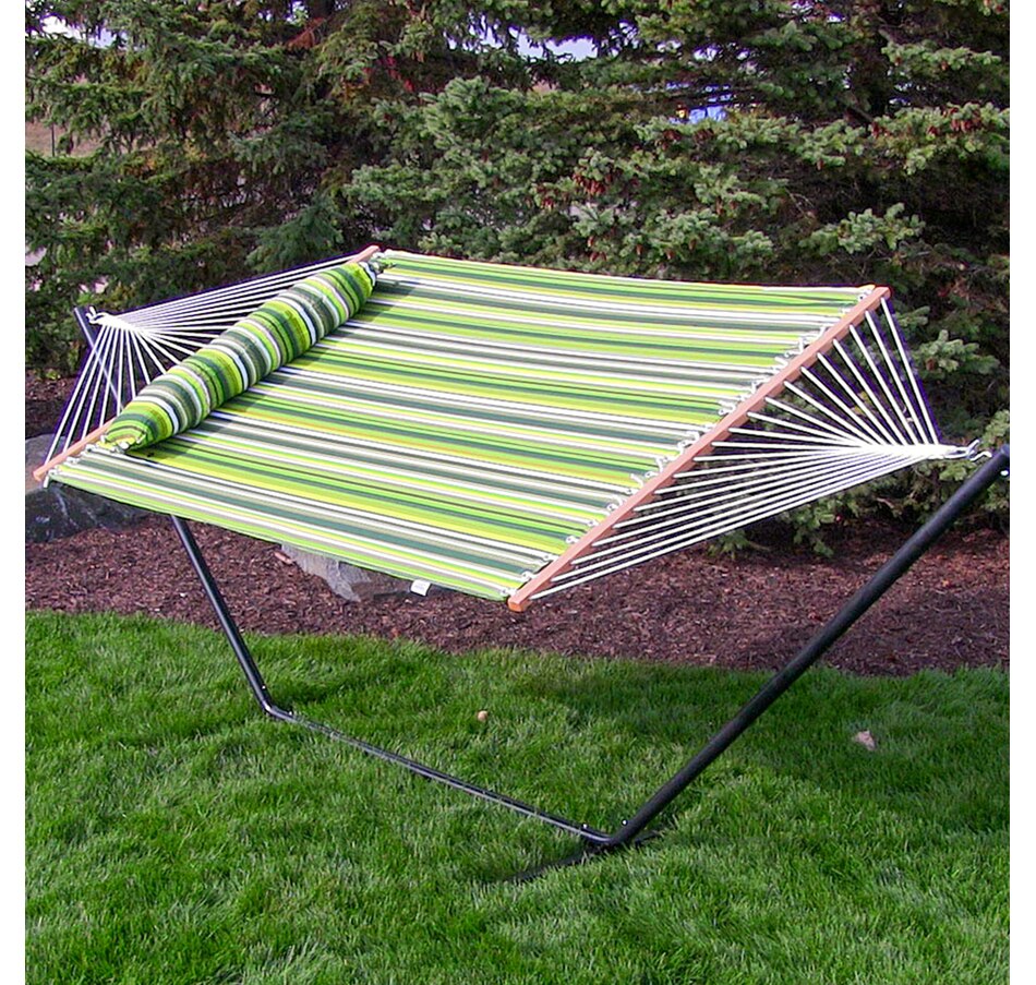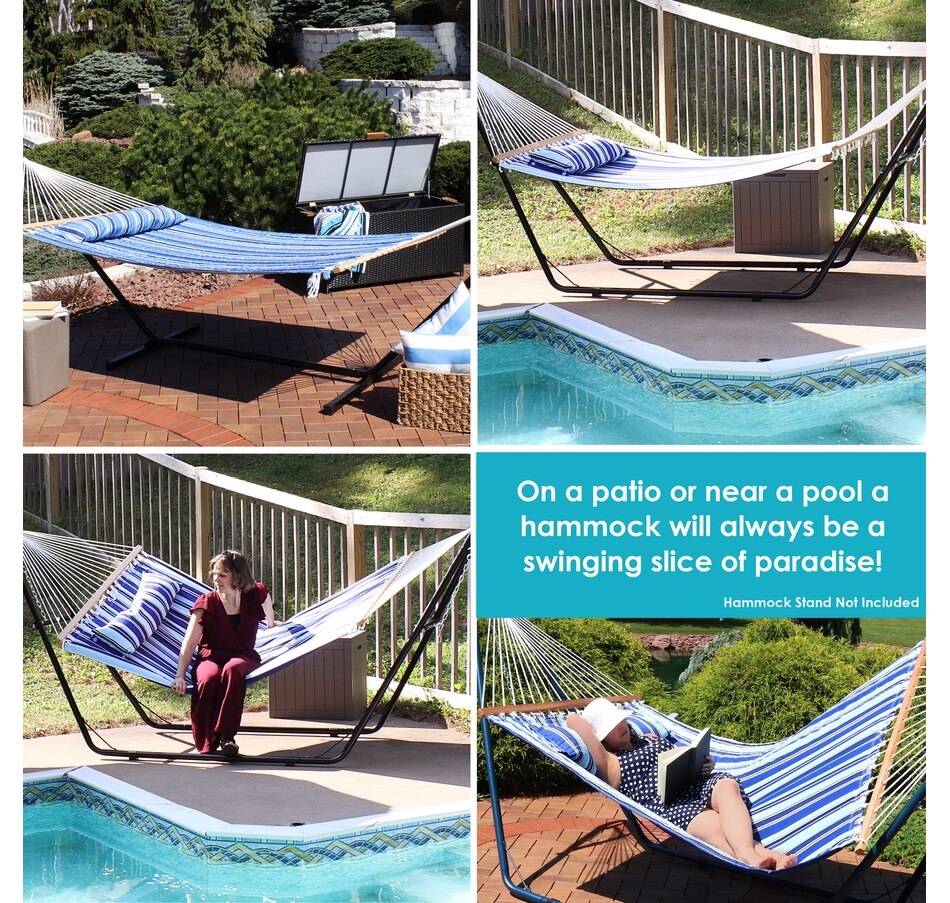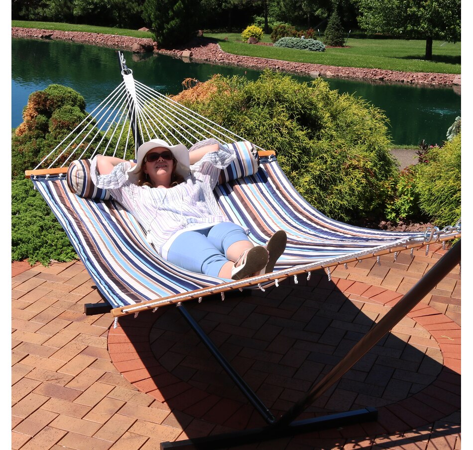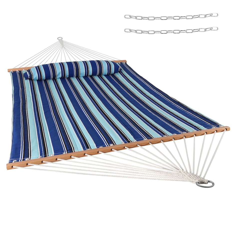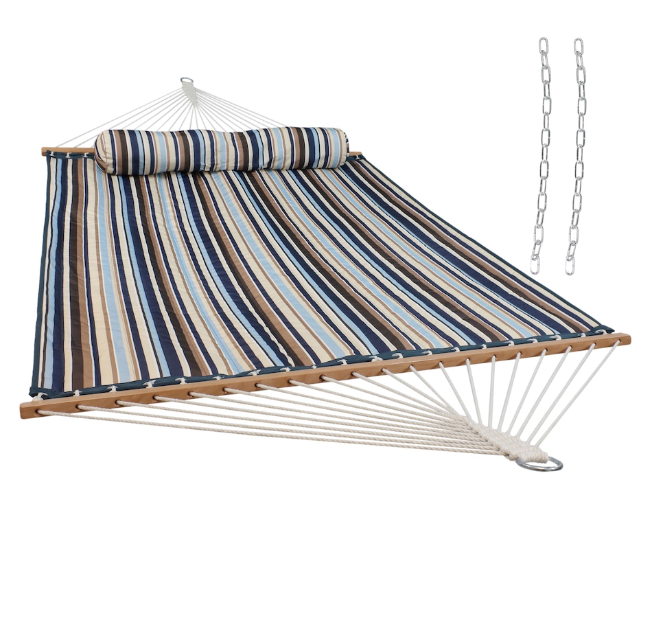 Bring comfort and style to any yard, patio, deck, front porch, campsite, or any other outdoor space with this quilted hammock! The hammock includes a detachable pillow (that attaches with buttons) for a comfortable postiion when napping or relaxing after a long day. Simply hang the hammock between trees, posts, or on a 12' to 15' hammock stand (stand not included). This 2-person hammock is made from a durable polyester material that is dye-treated to make it UV resistant, ensuring outdoor relaxation for years.